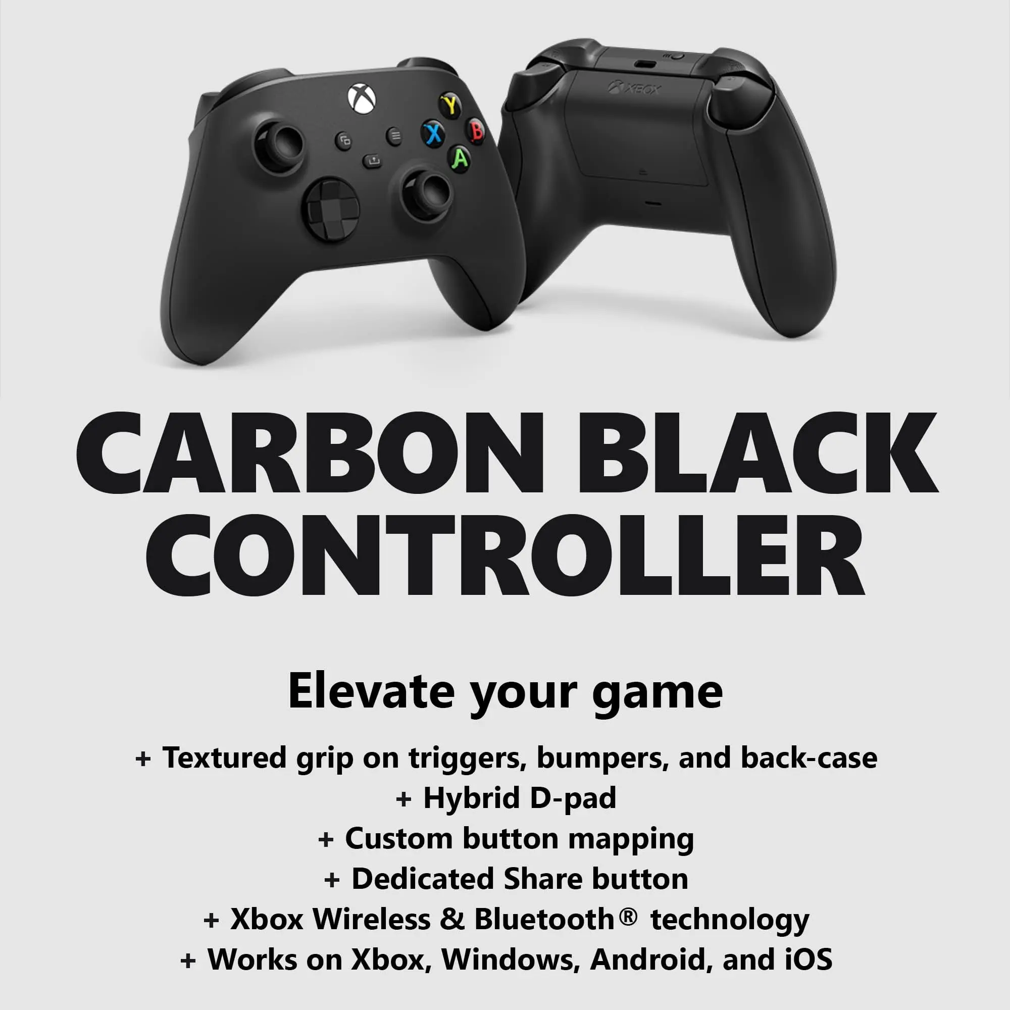 Details: Experience the modernized design of the Xbox Wireless Controller in Carbon Black, featuring sculpted surfaces and refined geometry for enhanced comfort during gameplay with battery usage up to 40 hours. Stay on target with a hybrid D-pad and textured grip on the triggers, bumpers, and back-case. Seamlessly capture and share content such as screenshots, recordings, and more with the Share button. Connect using the USB-C port for direct plug and play to console and PC. Support for AA batteries is included on the rear. Plug in any compatible headset with the 3.5mm audio jack. Use the Xbox Accessories app to remap buttons and create custom controller profiles for your favorite games. Quickly pair with, play on, and switch between devices including Xbox Series X|S, Xbox One, Windows 10 PCs, and Android. iOS support coming in the future. *Important information: Compatible with select devices and operating system versions; learn more at xbox.com/controller-compatibility. Battery life varies significantly with headsets, additional accessories, usage, and other factors. Testing conducted by Microsoft using standard AA batteries in preproduction units. Button mapping available via Xbox Accessories app for Xbox Series X|S, Xbox One, and Windows 10; app for Windows 10 requires compatible USB-C cable (sold separately). Windows 10: Requires Bluetooth, compatible USB-C® cable, or Xbox Wireless adapter. Each sold separately. Android, iOS, & Bluetooth: Select devices and versions. Some functionality not supported. Software download may be required via Windows PC or console. See xbox.com/controller-compatibility. Use with controller compatible games. You must accept the Warranty & Agreement at xbox.com/warranty and Software License Agreement at xbox.com/slt. Halo Infinite: Expected 2021. The Bluetooth® word mark and logos are registered trademarks owned by Bluetooth SIG, Inc. and any use of such marks by Microsoft Corporation is under license. Other trademarks and trade names are those of their respective owners.