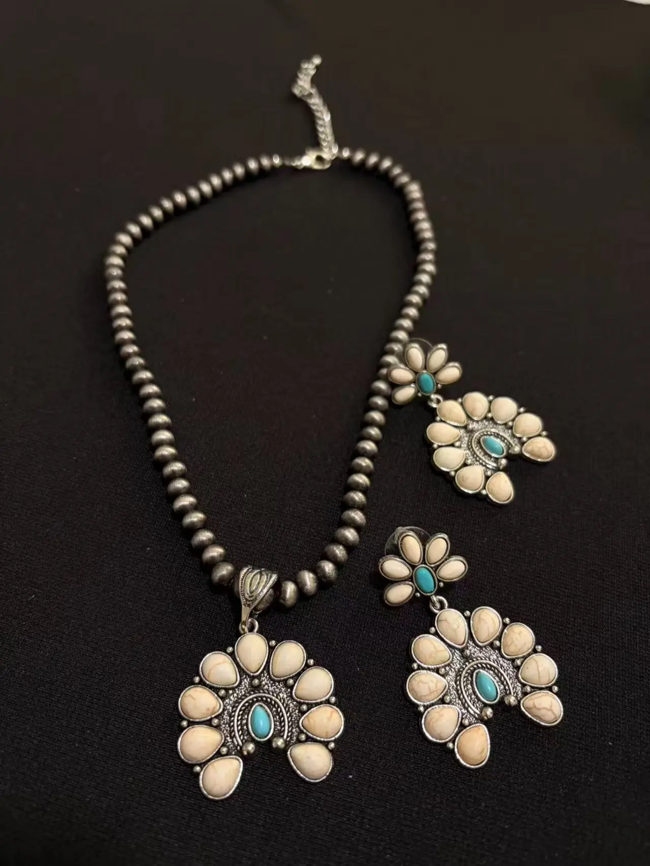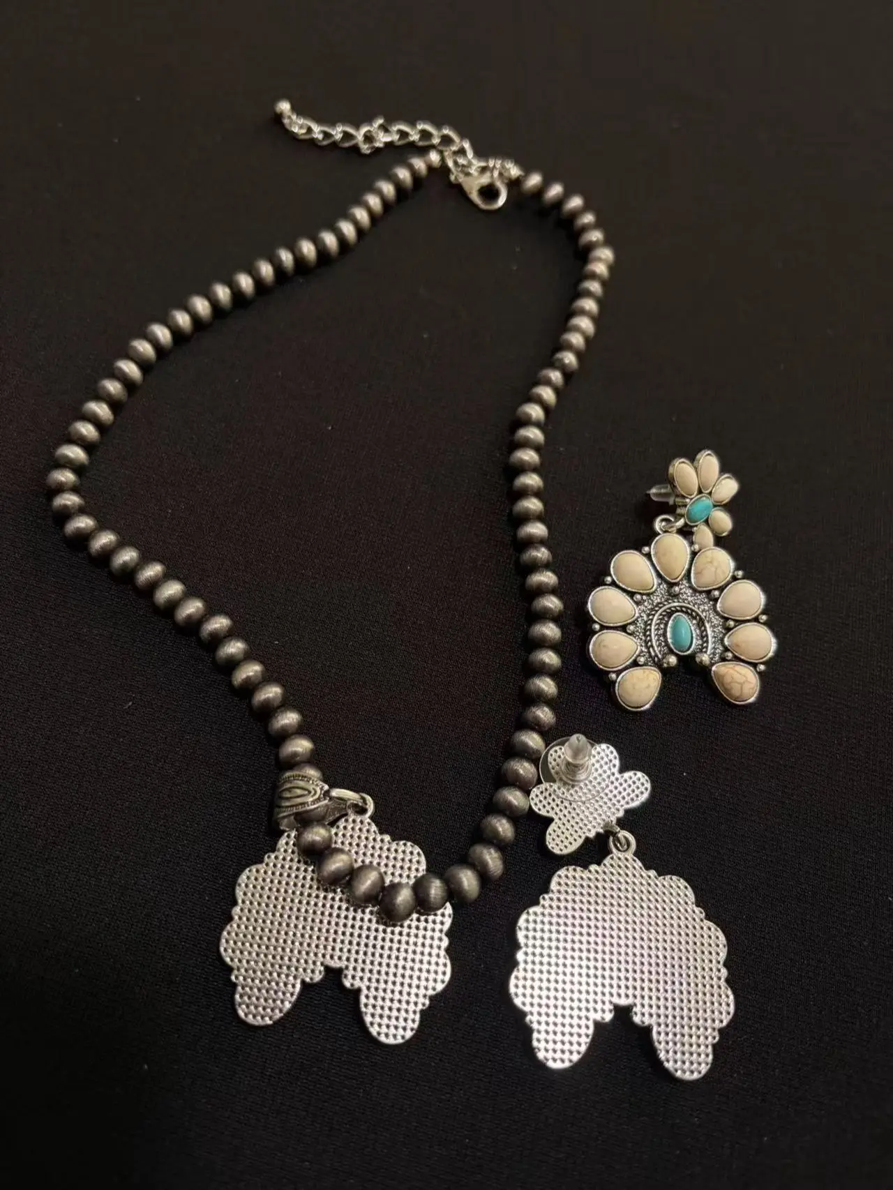 Vintage western-inspired jewelry set featuring a bold pendant necklace with matching earrings. Designed with neutral stone-style accents and silver-tone beaded chain, this set offers a unique statement look. Perfect for casual wear, events, or adding a western touch to any outfit.