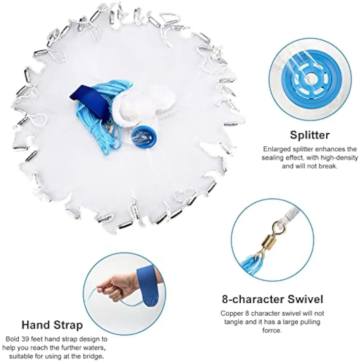 Ideal for Bait Fishing: Whether it is a pond, a river, a shallow sea, etc., the fishing cast net is easy to operate and easy to fish. This fishing cast net is easy to operate and suitable for various water environments