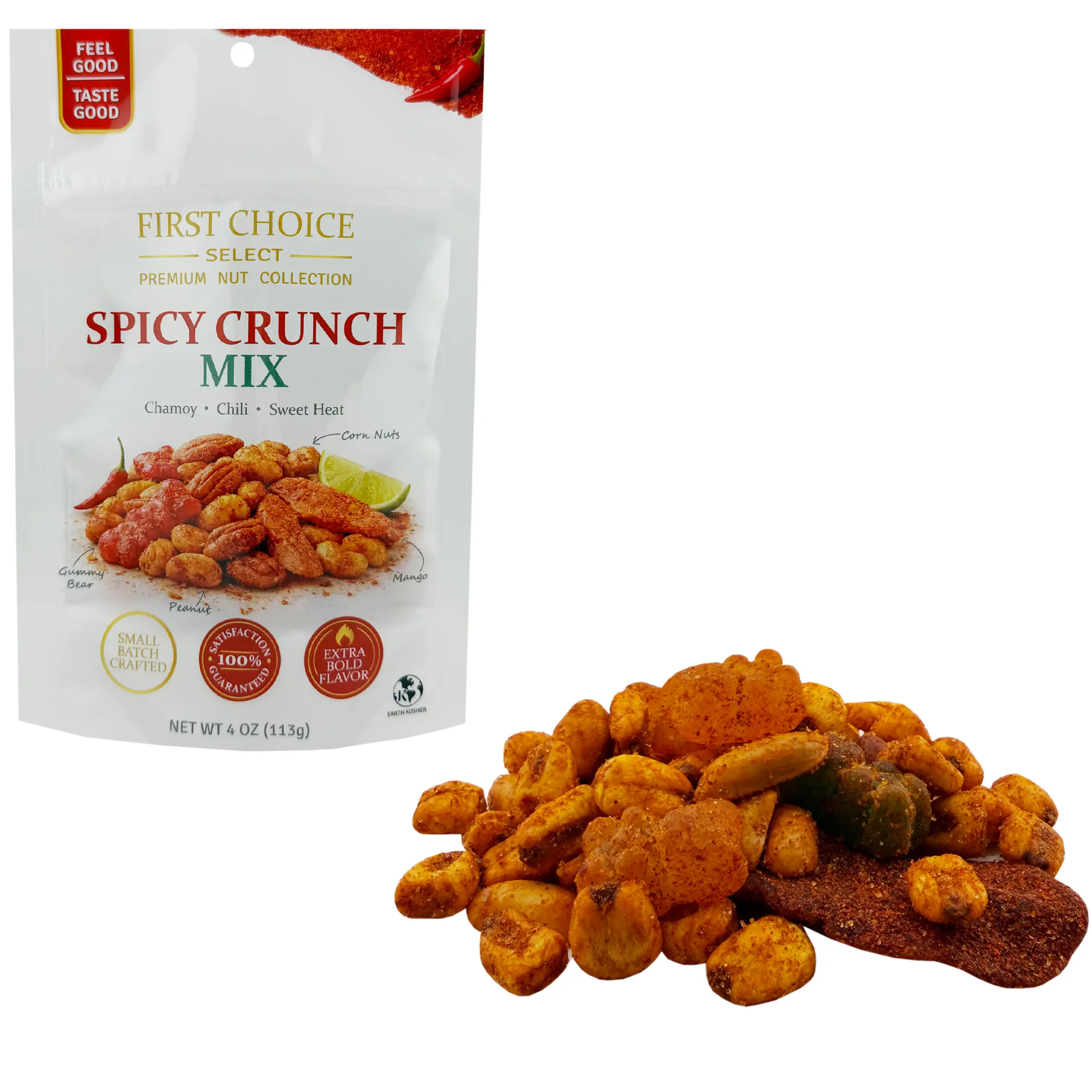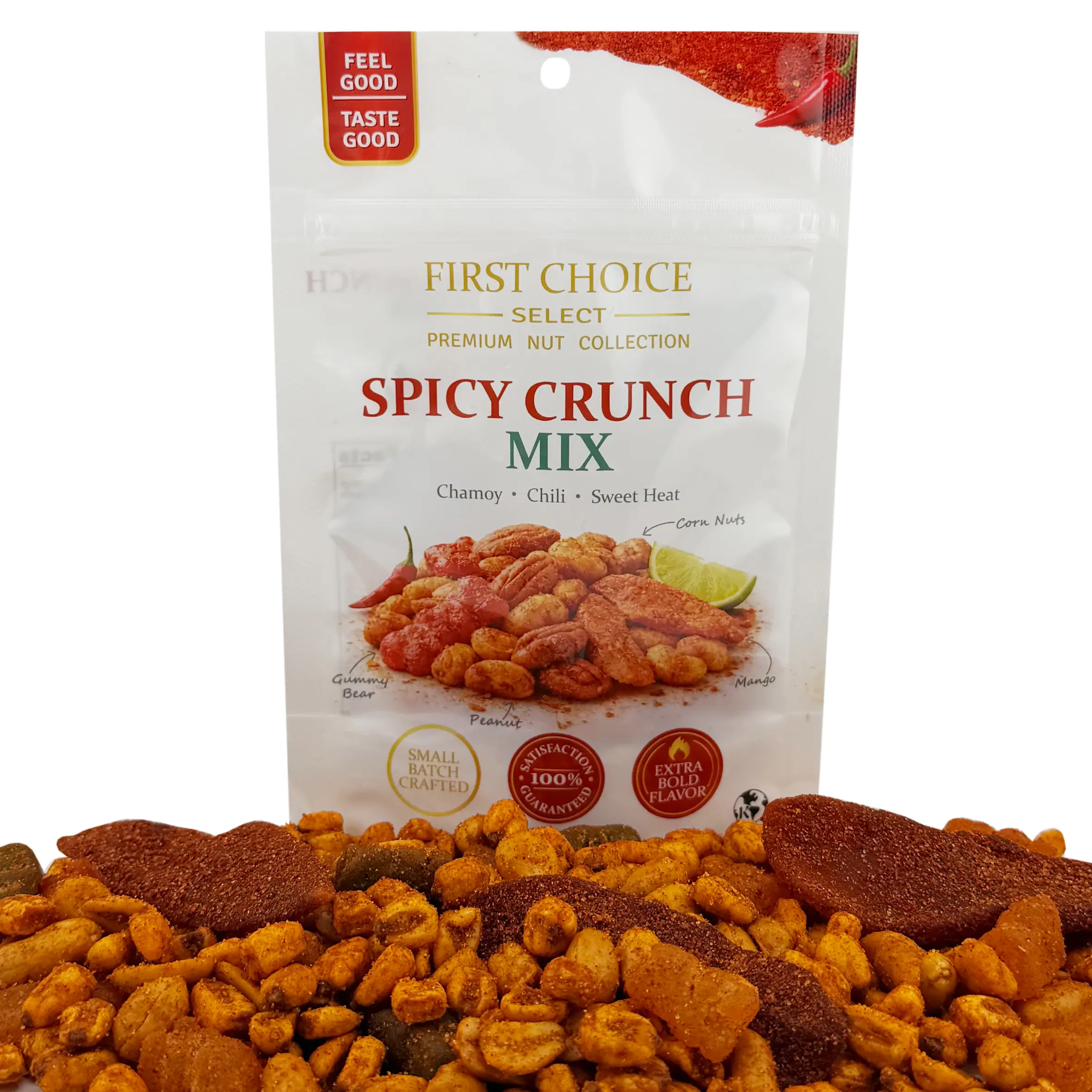First Choice Candy Spicy Crunch Mix, Chamoy Chili Sweet Heat, Peanuts Corn Nuts Mango, Gummy Bears, 4 oz Resealable Bag (PACK OF 3)