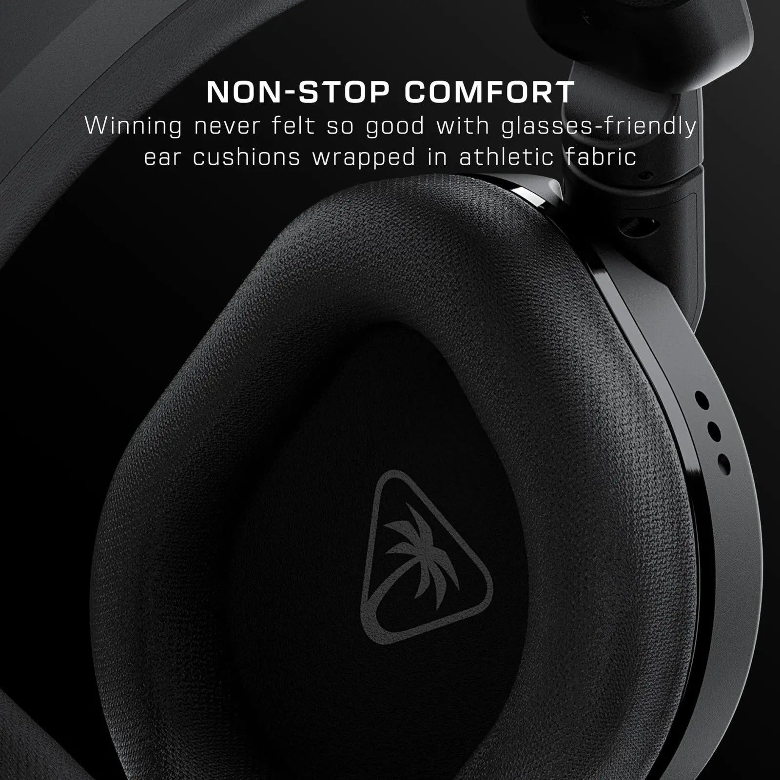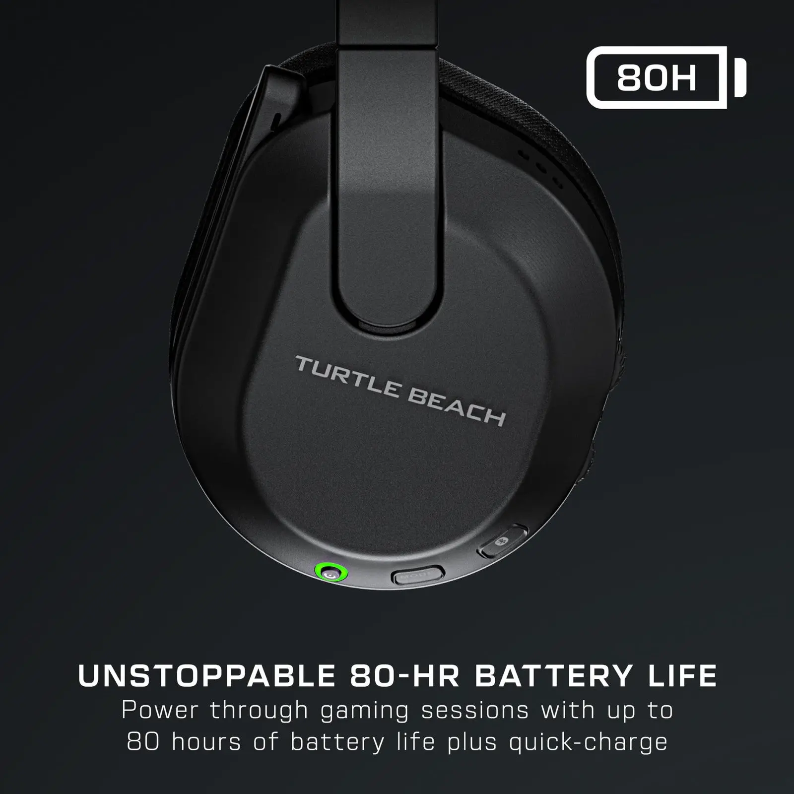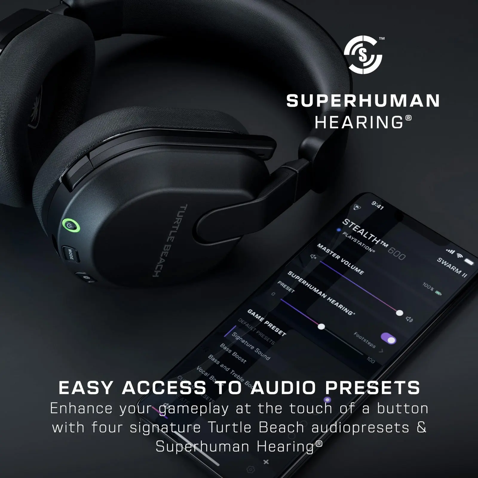The Turtle Beach® Stealth™ 600 wireless multiplatform gaming headset for PS5™& PS4™, Windows PCs, Steam Deck™ and mobile is refreshed and powered up for athird generation of gaming domination. With a history atop the wirelessconsole headset charts, the Stealth™ 600 enters its 3rd Generation, but isjust getting started. Experience low-latency wireless connectivity on anyconsole & PC, plus built-in Bluetooth® lets you connect directly to mobiledevices. Plus, switching between 2.4GHz wireless and Bluetooth® connections ismade easy using the QuickSwitch button located conveniently on the headset. Beunstoppable with a best-in-class, 80-hour battery life featuring quick chargeso you can get back in the game right away. Completely redesigned for theStealth™ 600, the all-new uni-directional, flip-to-mute microphone featuresA.I. noise reduction to ensure ultra-clear mic quality with the quietestbackground possible. Using the Swarm™ II desktop software for PC, or mobileapp for iOS & Android devices, adjust noise gate, sensitivity, monitoringlevels, and choose from four different mic presets, or even make your own witha custom 10-band microphone EQ. Clear comms are nothing if you can’t hearevery vital game detail, so the Stealth™ 600 is packed with the legendary 50mmNanoclear™ drivers for precise, immersive spatial audio quality. And with theSwarm™ II app, you can cycle through four audio EQ presets, create up to fivecustom presets with a 10-band EQ, adjust game & chat volume mix, plusactivate, or adjust Turtle Beach® exclusive Advanced Superhuman Hearing® soundsetting. Play for hours in total comfort with a pressure-relieving, ultra-comfortable design. Memory foam ear cushions wrapped in athletic-weave fabrickeep your ears cool and cozy over extended game sessions. Plus, the cushionsfeature ProSpecs™ glasses relief technology, so whether you wear gaming orprescription glasses, you’ll enjoy the same great comfort. For addedcustomization, you can remap the secondary wheel & mode button on the headsetto distinct functions to better suit your gameplay. And the Stealth™ 600 isbuilt for long-lasting, comfortable use with an adjustable lay-flatdesign.Multiplatform Wireless + Bluetooth® Experience low-latencymultiplatform freedom with 2.4GHz wireless and Bluetooth® 5.2 on PlayStation®,PC or Steam Deck™, and mobile devices.QuickSwitch Technology Easily switchbetween 2.4GHz wireless & Bluetooth® connections with the built-in QuickSwitchbutton. A simple press of the button switches your audio & chat source betweenwireless & Bluetooth® devices, enabling you to effortlessly transition betweenconnections.Unstoppable, 80-Hour Battery Life Power through gaming sessionswithout worry thanks to a best-in-class 80-hour battery life plus quickcharge.A.I.-Based Mic Noise Reduction Completely redesigned for the thirdgeneration of Stealth 600™, the all-new uni-directional, flip-to-mutemicrophone features A.I. noise reduction to ensure the quietest backgroundpossible. Plus, using the Swarm™ II app for desktop & mobile, you can furtherrefine microphone specs to dial-in your exact preferences.Amplified 50mmNanoclear™ Drivers Unlock gaming audio detail like you’ve never heard beforewith precision-tuned 50mm Nanoclear™ drivers. Optimized for spatial audio onPlayStation® & PC, you’ll hear vibrant audio quality, as the game was intendedto sound.Anywhere Audio Customization Connect to the Swarm™ II companion appfor PC, iOS, or Android to access a 10-band audio EQ, audio & microphonepresets, program the mappable wheel and mode button and more. Plus, you canupdate the firmware easily using the Swarm™ II app to ensure your Stealth™ 600is always up to date. Select advanced audio features available in 2.4GHzWireless mode may not be supported in Bluetooth® mode.Advanced 10-Band EQ andMicrophone Enhancements The Swarm™ II app for desktop & mobile gives you theability to dial-in the perfect sound for inbound game audio and outbound chatwith a dynamic 10-band EQ and up to five custom presets. Take your audiocontrol to another level and design custom EQs, specific to the type of gameyou’re playing, and adjust microphone sensitivity, noise gate, monitoringlevels and more all directly from the Swarm™ II app.Remappable Wheel & ModeButton Customize your headset with a remappable wheel & mode button that canbe assigned to distinct functions based on your gaming style using the TurtleBeach® Swarm™ II app. Functions for the Mode button include EQ presetselection, multimedia controls on PC, noise gate and chat boost. And thesecondary wheel can be reassigned to control Game/Chat Mix, Variable MicMonitoring, Superhuman Hearing® volume, Bluetooth® volume, Bass & Treble Boostlevels and Noise Gate Threshold.Advanced Superhuman Hearing® AdvancedSuperhuman Hearing® brings the same great battlefield advantage of SuperhumanHearing®, but now with additional adjustability. In the Swarm™ II app, togglebetween three different preset levels and adjust the intensity of SuperhumanHearing®, to dial-in the perfect sound for a wide range of games.Easy Accessto Audio Presets Enhance your gameplay experience at the touch of a buttonwith four Turtle Beach® audio presets including Bass Boost, Signature Sound,Treble Boost, and Vocal Boost.Variable Mic Monitoring Avoid shouting thanks tomic monitoring (or sidetone) which allows you to hear your voice through theheadset and adjust monitoring levels on-the-fly with on-ear controls or in theSwarm™ II app.Non-Stop Comfort Winning never felt so good with a pressurerelieving cushioned headband paired with memory foam ear cushions, wrapped insoft athletic weave fabric. Plus, the cushions feature ProSpecs™ glasses-friendly technology so every gamer can enjoy the same great comfort.Lay-Flat,Adjustable Design Designed for comfort, adjustability and durability, theStealth™ 600 features an adjustable design that lays flat when not inuse.Package Conte