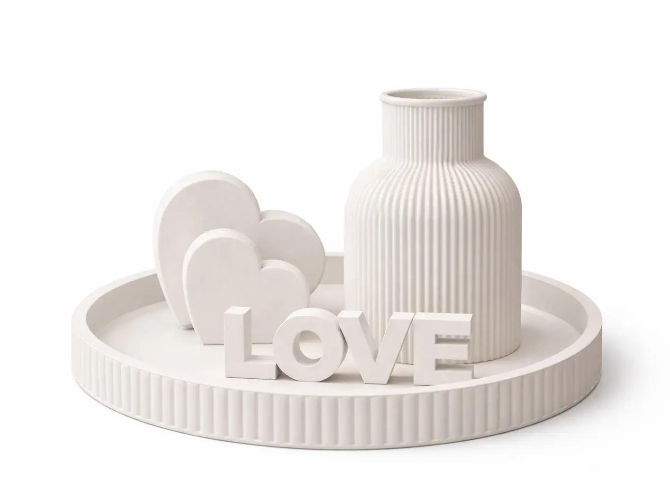 This minimalist tray decor features a ribbed vase, candle holder, decorative arch pieces and HOME lettering arranged on a beautiful textured tray.