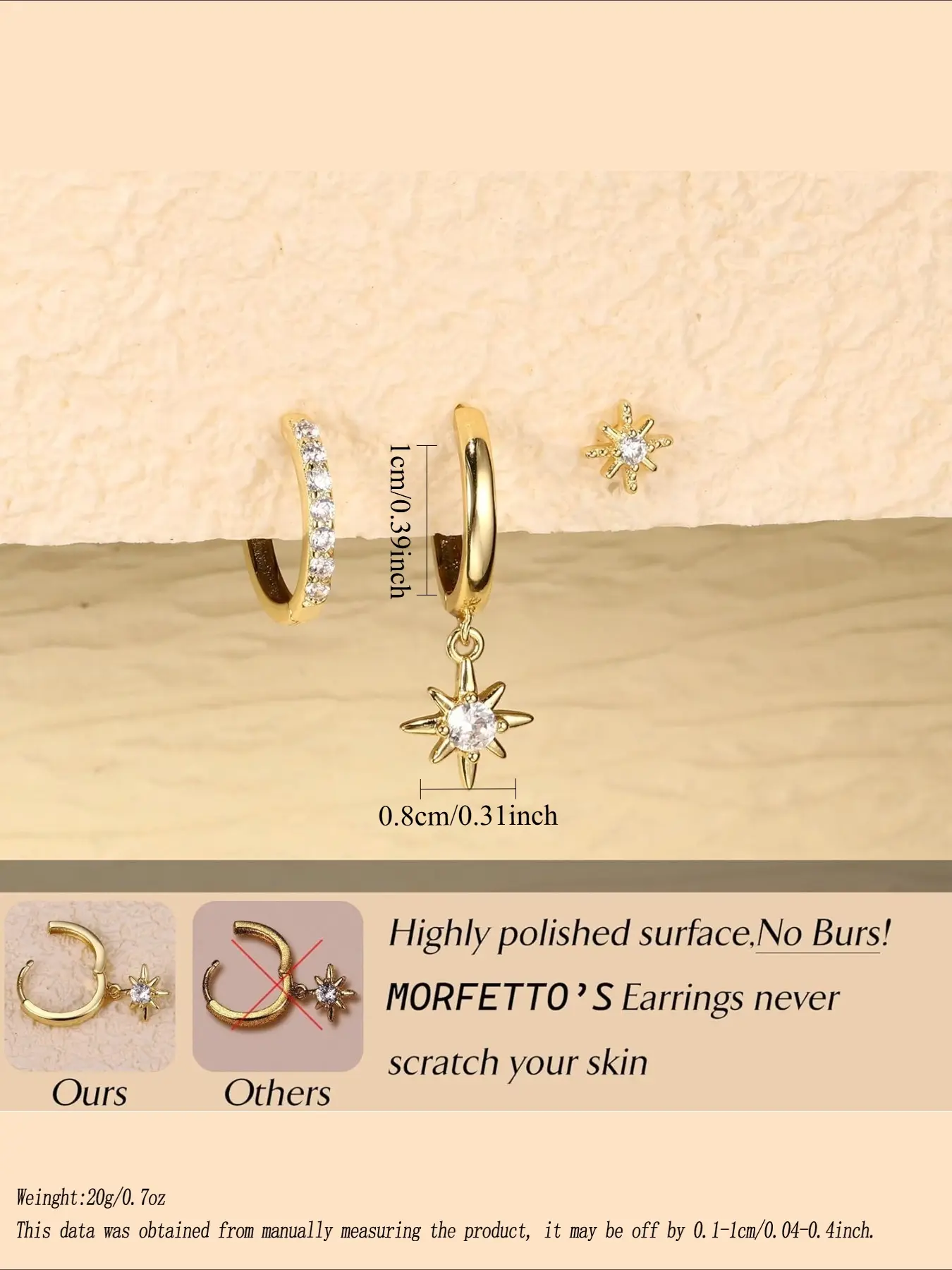 Women's Star Moon Asymmetric Stud Earrings, Hypoallergenic, 14k Plated, Ear Bone Friendly, 3 Pairs, Casual Style