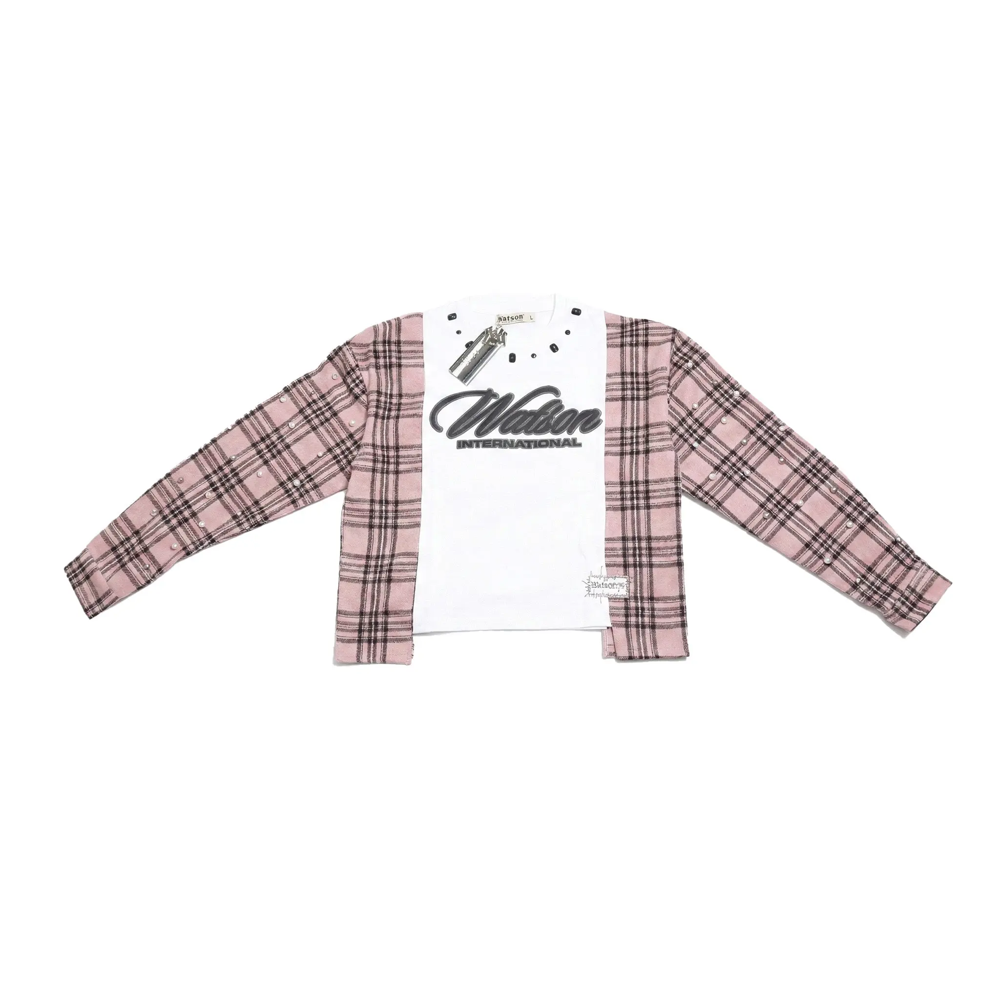 Finished with crystal and pearl embellishments along the sleeves and metal WATSON-branded tags, this piece blends raw utility with refined detail. Designed for those who value individuality, sustainability, and standout design in one elevated statement.