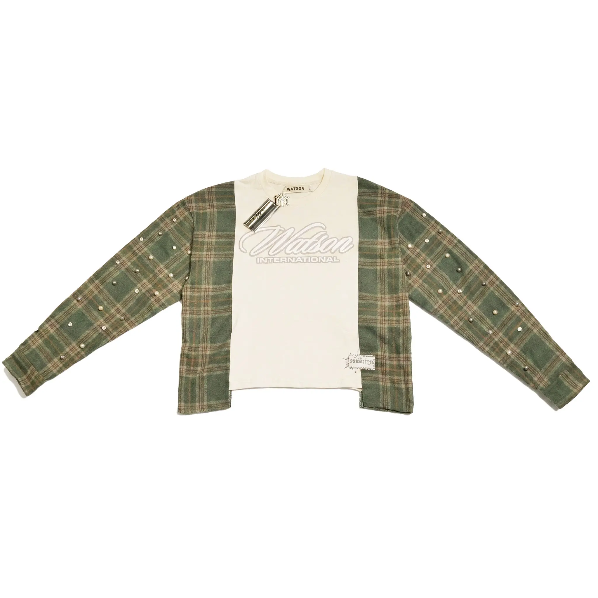 Finished with crystal and pearl embellishments along the sleeves and metal WATSON-branded tags, this piece blends raw utility with refined detail. Designed for those who value individuality, sustainability, and standout design in one elevated statement.