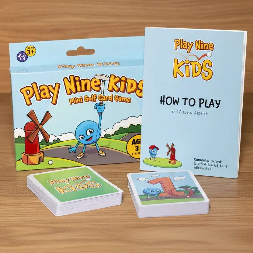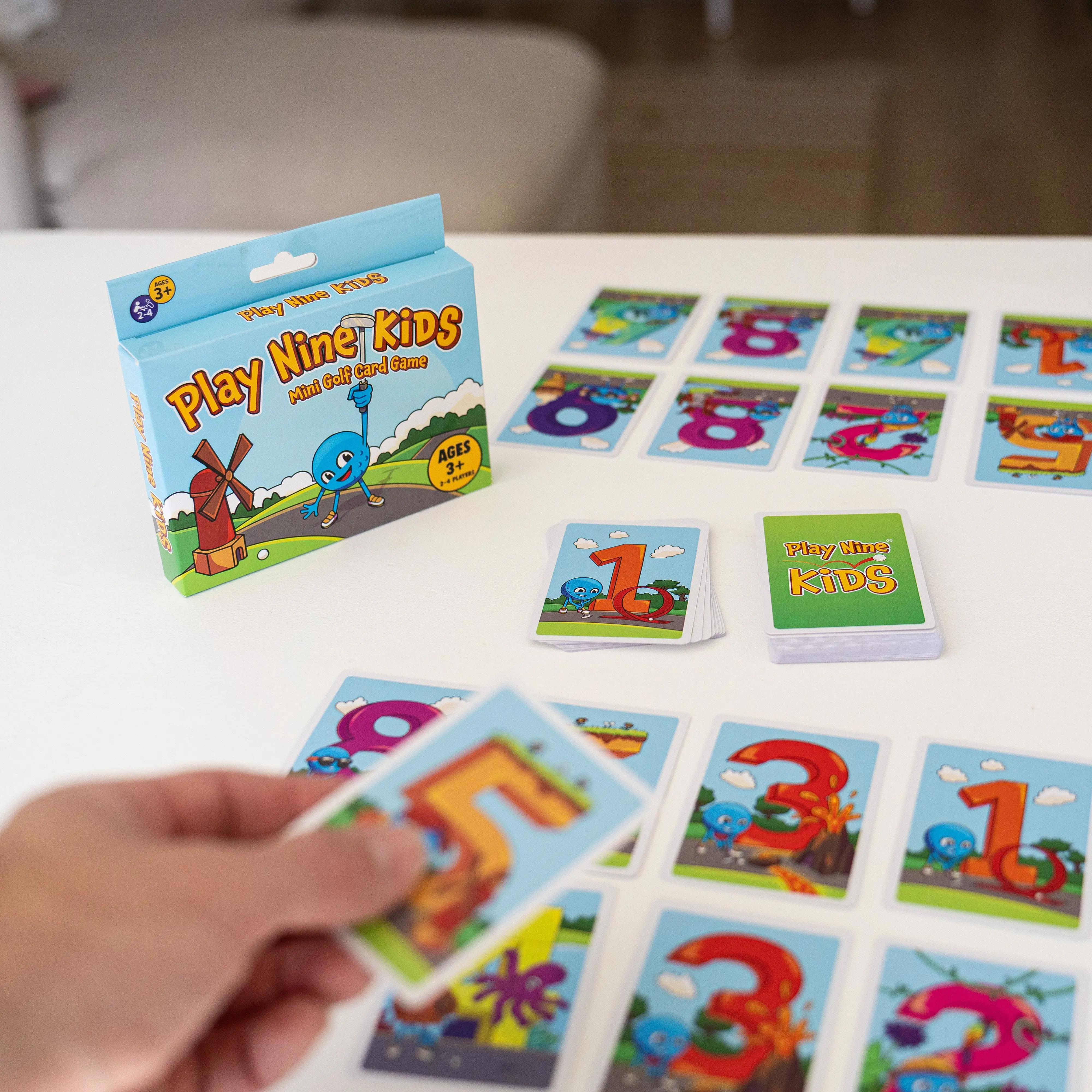 Mini Golf meets Number Matching fun in this exciting, easy-to-play golfing adventure. Kids learn to take turns, match, and build confidence with numbers. Play Nine KiDS is a fast-paced card game that doesn't require reading or holding cards. Get ready to laugh, play, and putt around with Play Nine KiDS!