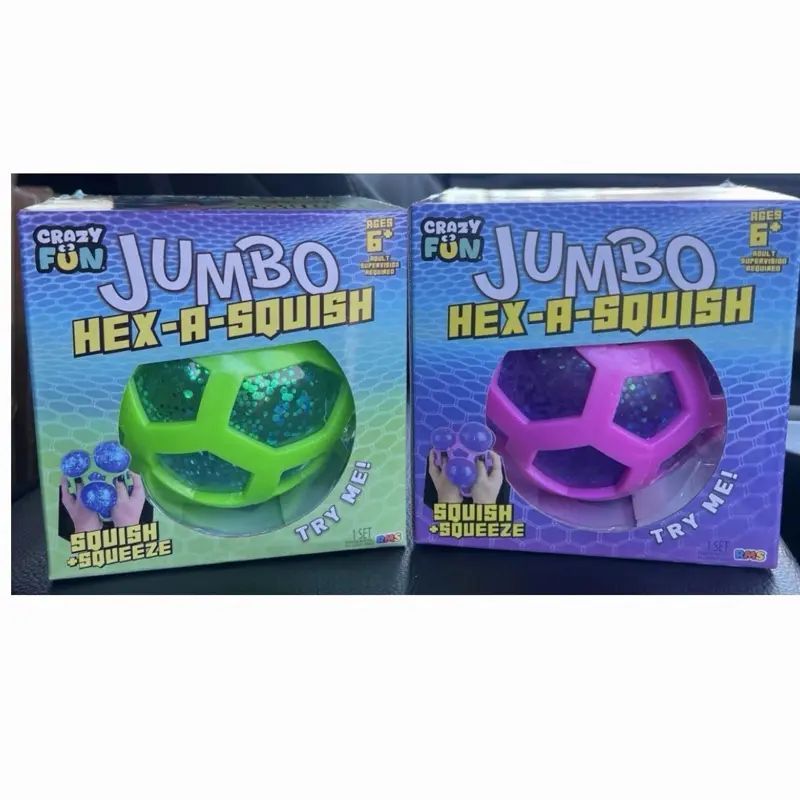 ·The Viral Jumbo Hex-A-Squish ball is a 5-inch, oversized sensory fidget toy featuring a rigid, vibrant pink hexagonal outer cage holding a soft, glittery purple, gel-like interior. It offers a satisfying tactile experience where squeezing causes the inner material to bulge through the honeycomb-like openings.