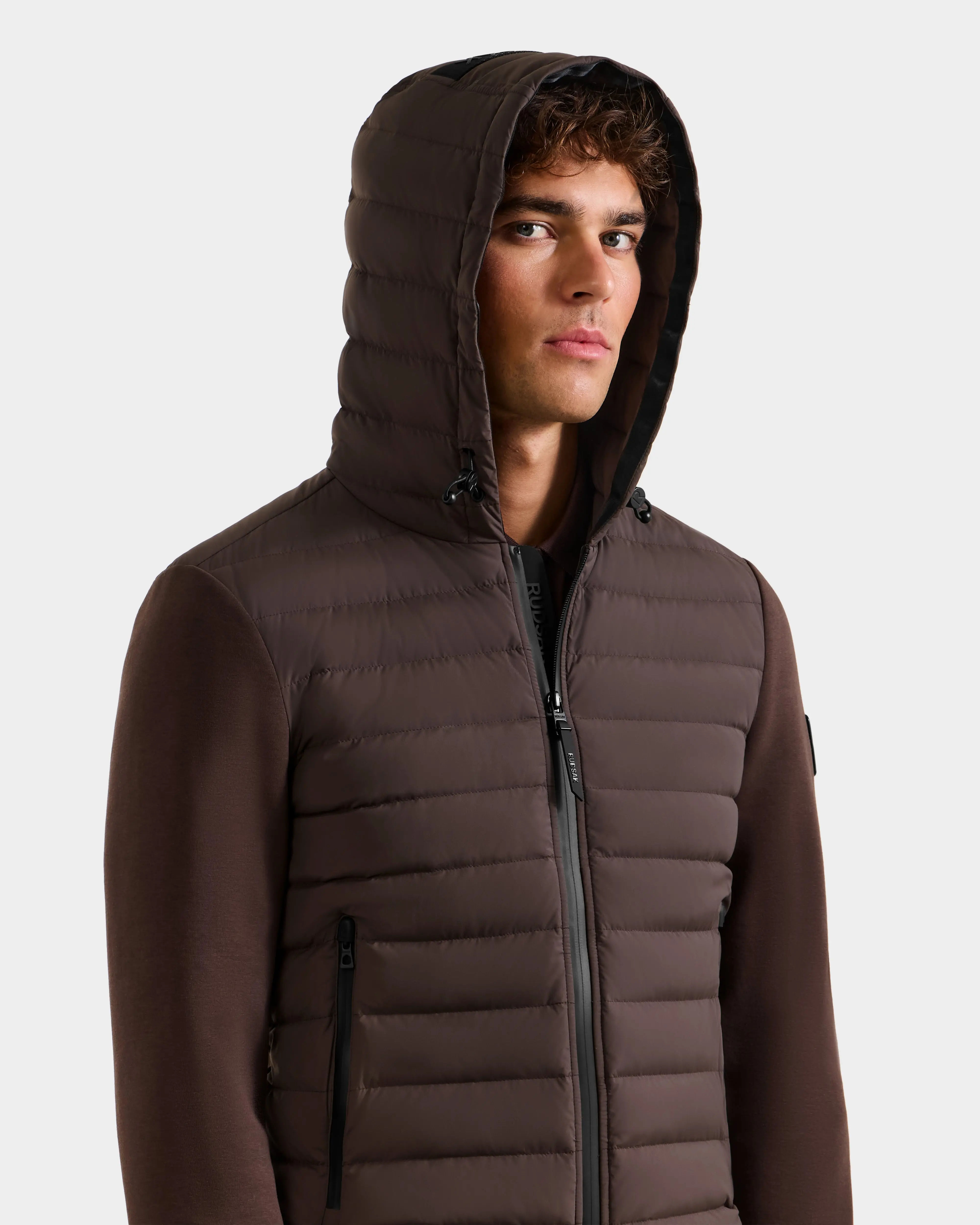 The DEE MAT by RUDSAK is a men's lightweight hybrid down jacket that offers a sleek yet sporty practical design. Crafted from a combo of extra-light fabric, this waist-length jacket features a quilted down front and upper back panel, along with a hood for added warmth. Wind and water-resistant, it includes neoprene detailing on the lower back, hem, and sleeves. Finished with waterproof zippers and RUDSAK branding, it's an essential for any urban wardrobe.