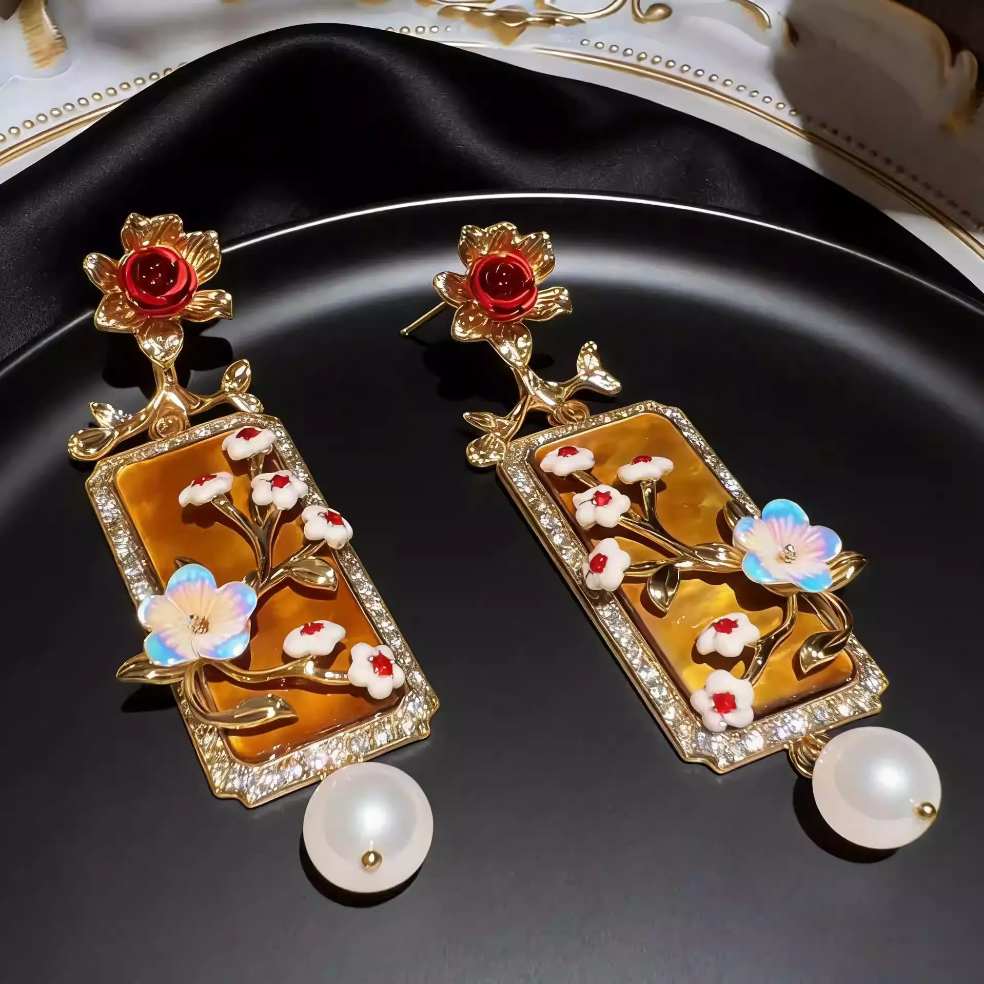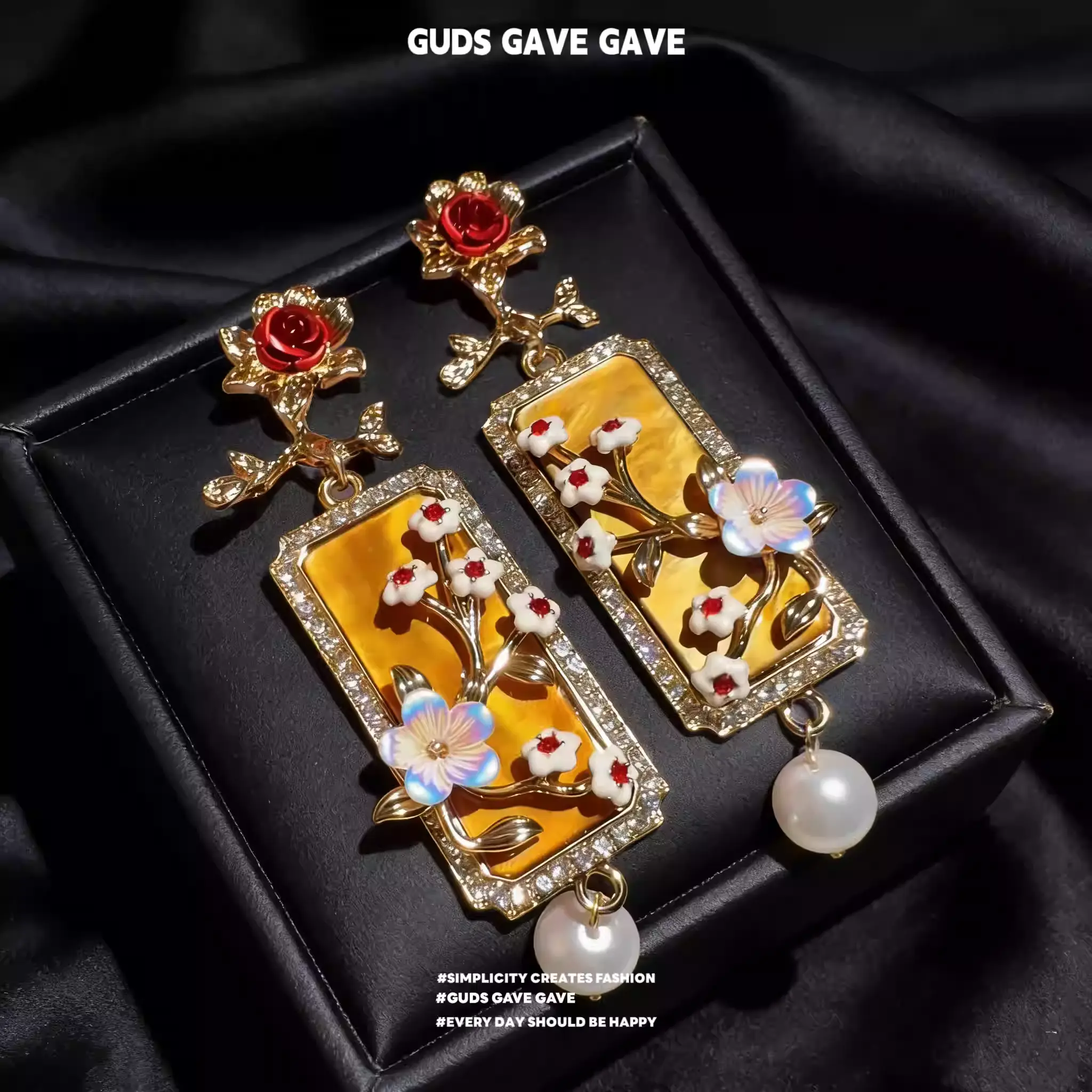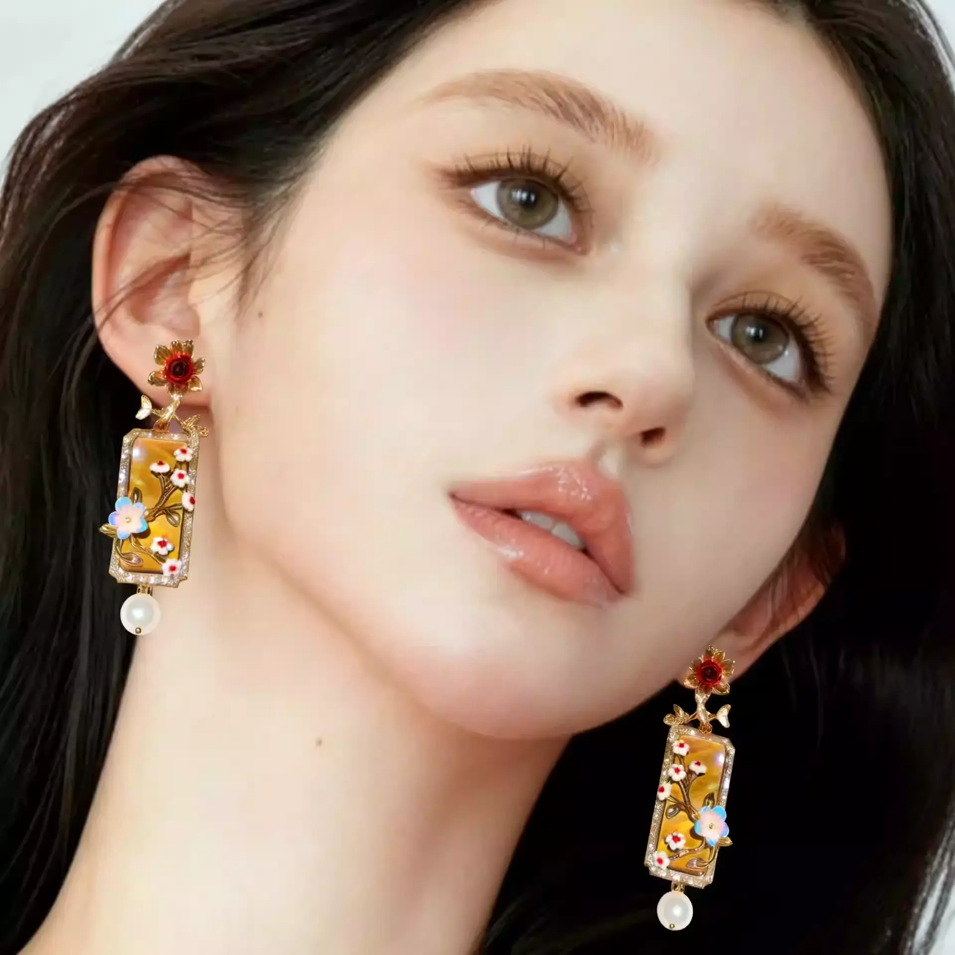 GUDS GAVE Vintage Chinese Palace Style Relief Flower Square Earrings | Exaggerated Heavy Duty Enamel Earrings