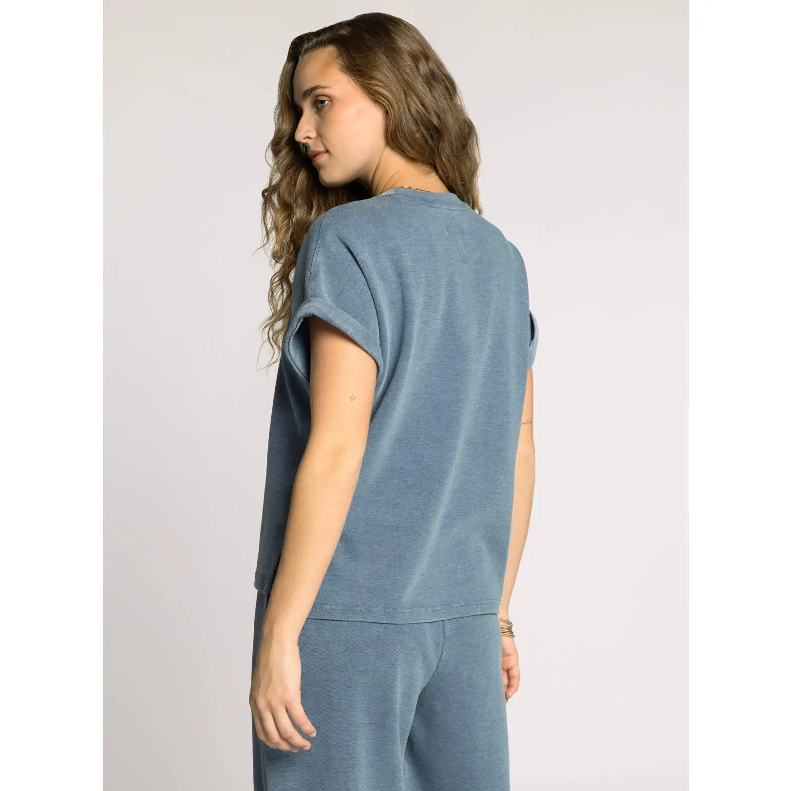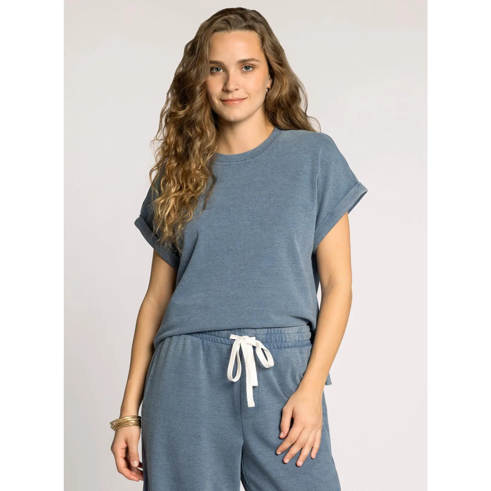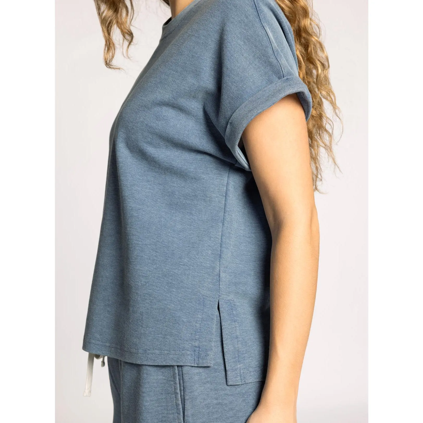 The washed denim blue hue adds a relaxed, lived-in look, while subtle design details—like cuffed sleeves and side vents—bring a modern, laid-back edge. Its versatile silhouette makes it easy to style solo or pair with the matching Nova bottoms for a perfectly coordinated set.