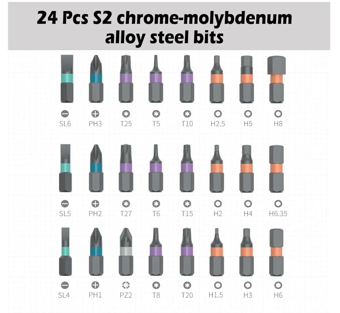 Contains 24 magnetic screwdriver bits, ensuring a firm grip on screws for seamless maintenance experience.