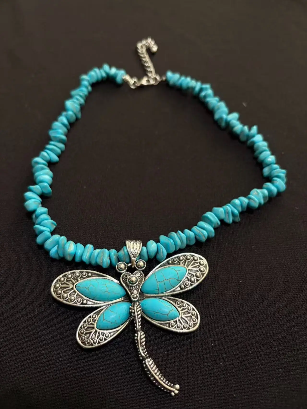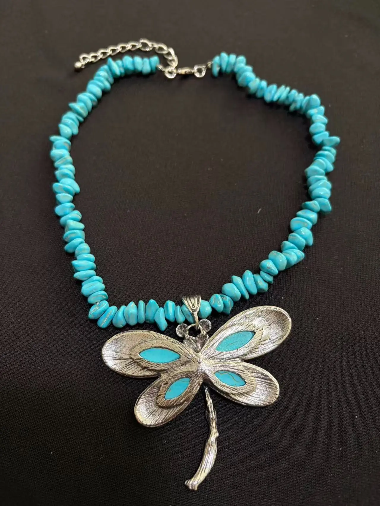 Boho-inspired necklace featuring a detailed dragonfly pendant with turquoise-style accents and a matching beaded chain. Lightweight and eye-catching, this piece adds a playful yet elegant touch to any outfit. Perfect for everyday wear or layering.