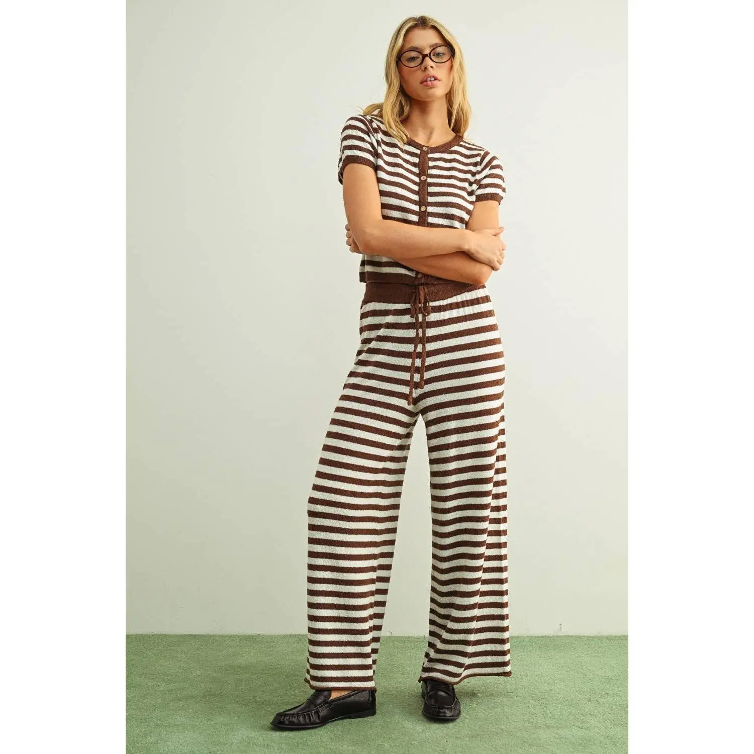 The rich brown and crisp white stripes create a timeless contrast, while the fitted shape and short sleeves add a modern, feminine touch. Pair it with the matching bottoms for a coordinated set, or style it with denim for an easy everyday outfit.
