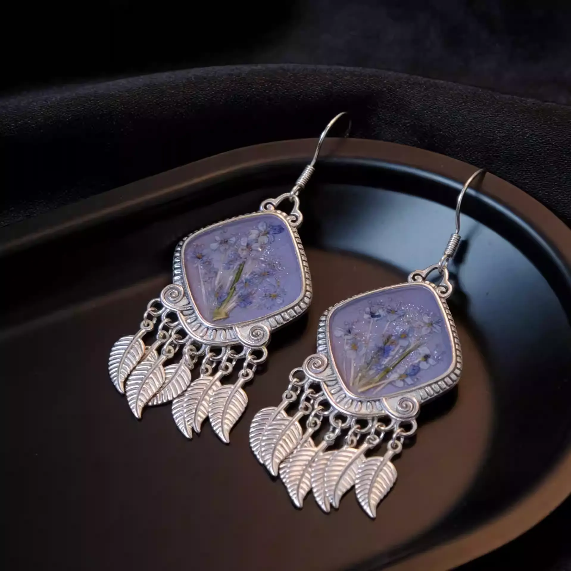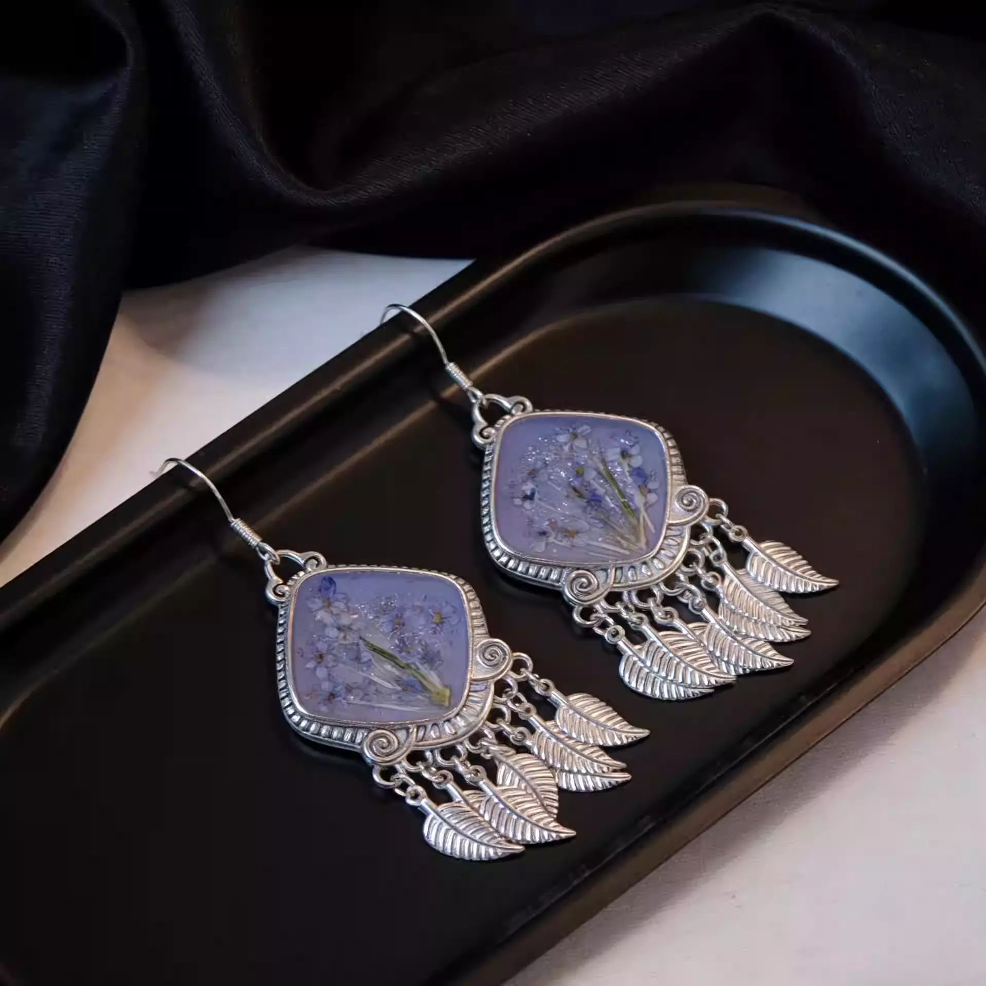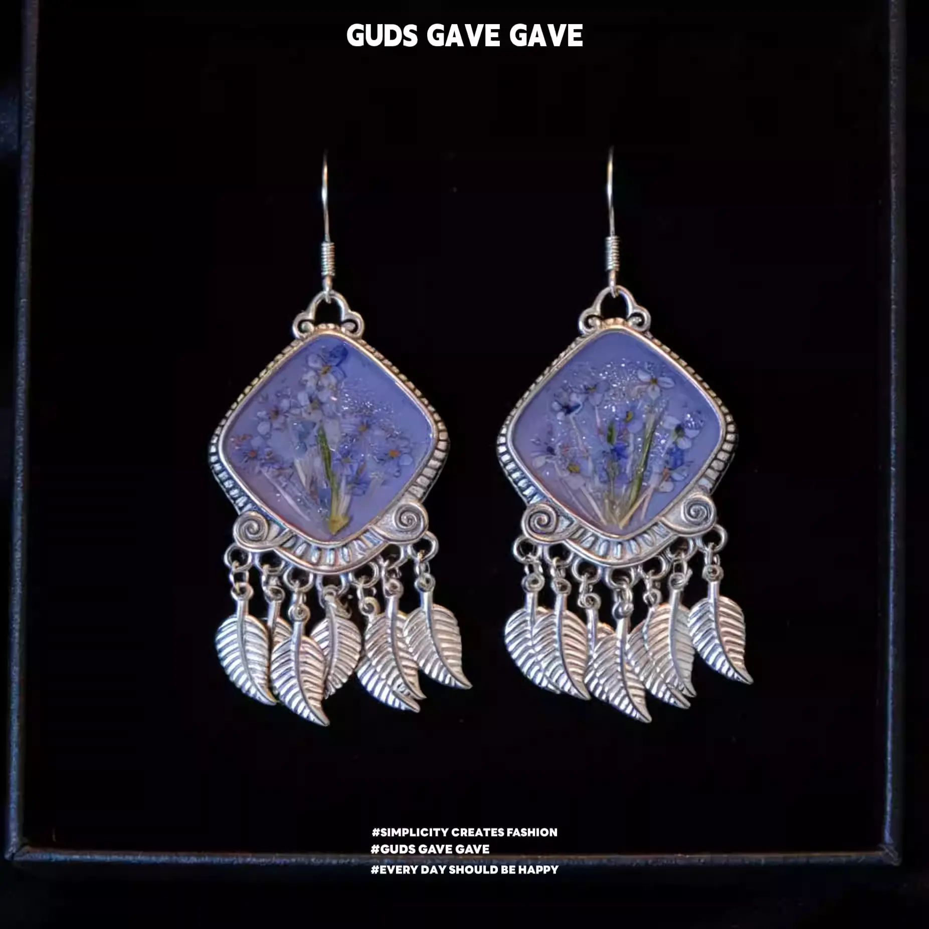These unique earrings from GUDS GAVE are fully handmade with vintage Miao silver, combining classic ethnic style and delicate blue preserved dried flowers.