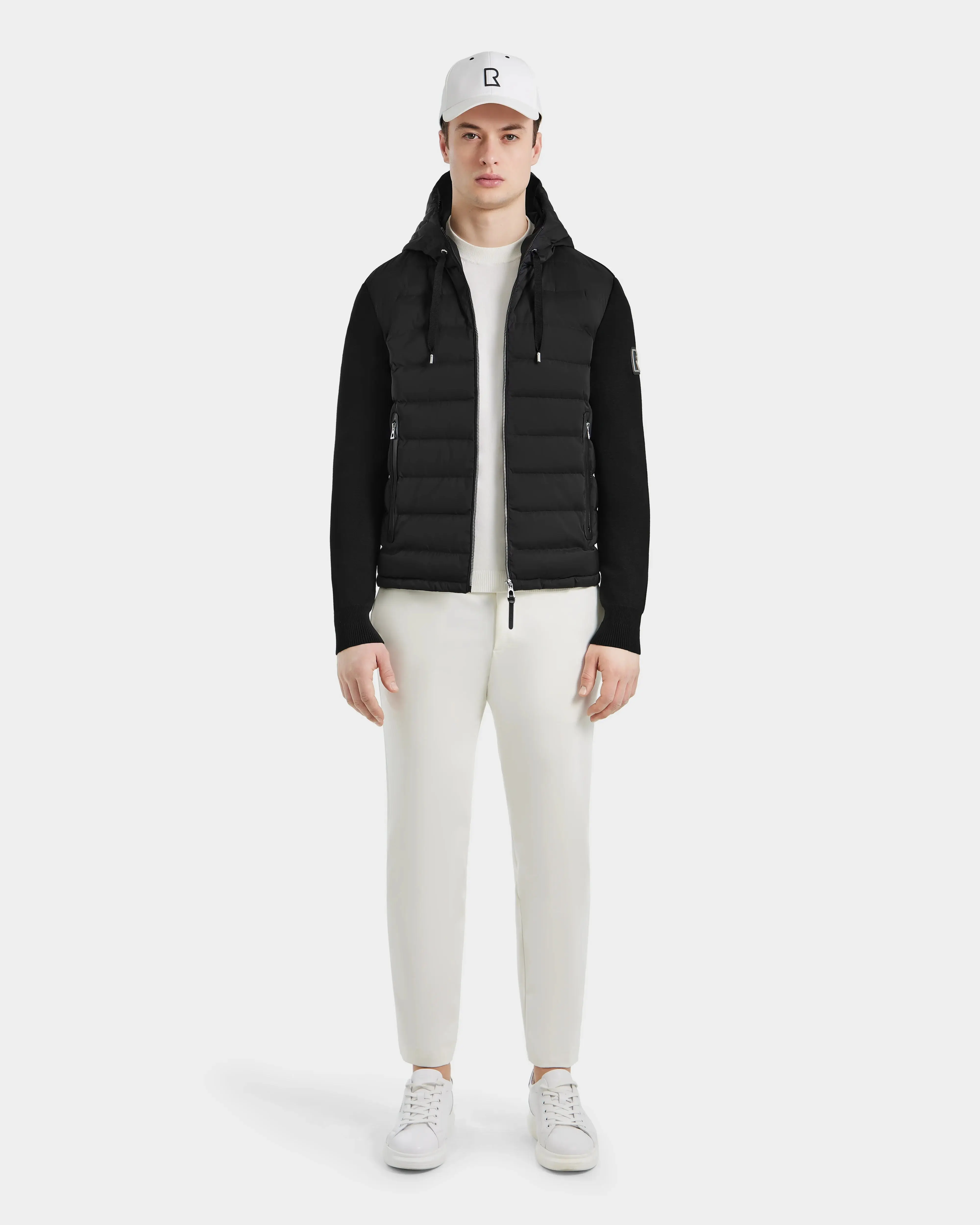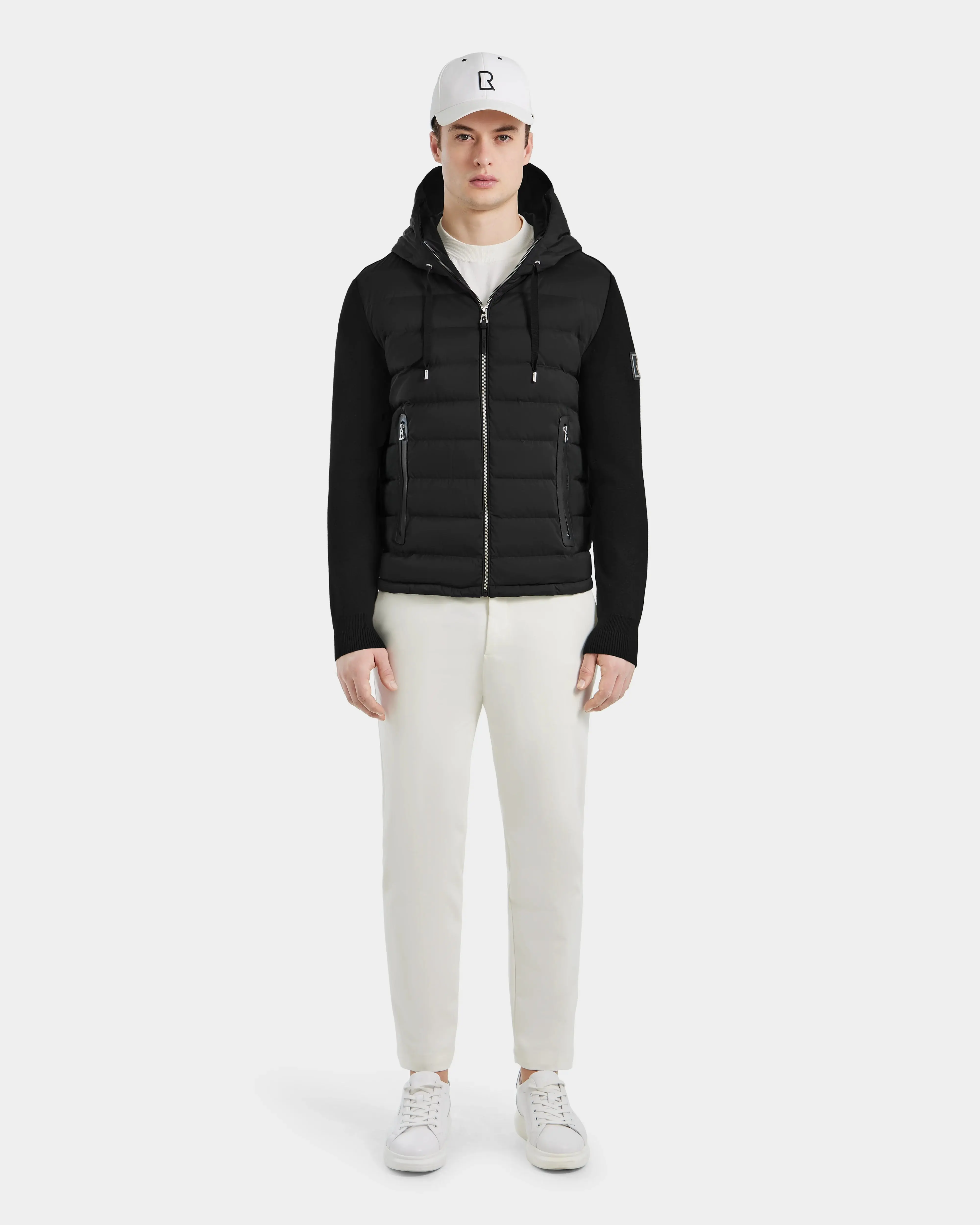 The RIVER by RUDSAK is a men's lightweight down jacket with a hood, featuring a hybrid design with knit sleeves and back, paired with a quilted down front. This versatile piece offers warmth without bulk, making it ideal for layering or transitional weather. The combination of textures adds a modern touch, while the lightweight construction ensures comfort and ease of movement. Ideal for everyday wear, the RIVER jacket seamlessly blends functionality with style, making it an essential in every man's wardrobe.