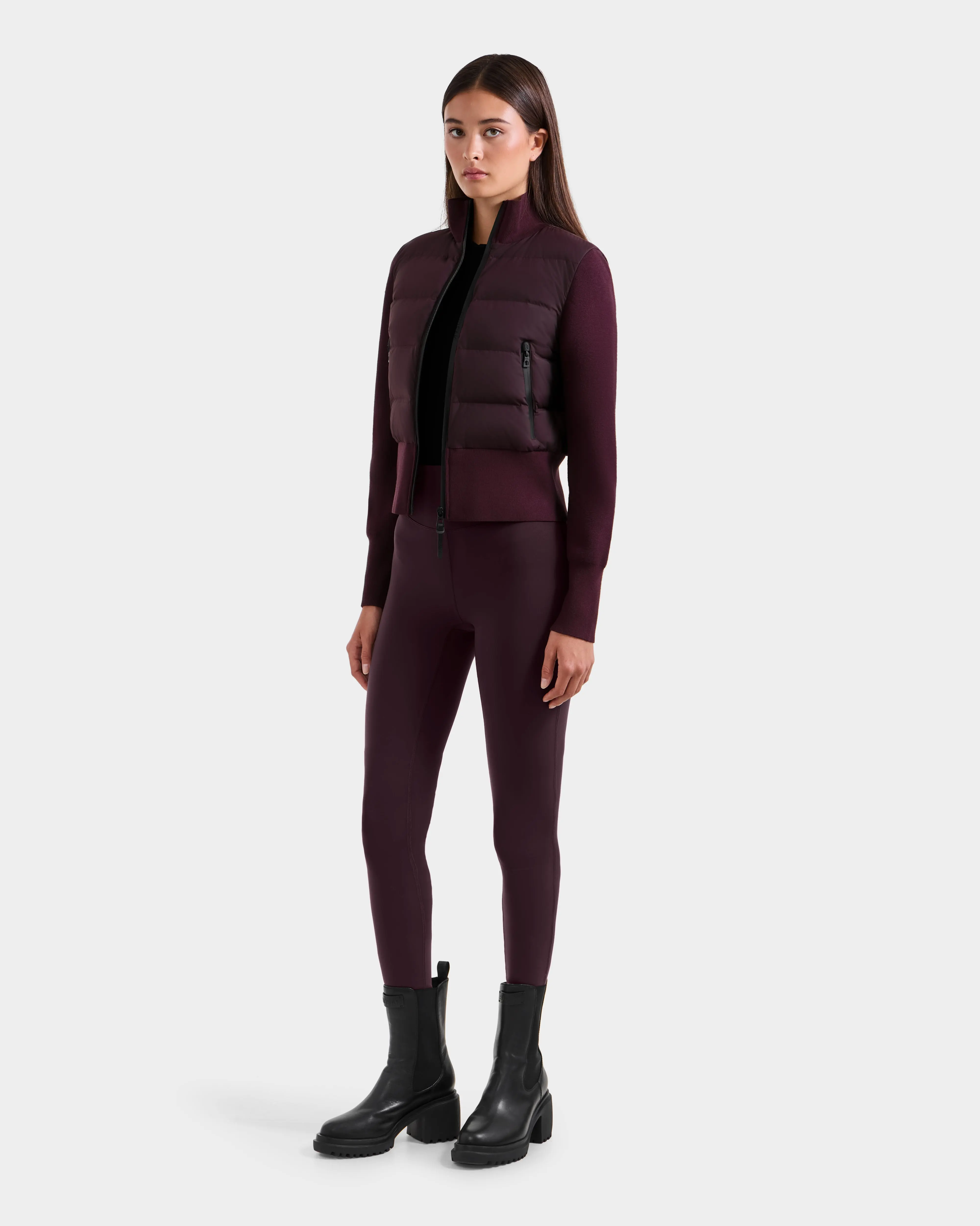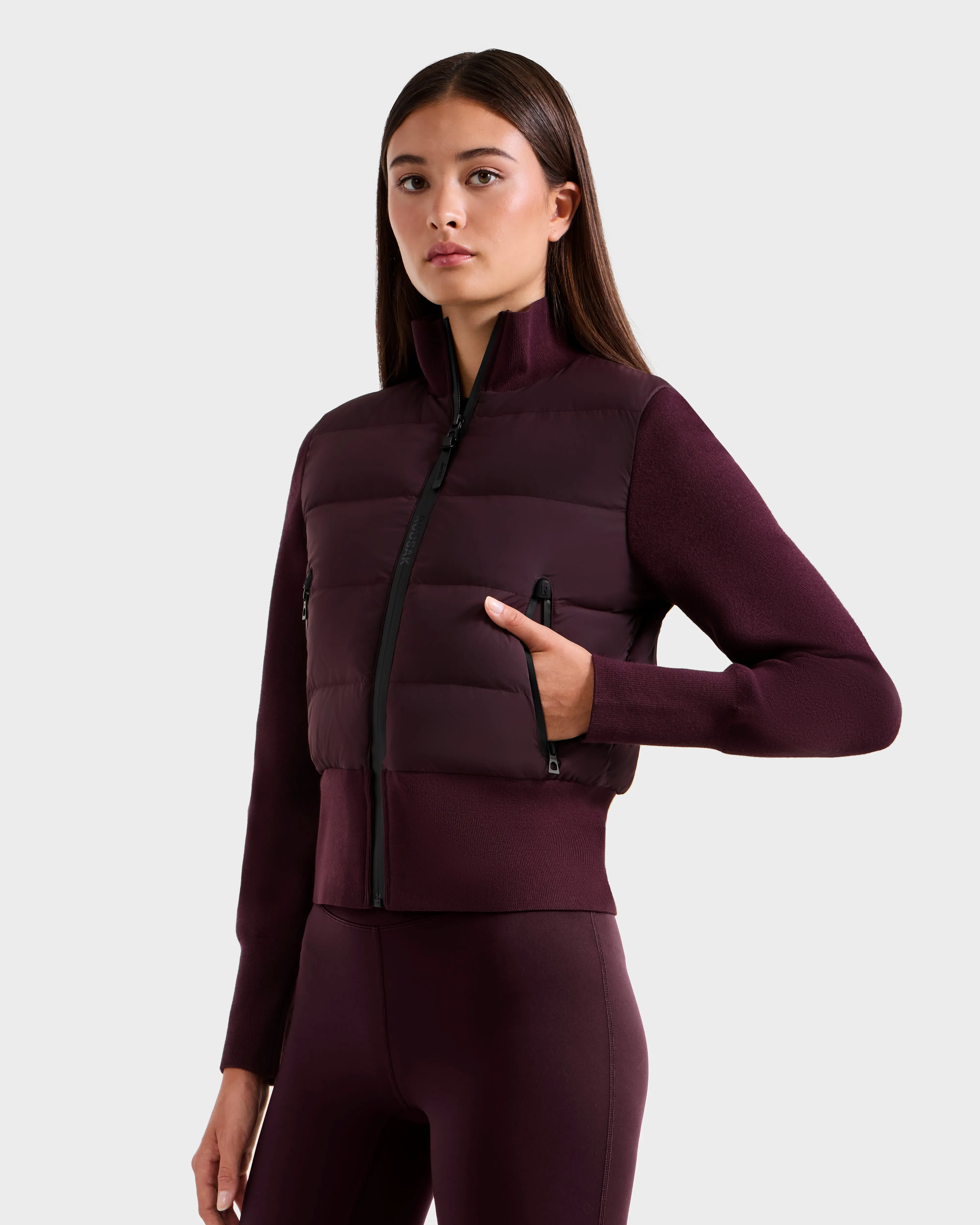 The CLAREMONT by RUDSAK is a women’s short hybrid down jacket designed for sleek, lightweight warmth. Featuring a quilted front and back insulated with RDS-certified down, it’s finished with knit sleeves, ribbed trim, and a soft ribbed collar for added comfort and mobility. Waterproof zippers enhance its weather-ready design, making it ideal for layering, travel, and transitional weather. With its modern silhouette and versatile styling, CLAREMONT is a go-to essential for refined, on-the-go dressing.