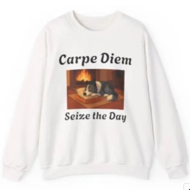 Heavy tee sweatshirt Carpe Diem. Durable for everyday or any day wear. Seize the day and include the sleeping border collie in your life and be the talk of the town. In many colors