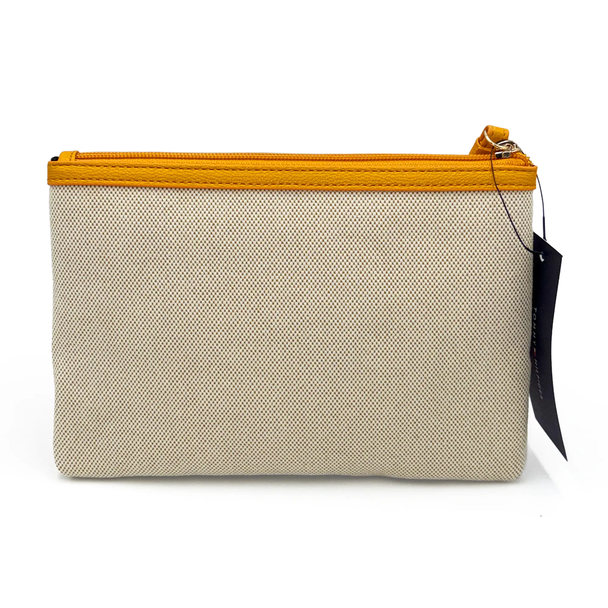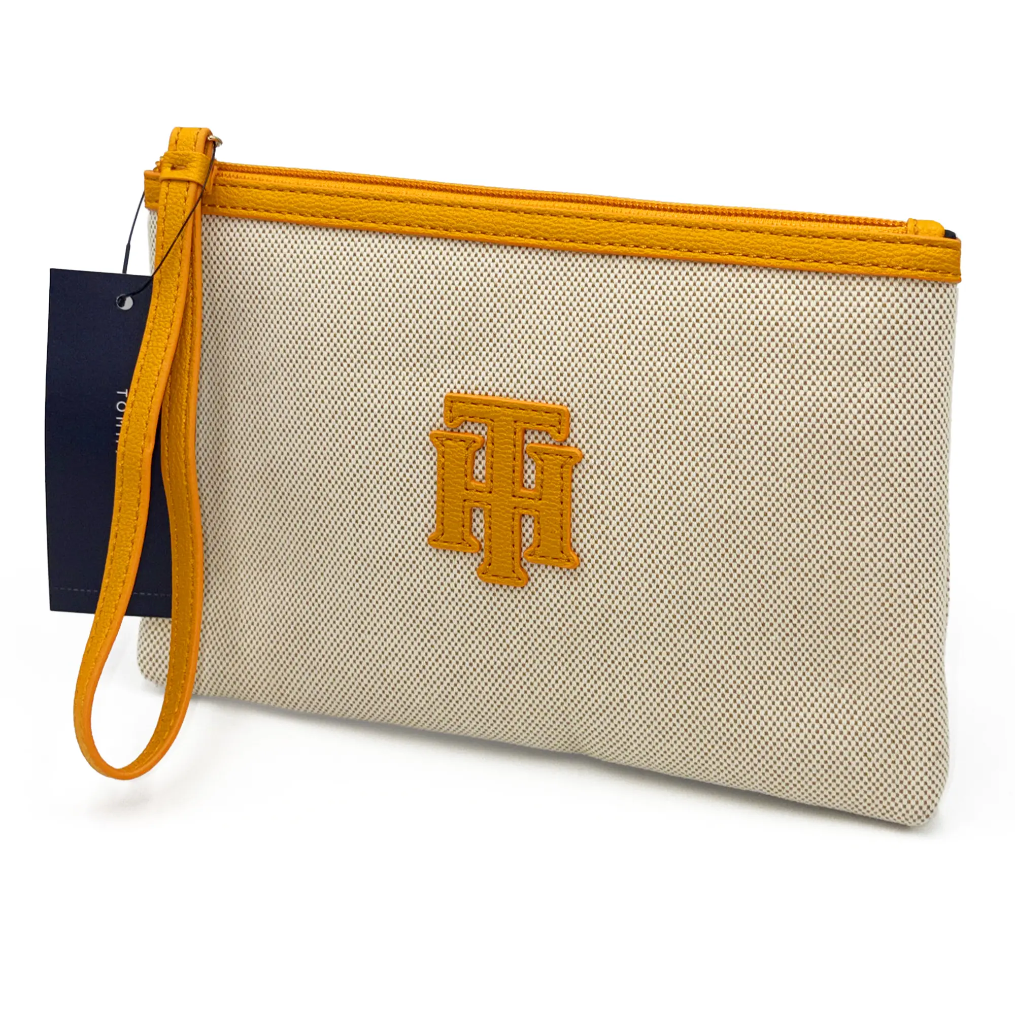 -A sleek large wristlet crafted in durable natural canvas with rich ochre trim.