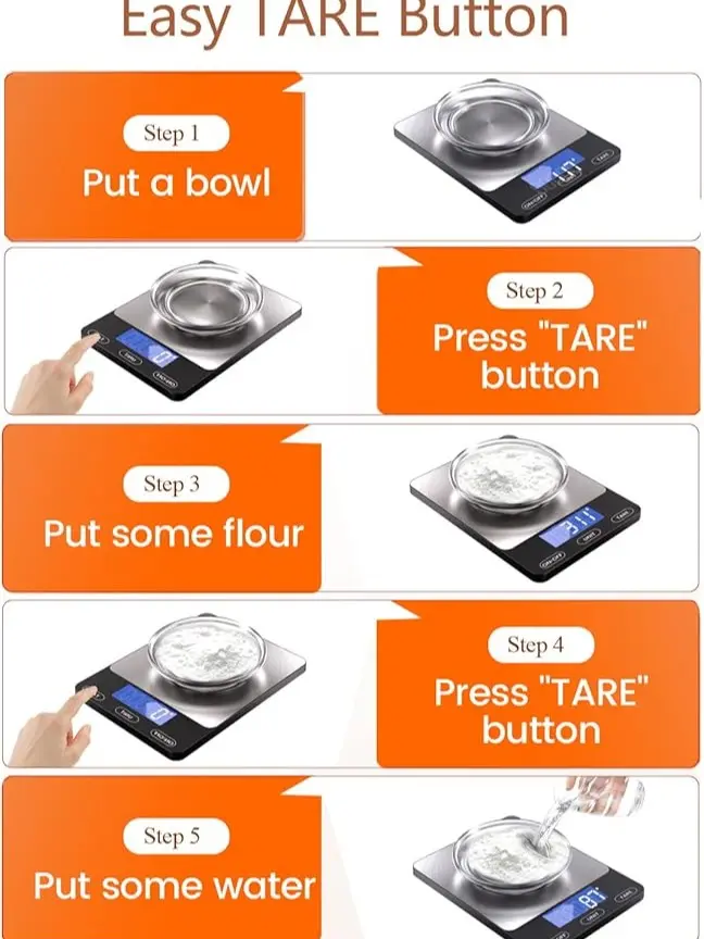 ·【Weight Control Scale -Easy Tare】 The Tare button allows you to subtract the weight of mug, plate, or different sized bowl, making it easy to achieve accurate readouts of nuts, grains, powder, fruit, milk and more food.