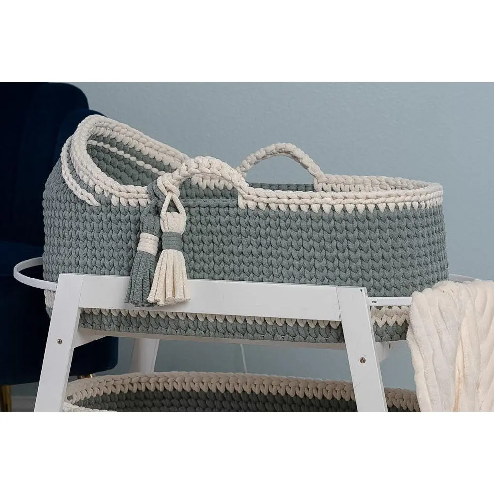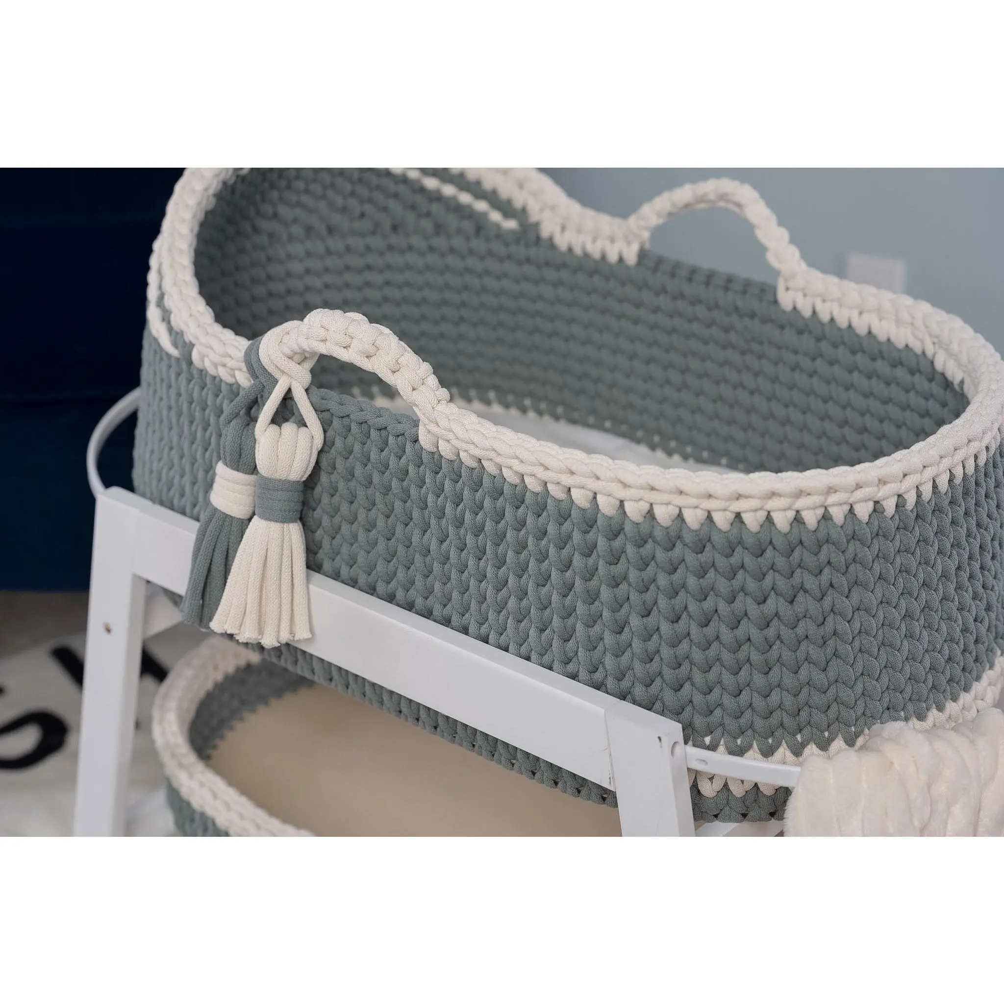 Handcrafted with care, this baby Moses basket features a sturdy wooden base and is beautifully crocheted using premium 9mm Bobbiny cord made from 100% OEKO-TEX® certified cotton. Designed with both style and safety in mind, it offers a soft, breathable, and chemical-free environment for your little one. Each basket is thoughtfully made to be gentle for delicate skin while providing lasting durability and timeless charm for your nursery. The sturdy wooden base ensures stability and long-lasting support, while the gently curved hood creates a snug, sheltered environment—perfect for naps, lounging, or capturing those precious newborn moments.