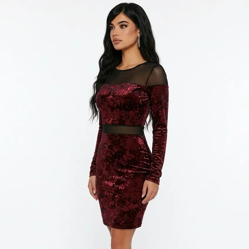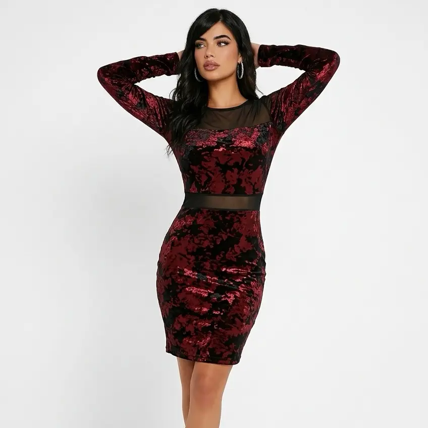 This stunning velvet dress features a captivating floral marble-like pattern, blending rich burgundy and deep black hues that create a striking visual effect. The luxurious texture of the velvet adds an element of sophistication, making it perfect for both formal and semi-formal occasions. The design includes a sheer cut around the stomach, elegantly revealing a hint of skin while maintaining an air of mystery. This detail enhances the dress's allure, drawing attention to the waist. Additionally, the sheer accents on the shoulders and neckline add a delicate touch, softening the overall look and providing a graceful contrast to the bold colors. Overall, this dress is a beautiful fusion of elegance and modern design, making it a standout piece in any wardrobe.