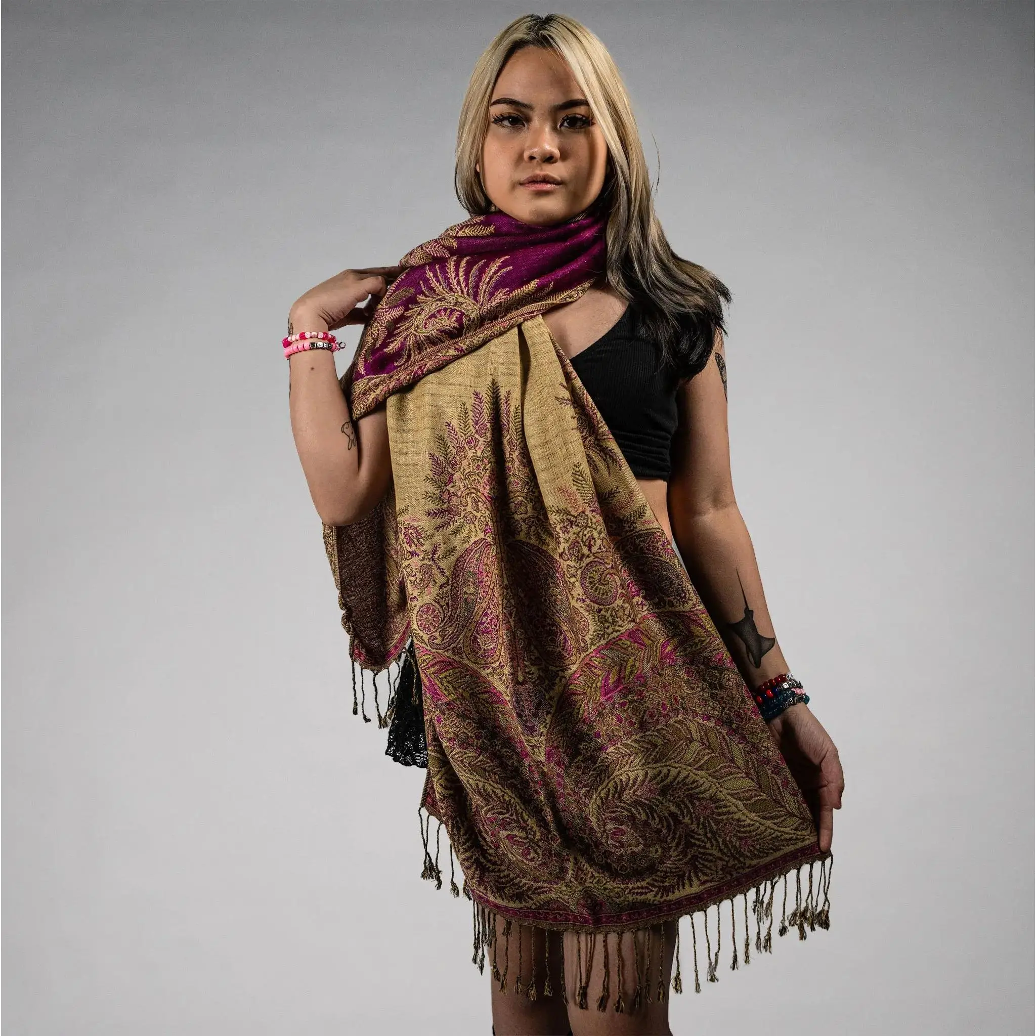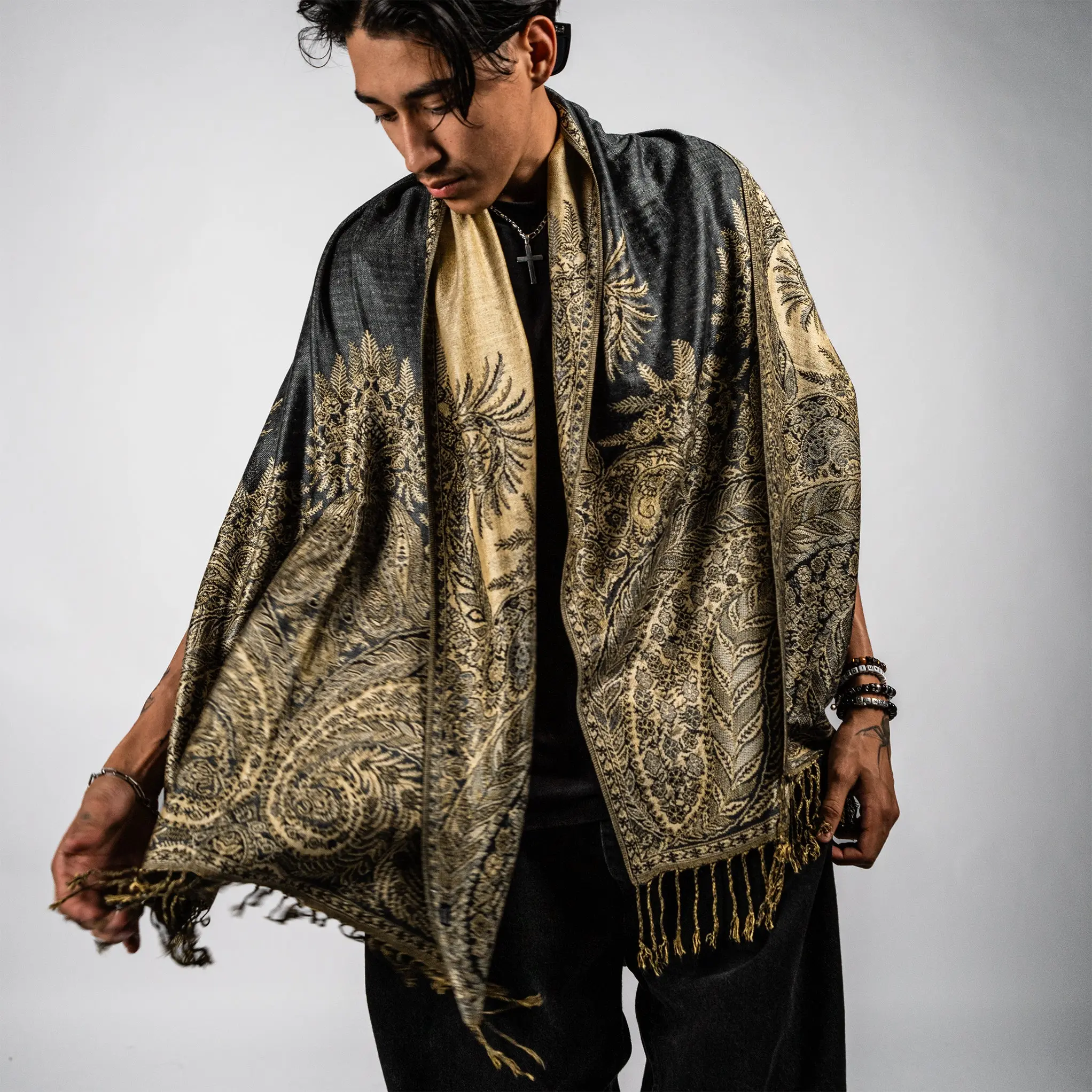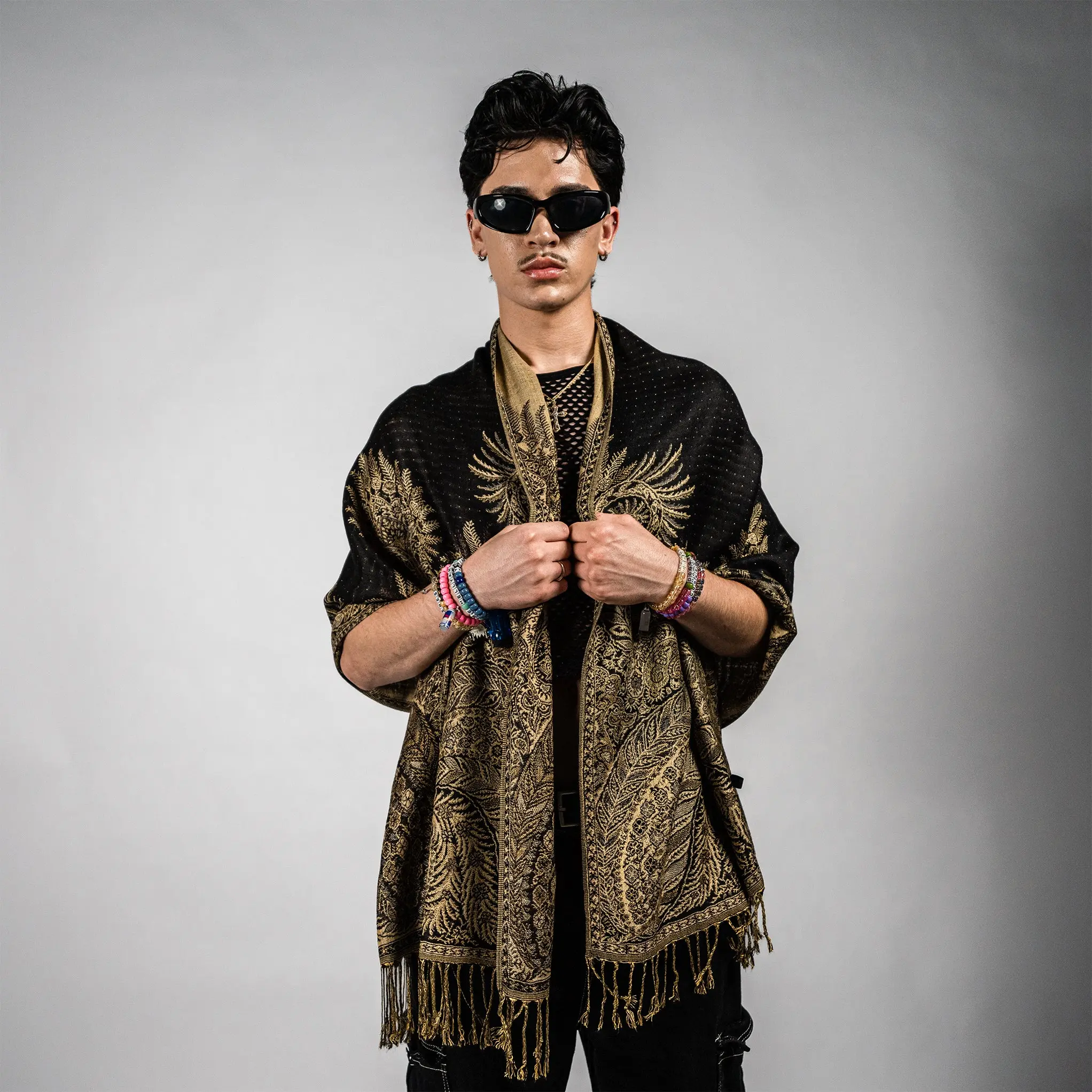 Glow up and stand out with the Golden Fern Pash.This extra-smooth, lightweight wrap shimmers with intricate fern patterns and a touch of golden radiance, making it the perfect statement piece for festivals, nights out, or cozy everyday layering.Whether you’re vibing at a bass show or dressing up a simple outfit, the Golden Fern wraps you in effortless style and comfort.