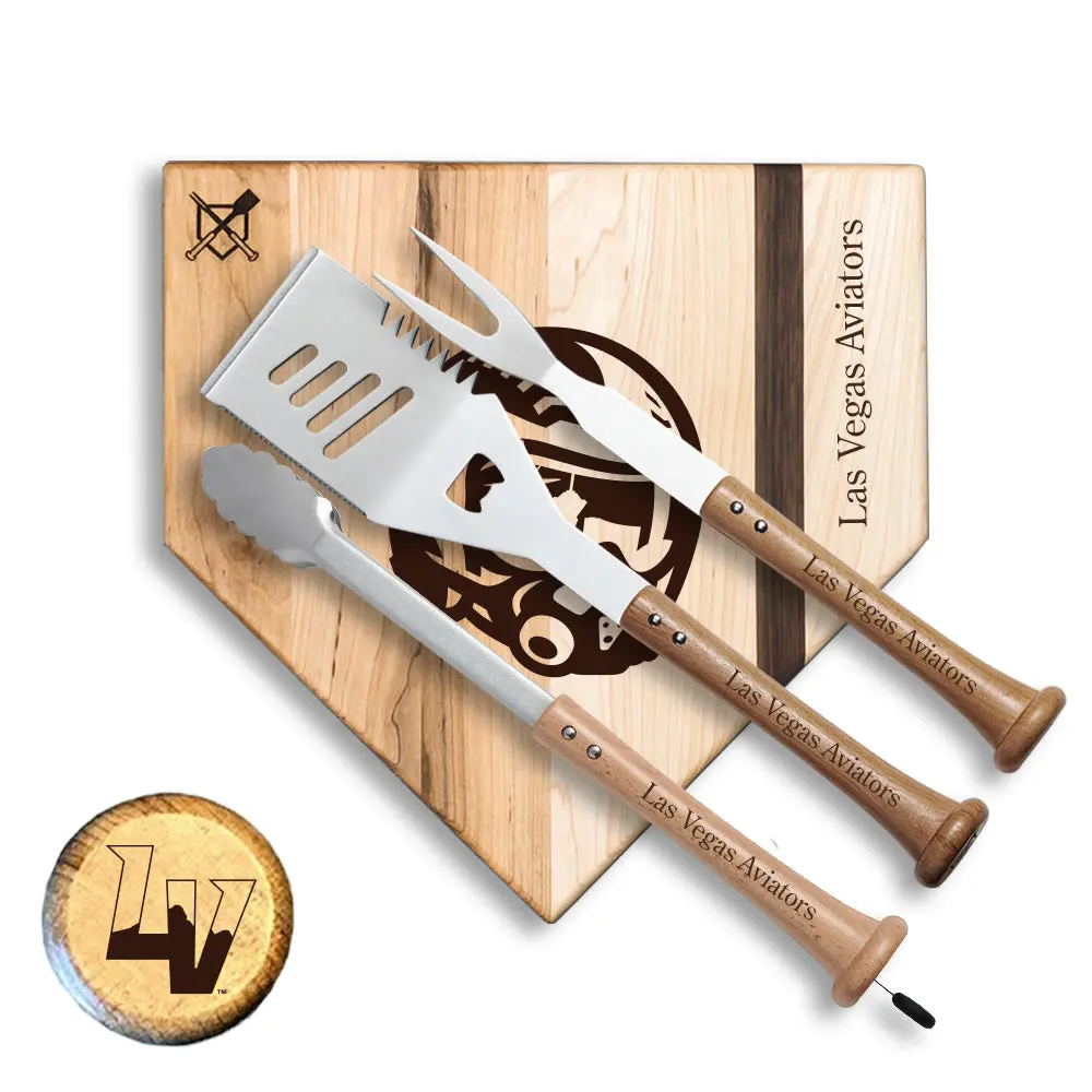 Baseball BBQ Turn Two Combo Set - Patented Bat Handle Design, Professional-Grade Stainless Steel, All-Natural Wood Handle, Multi-Tool Grill Tools