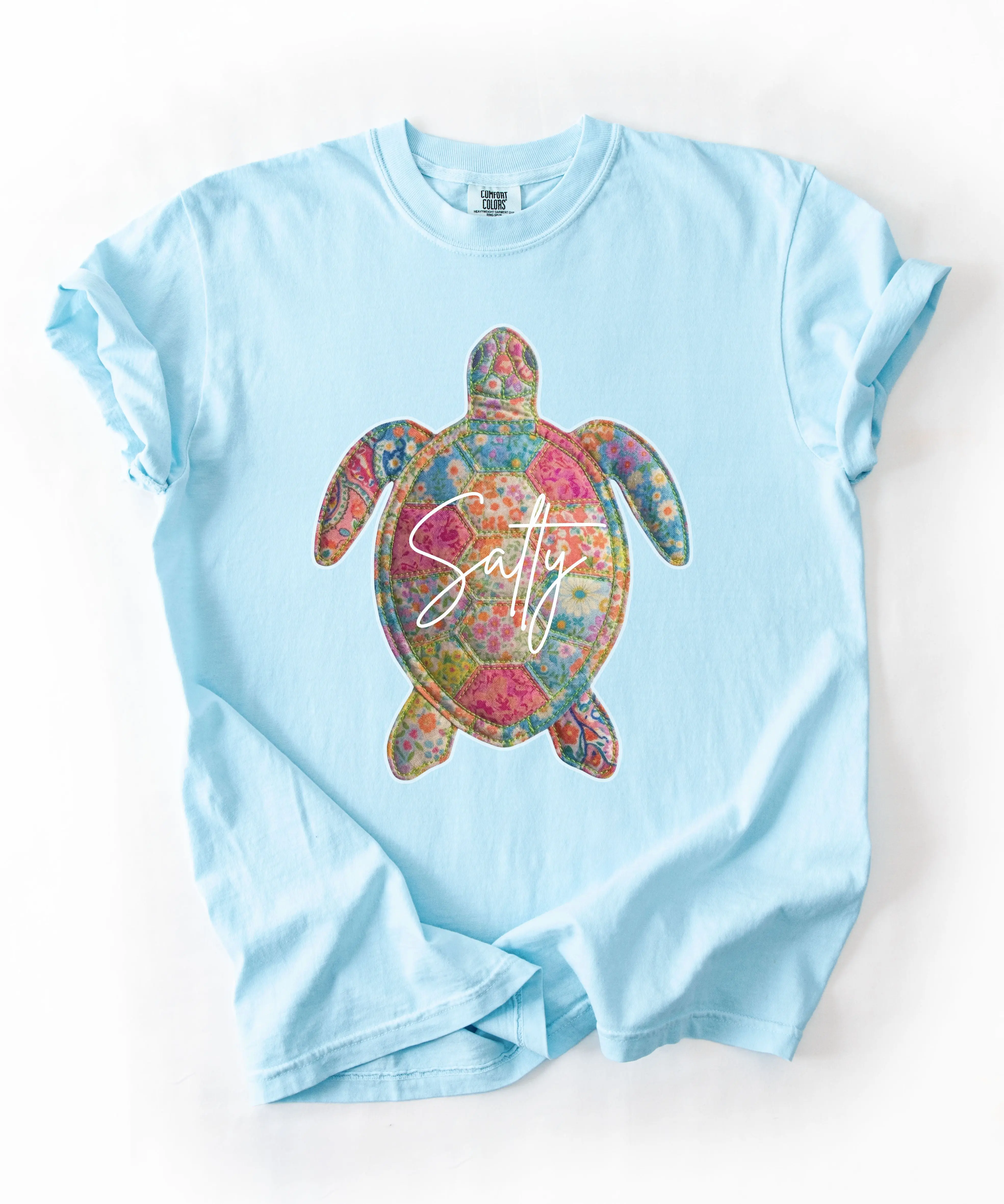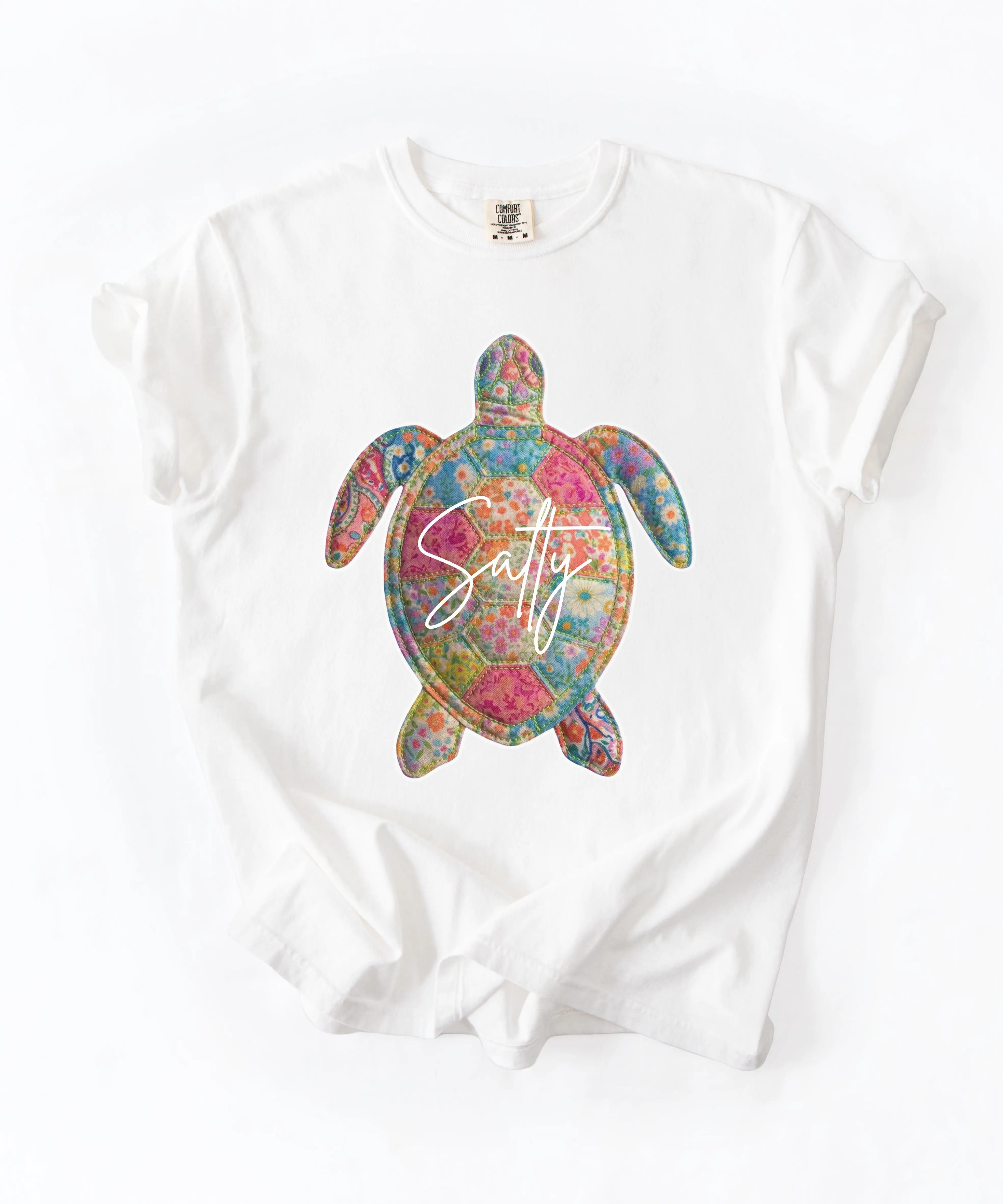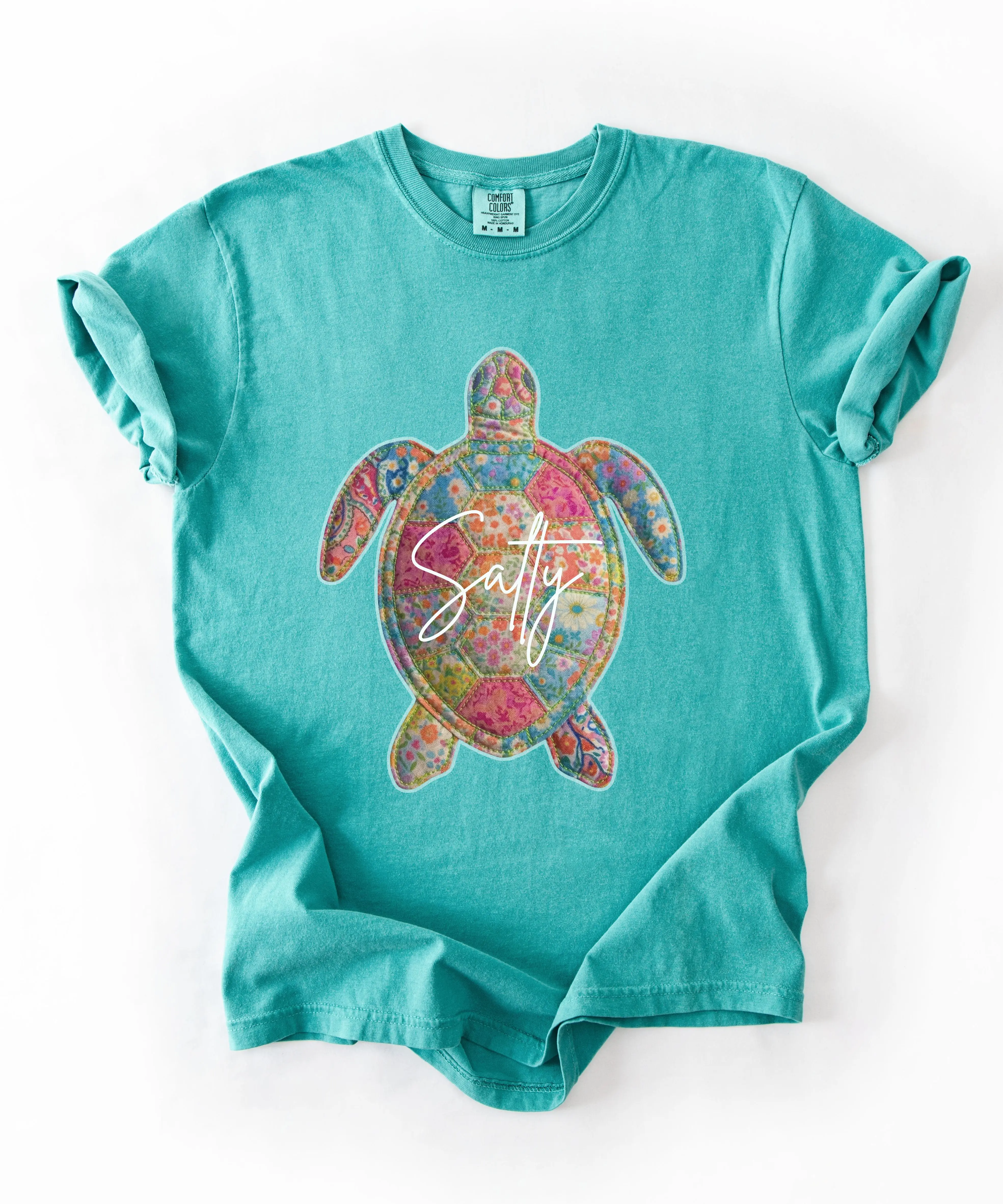 This Salty Sea Turtle T-Shirt features a vibrant quilt-inspired turtle design filled with colorful florals and cheerful summer tones. The playful “Salty” script adds the perfect beachy attitude, making this tee a must-have for ocean lovers and warm-weather wardrobes.