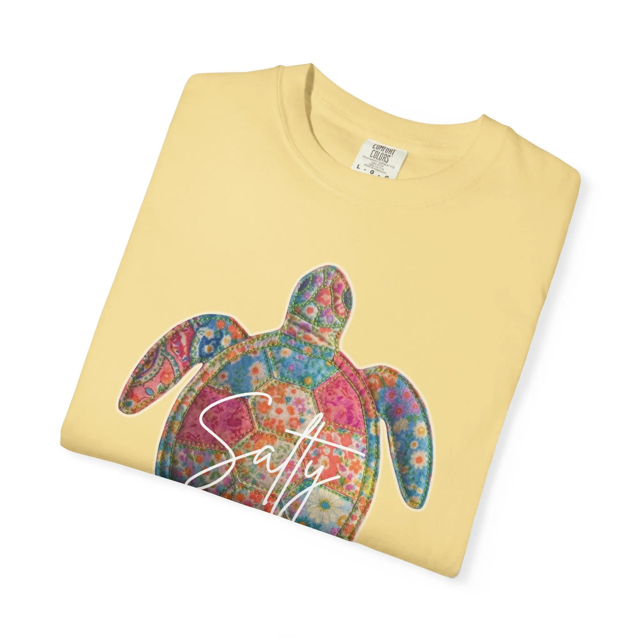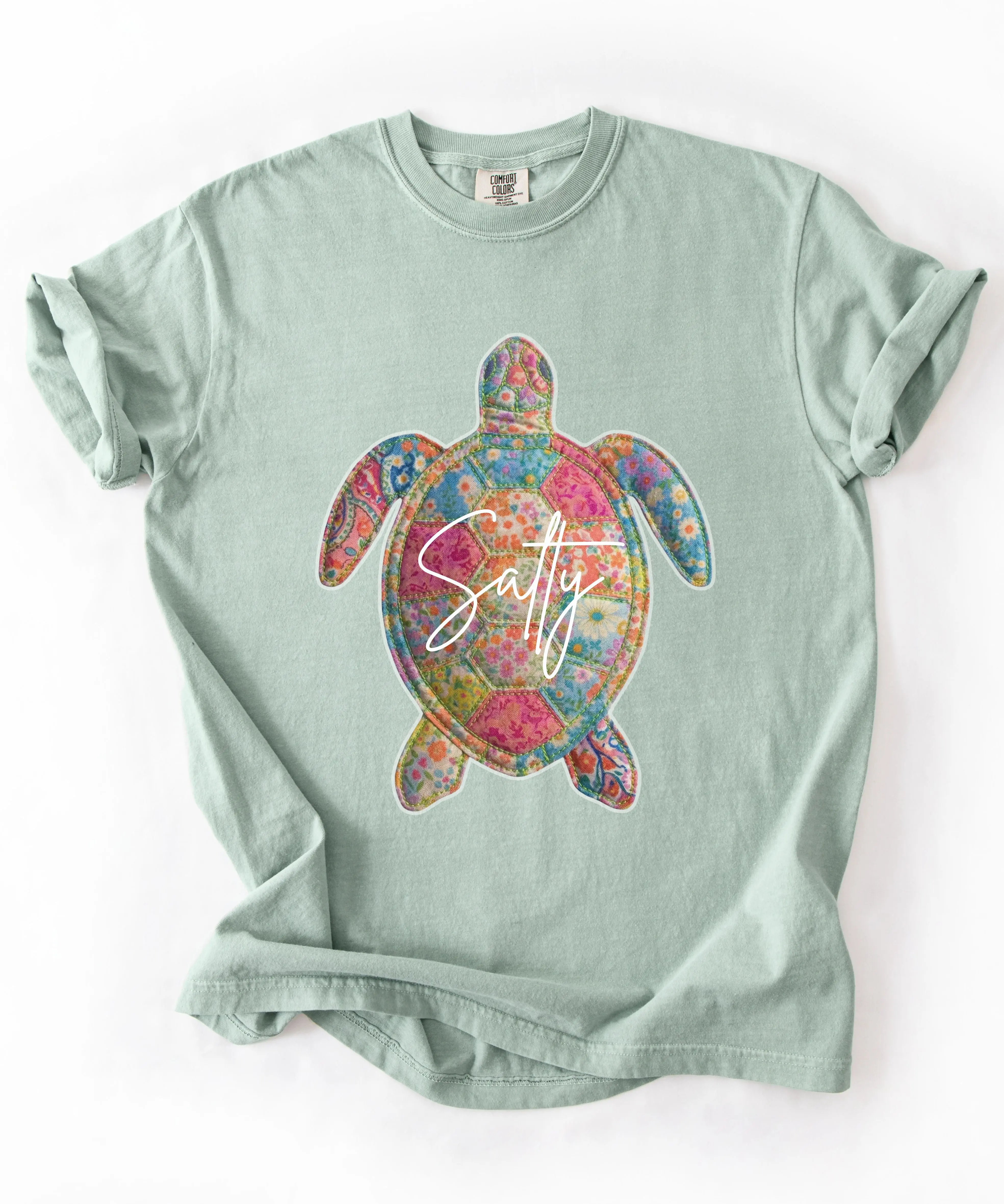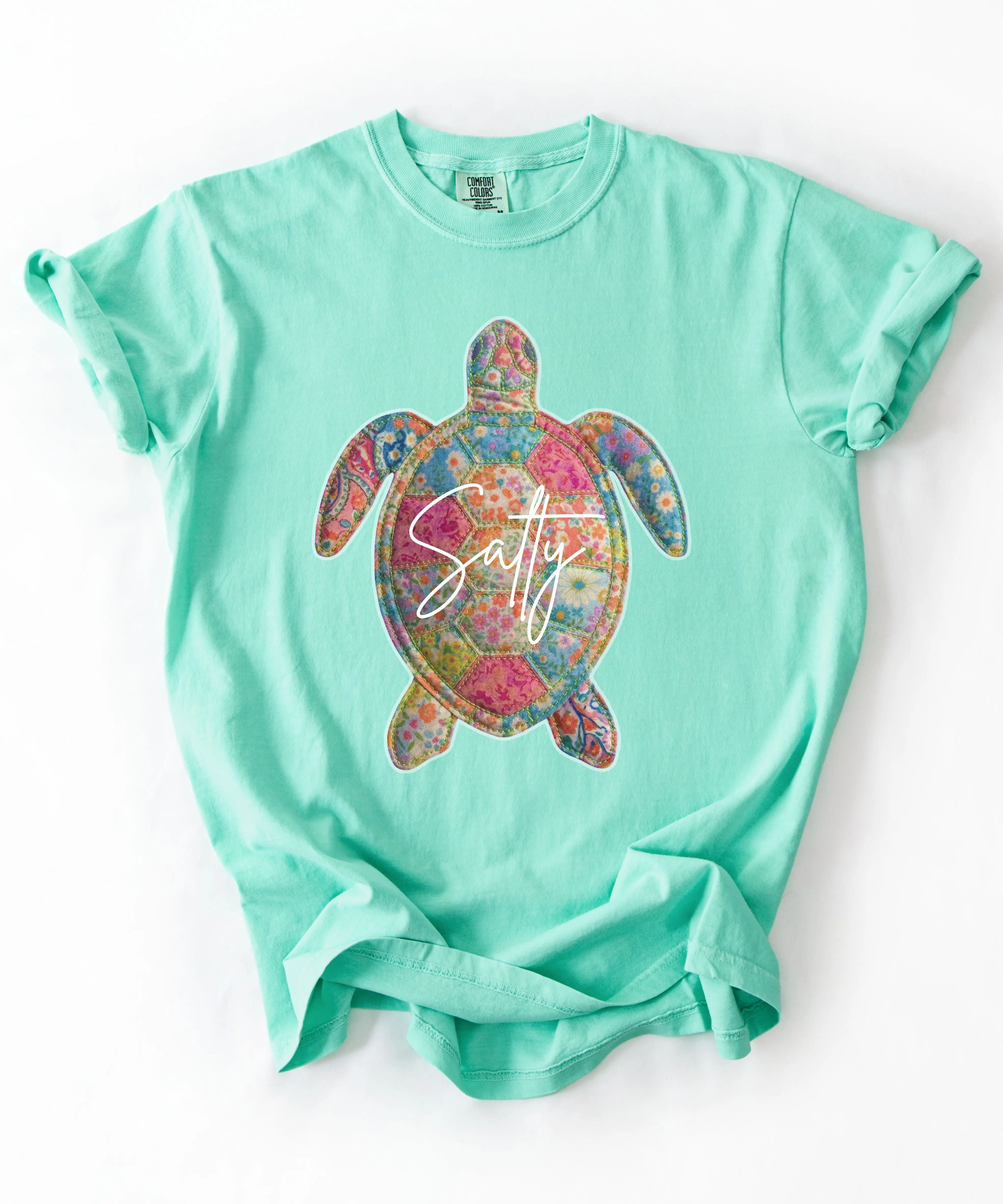 This Salty Sea Turtle T-Shirt features a vibrant quilt-inspired turtle design filled with colorful florals and cheerful summer tones. The playful “Salty” script adds the perfect beachy attitude, making this tee a must-have for ocean lovers and warm-weather wardrobes.