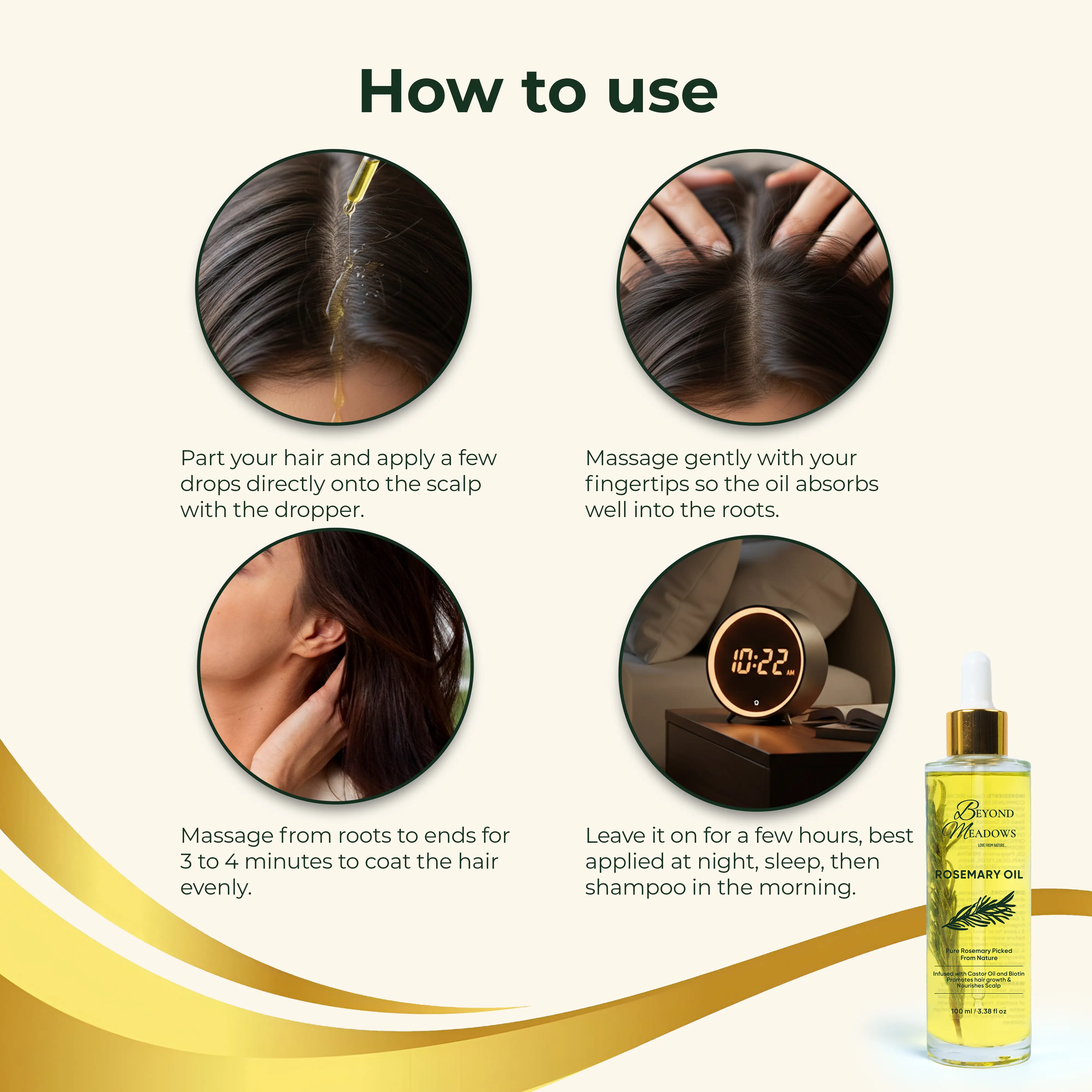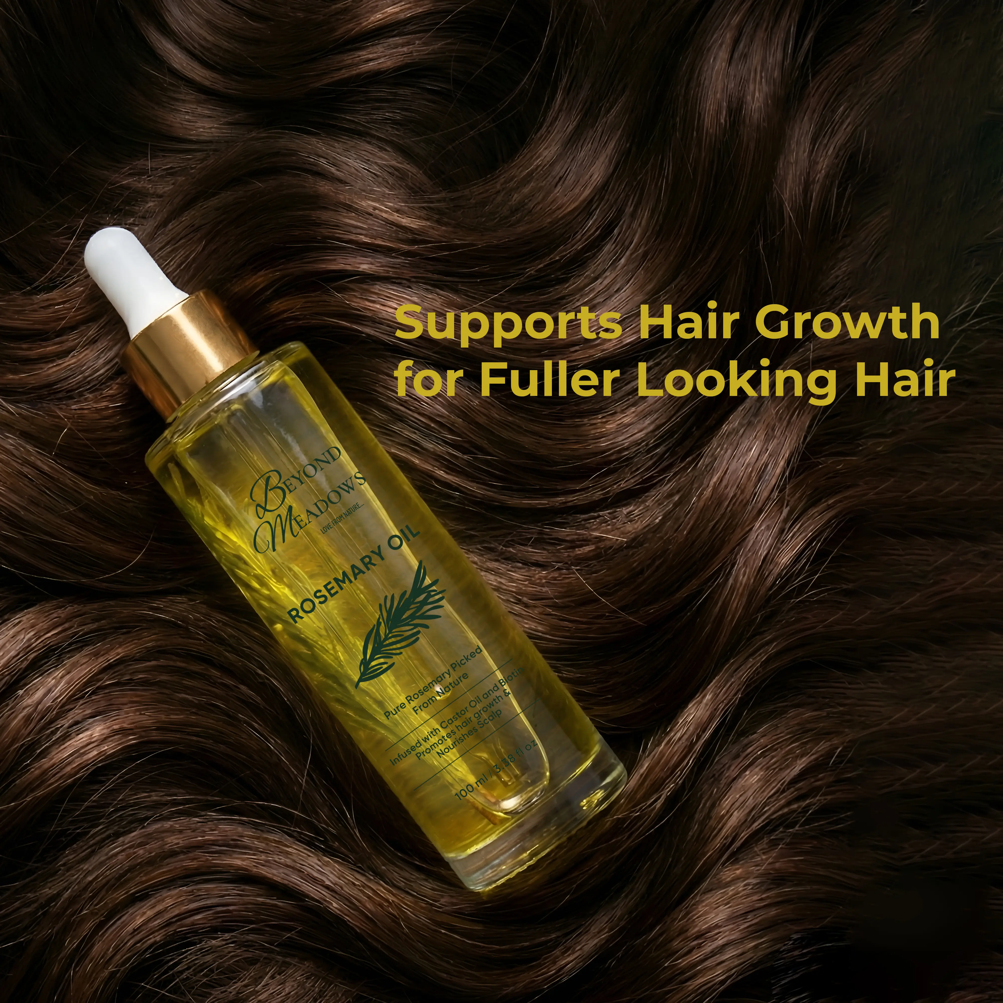 FIGHTS DAMAGE THAT RUINS HAIR LENGTH: Beyond Meadows pure Rosemary Oil for hair growth reduces breakage, strengthens weak strands & helps repair the dryness that causes splits. Our pure rosemary hair oil enhances hair texture for a smoother & healthier look.