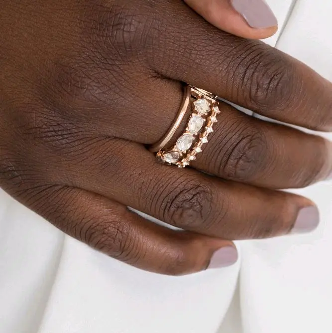 Smooth rose gold and white rhinestone encrusted bands arc across the finger. Featuring square, teardrop, and oval style cuts, glittery white rhinestones are encrusted along the centermost band for a glamorous look. Features a stretchy band for a flexible fit. Sold as one individual ring.