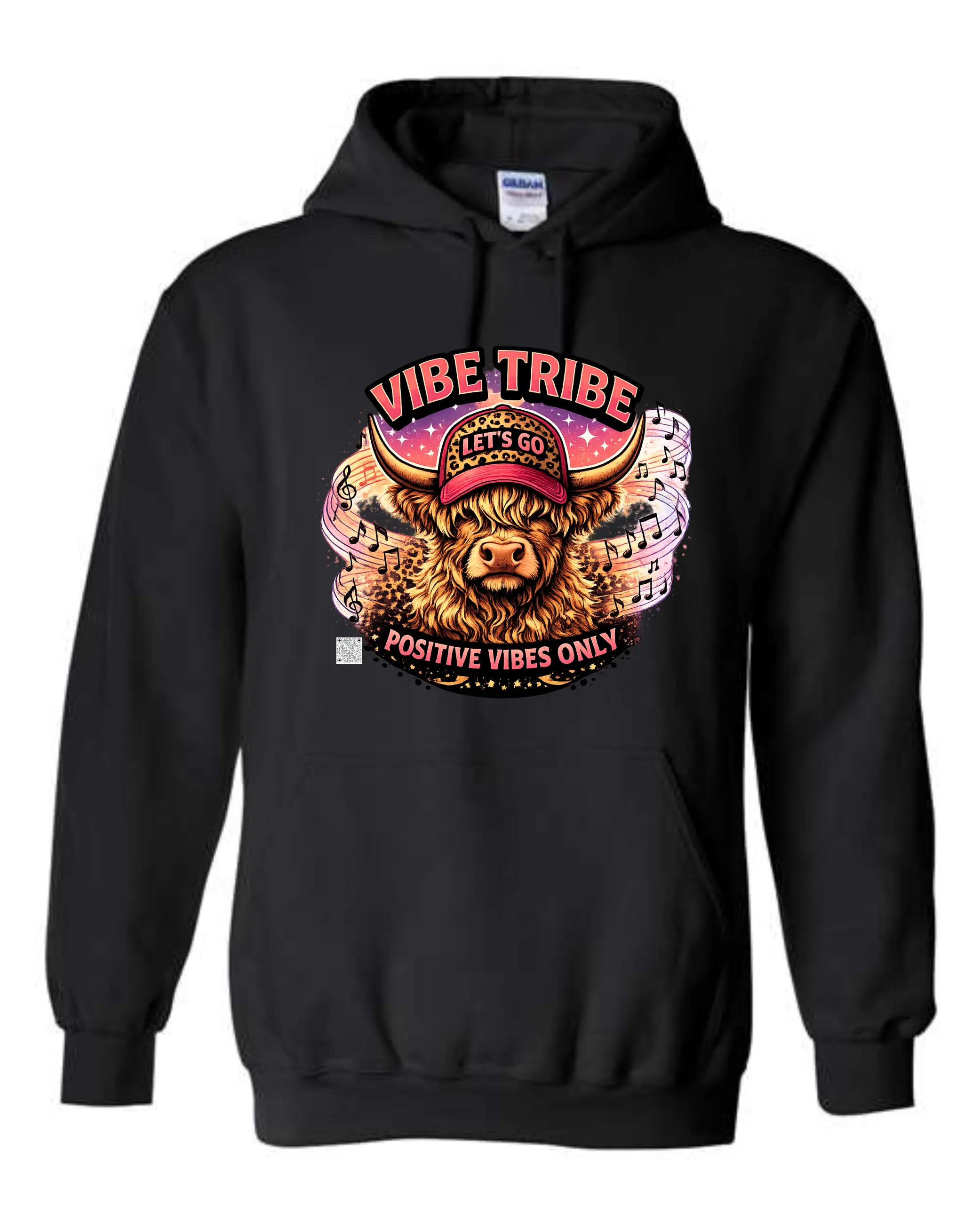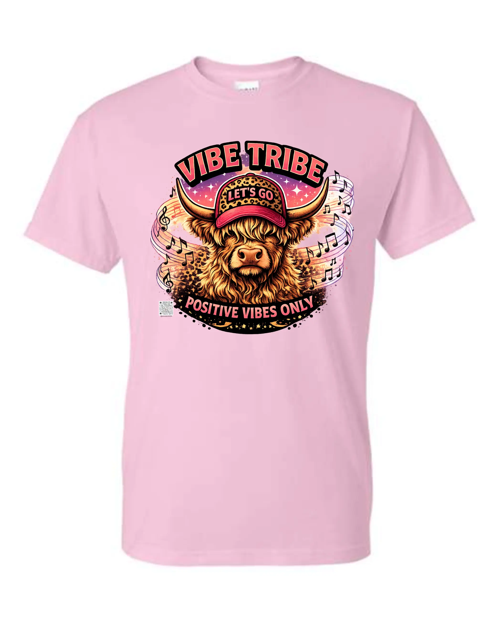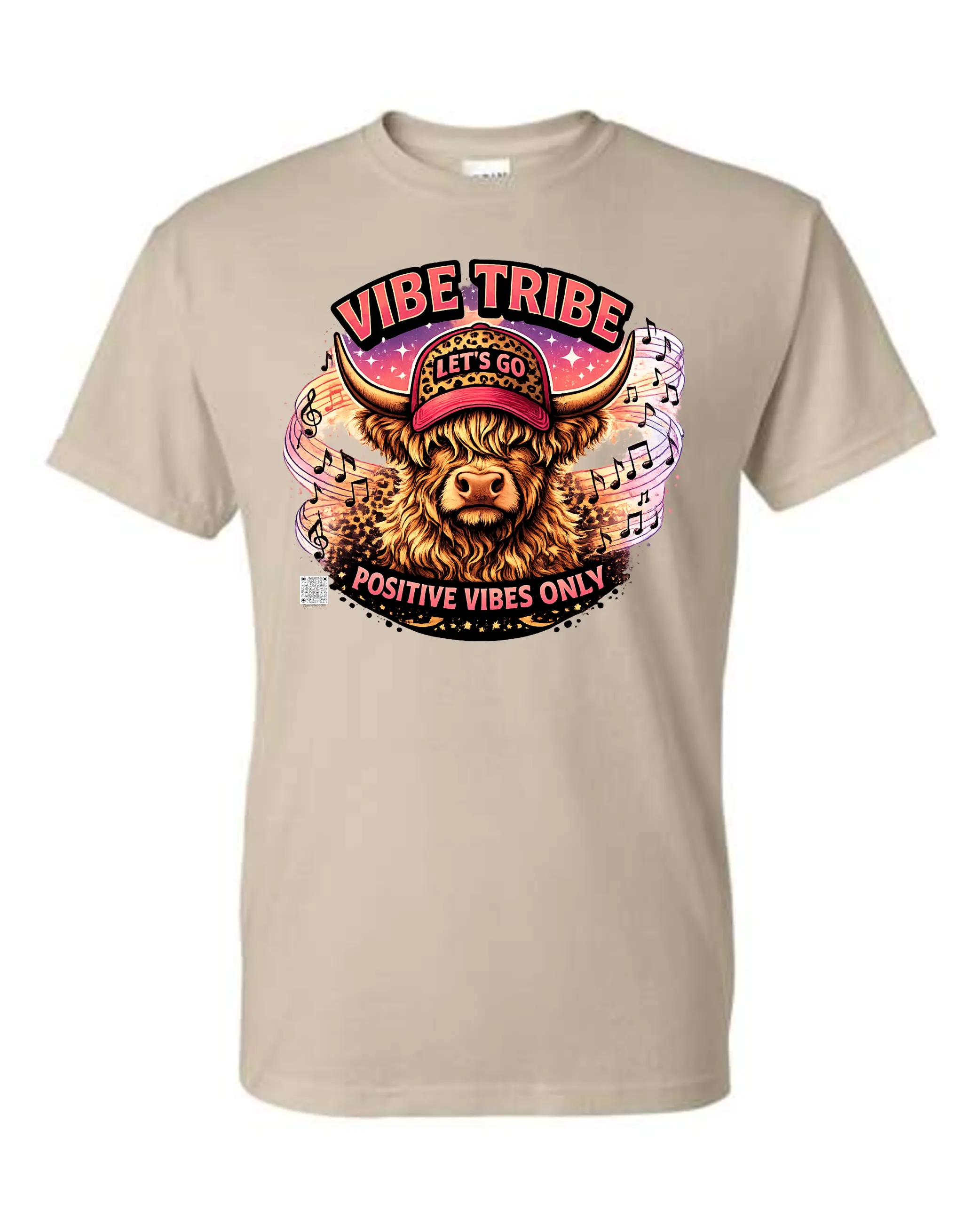 Our Vibe Tribe “Positive Vibes Only” design is more than just a shirt — it’s a whole mood. Featuring a bold highland cow graphic, music notes, and feel-good energy, this piece was made for those who show up, support, and spread positivity in every live