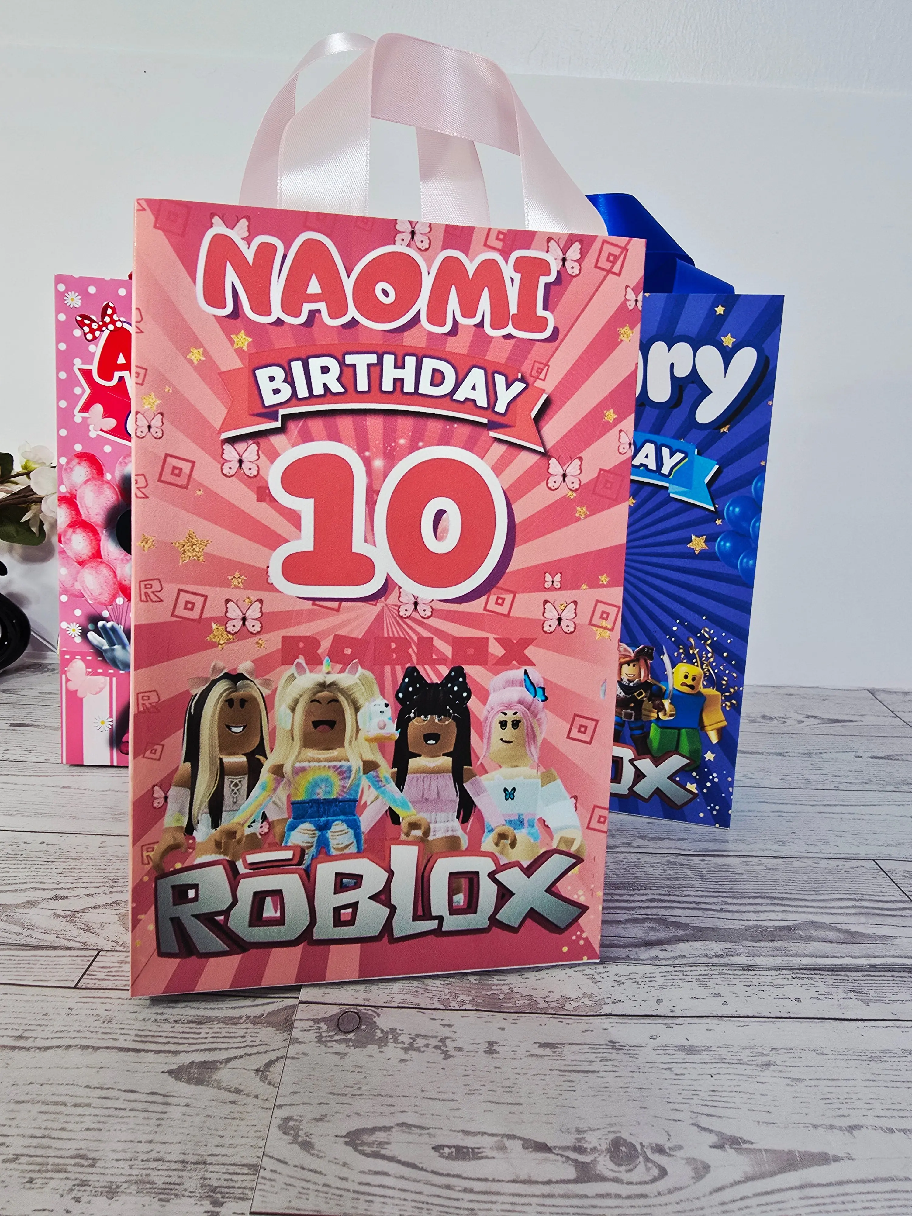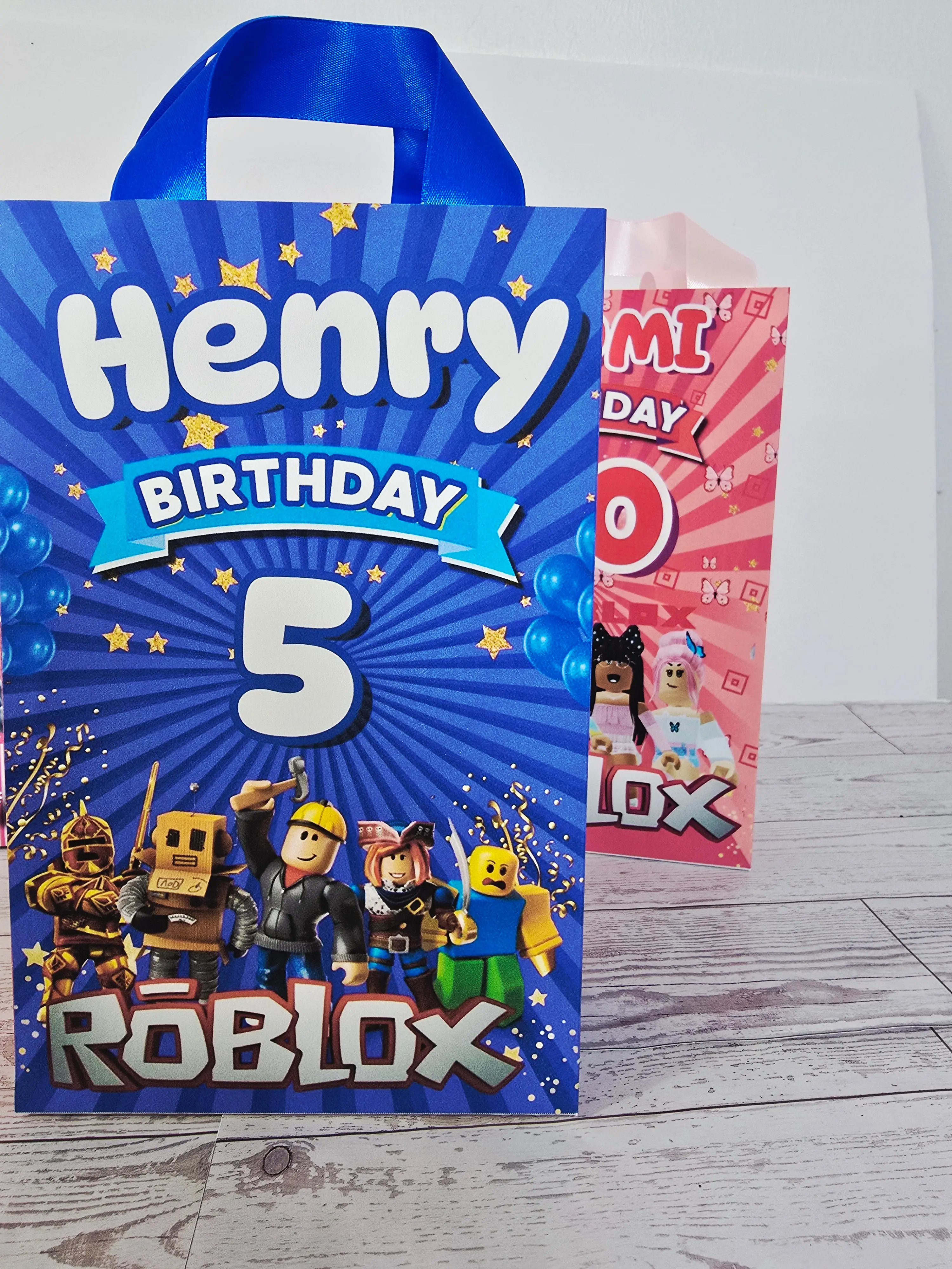Make your little gamer's birthday unforgettable with these personalized Roblox-themed gift bags! Each bag is customized with the birthday child's name and age, making every guest feel the celebration is truly one-of-a-kind.