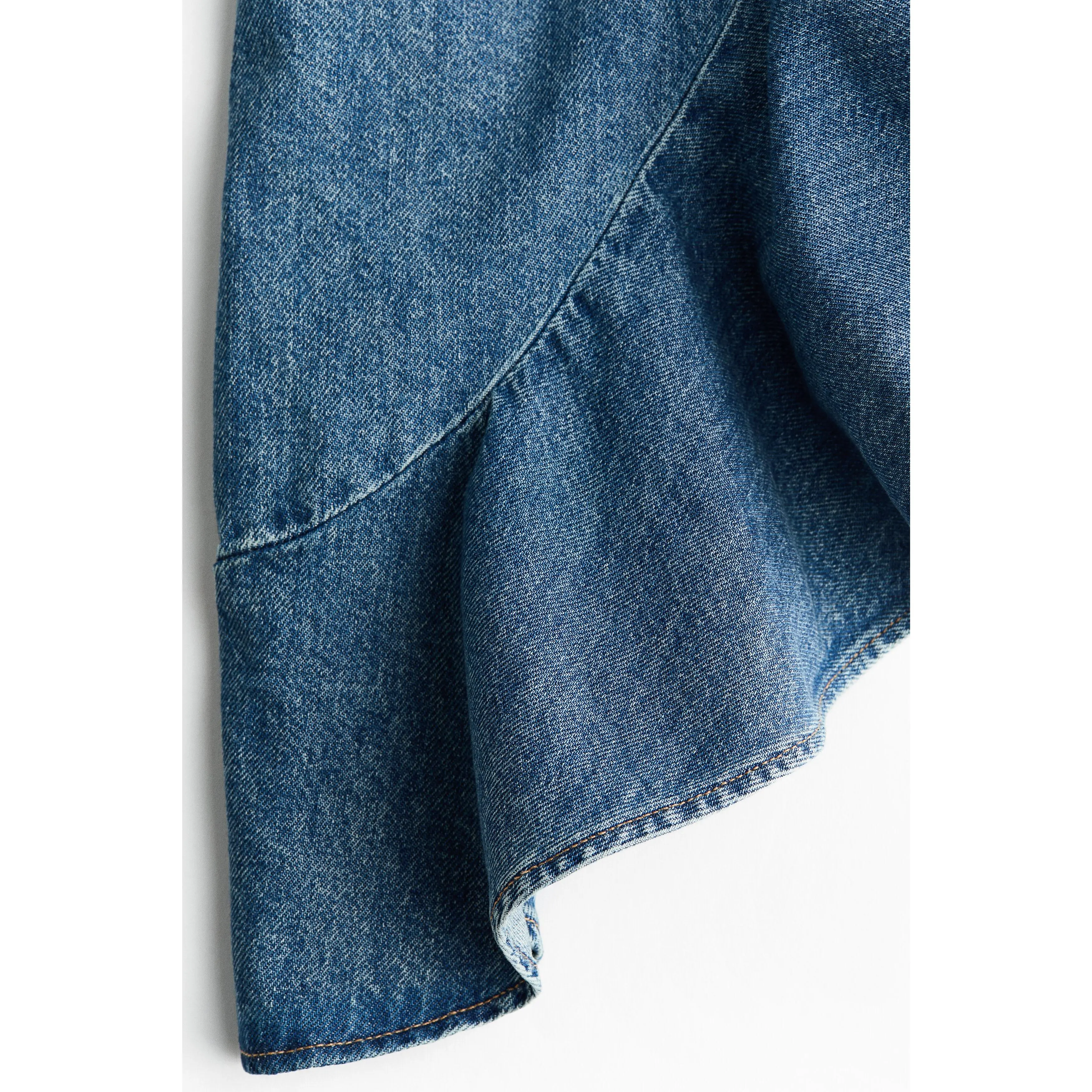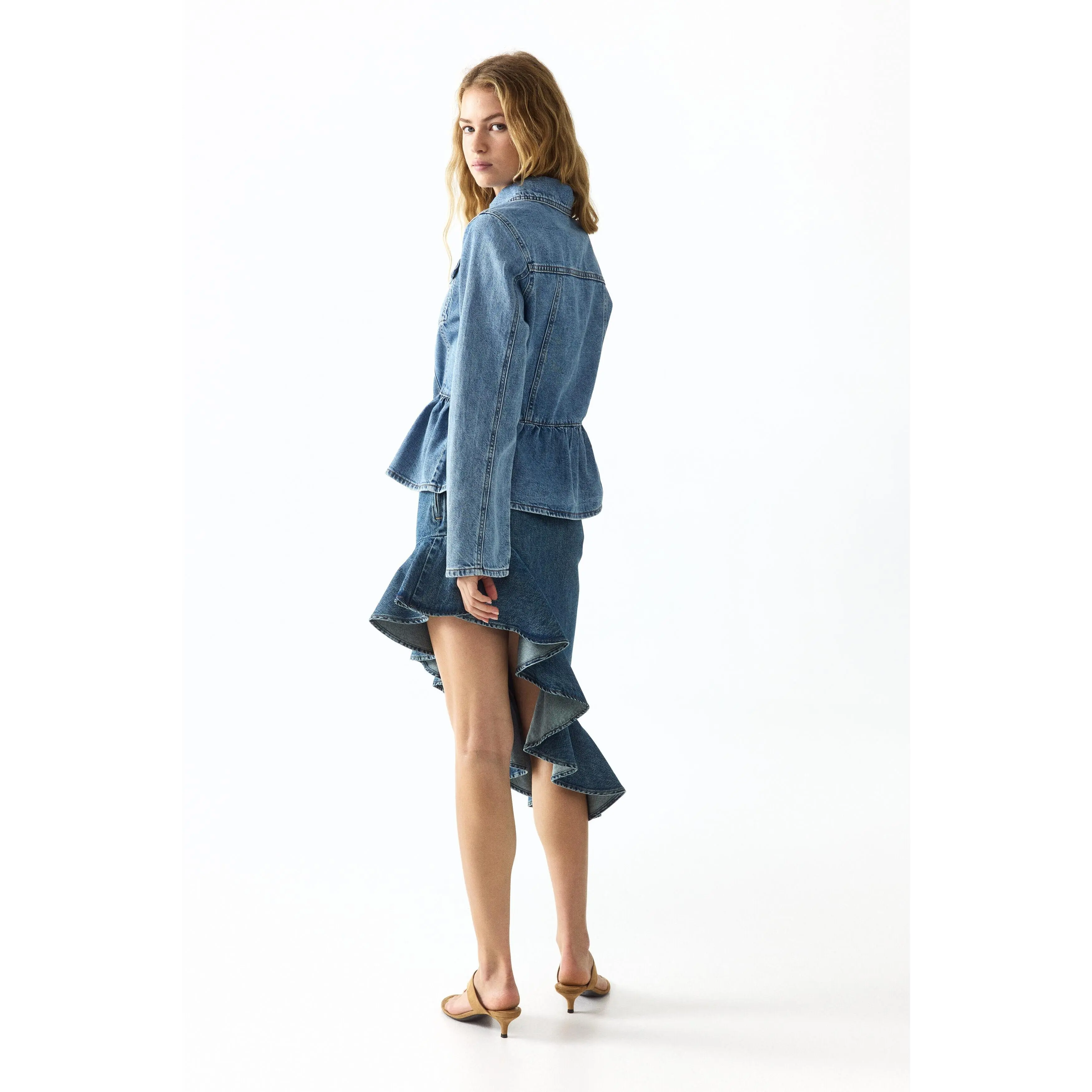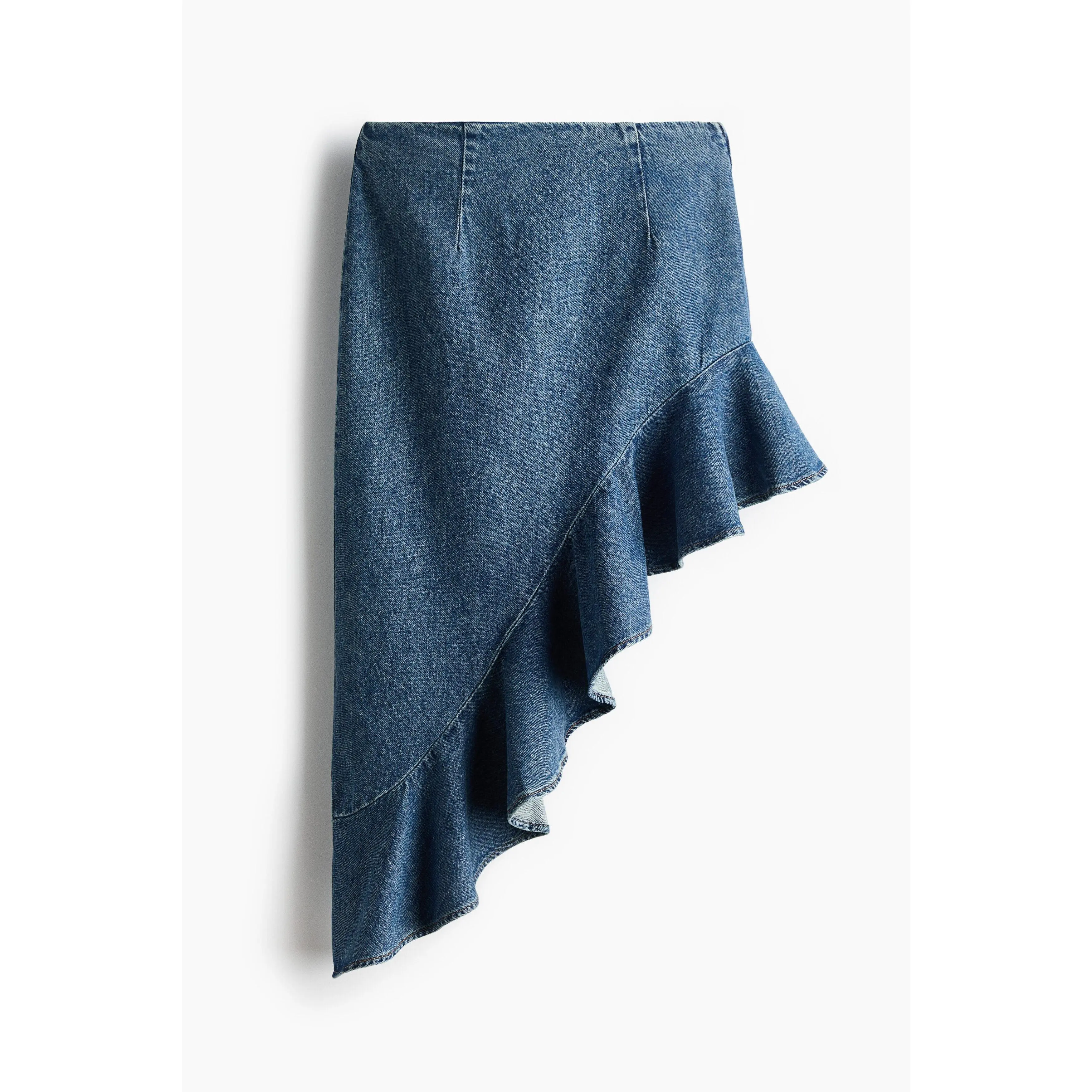 Calf-length skirt in rigid cotton denim featuring waist darts and a concealed zip and button at one side. Asymmetric, gently curved hem with a voluminous flounce.