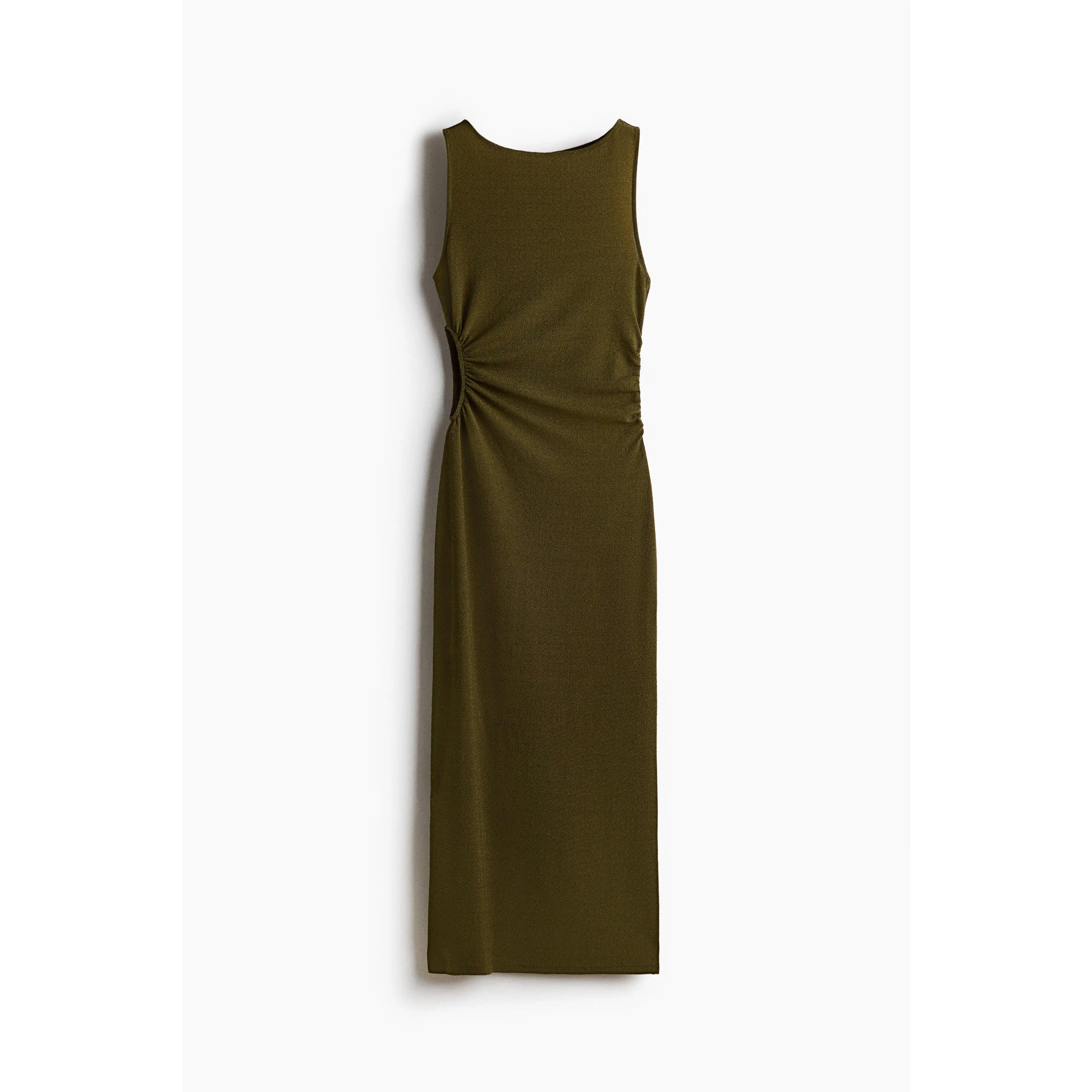 Long, sleeveless dress in stretch jersey containing glittery threads. Slim fit with a delicate boat neckline and gathers at one side of the waist and a gathered cut-out section at the other to create a gently draped effect.