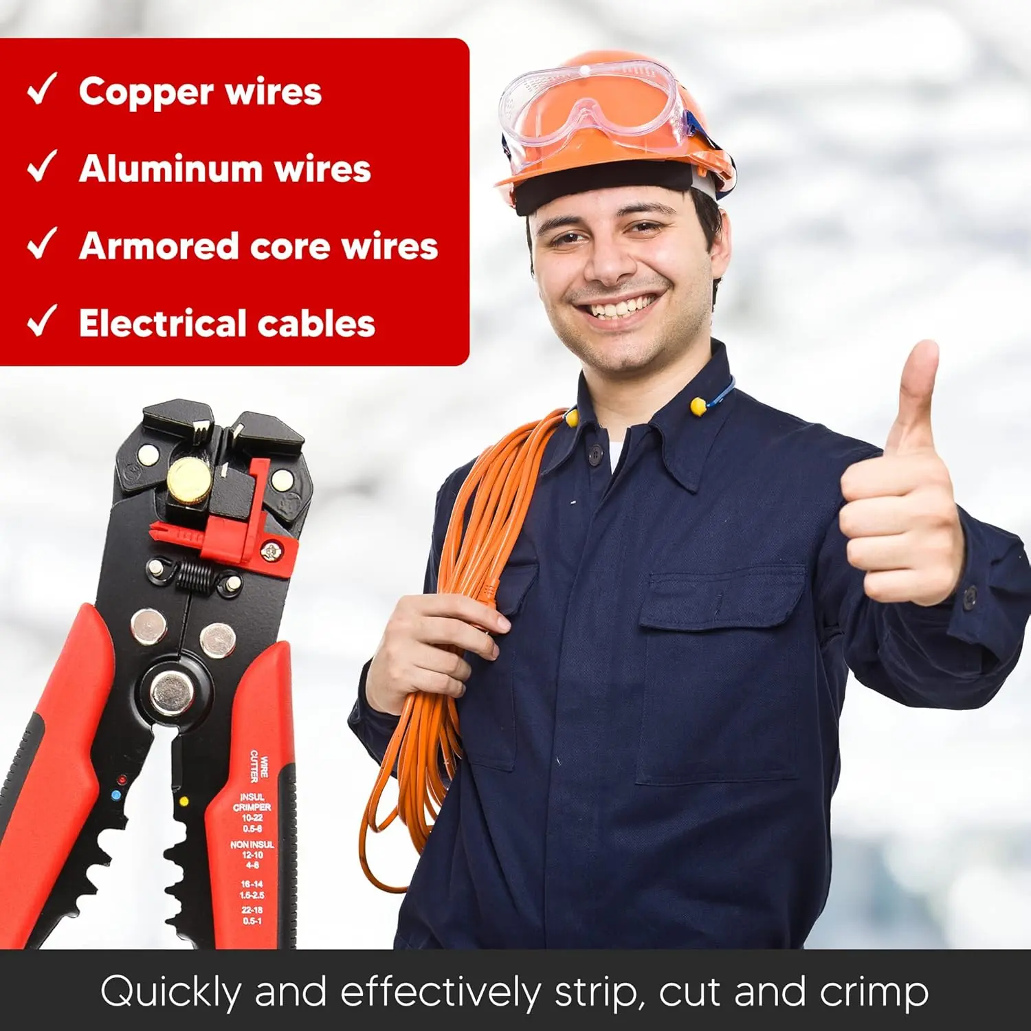 ·This self-adjusting wire stripper is very suitable for electricians, DIY, industrial and household use. Use it to strip, cut copper wires, aluminum wires, armored core wires, electrical cables and insulated terminals electrical crimping