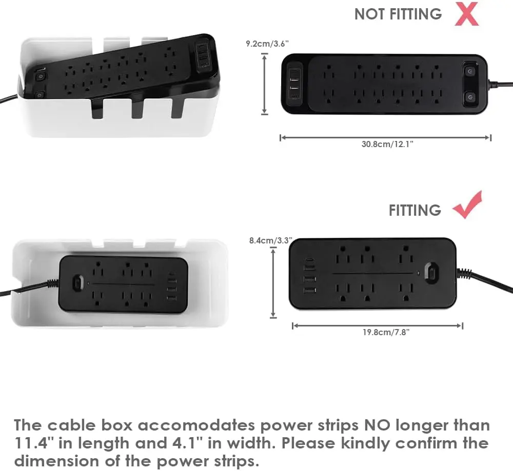 ·CHECK COMPATIBILITY FIRST: This cable box ONLY fits power strips under 11.4" L x 4.1" W. Please measure your power strip before purchasing to ensure a proper fit.
