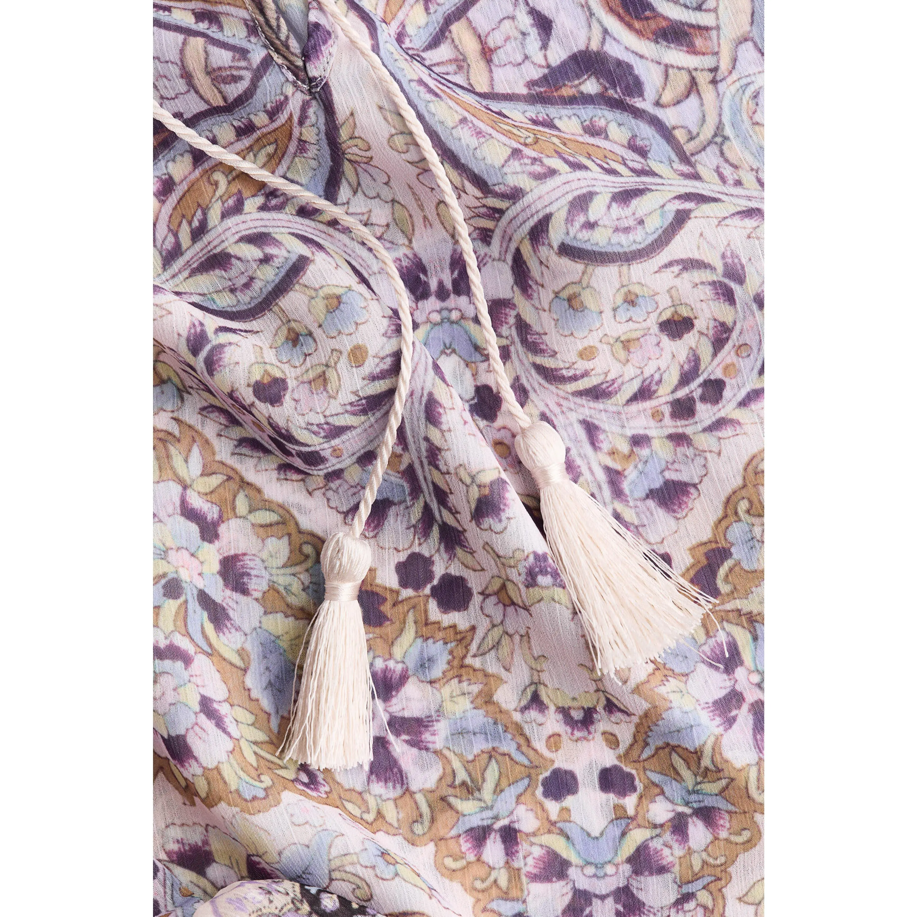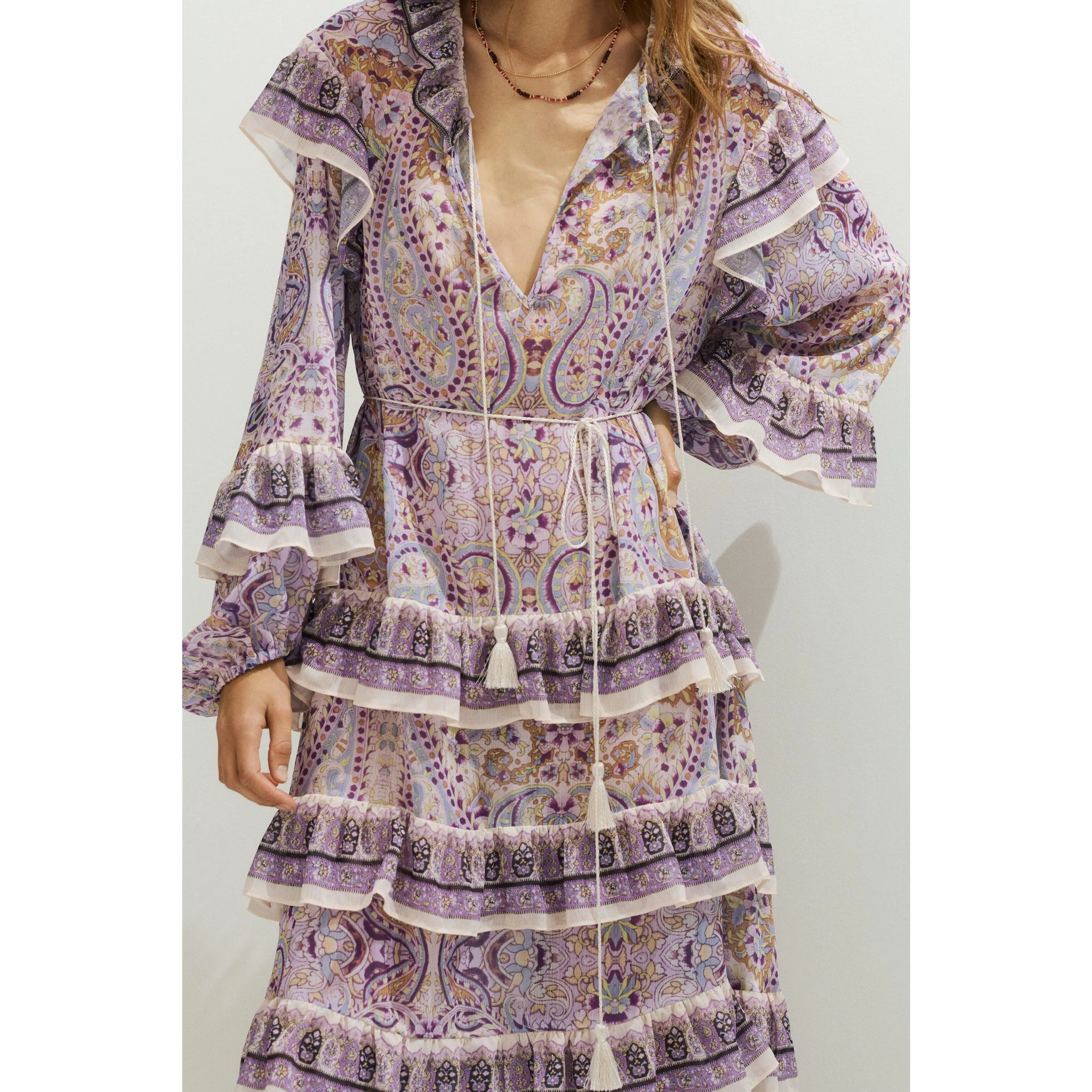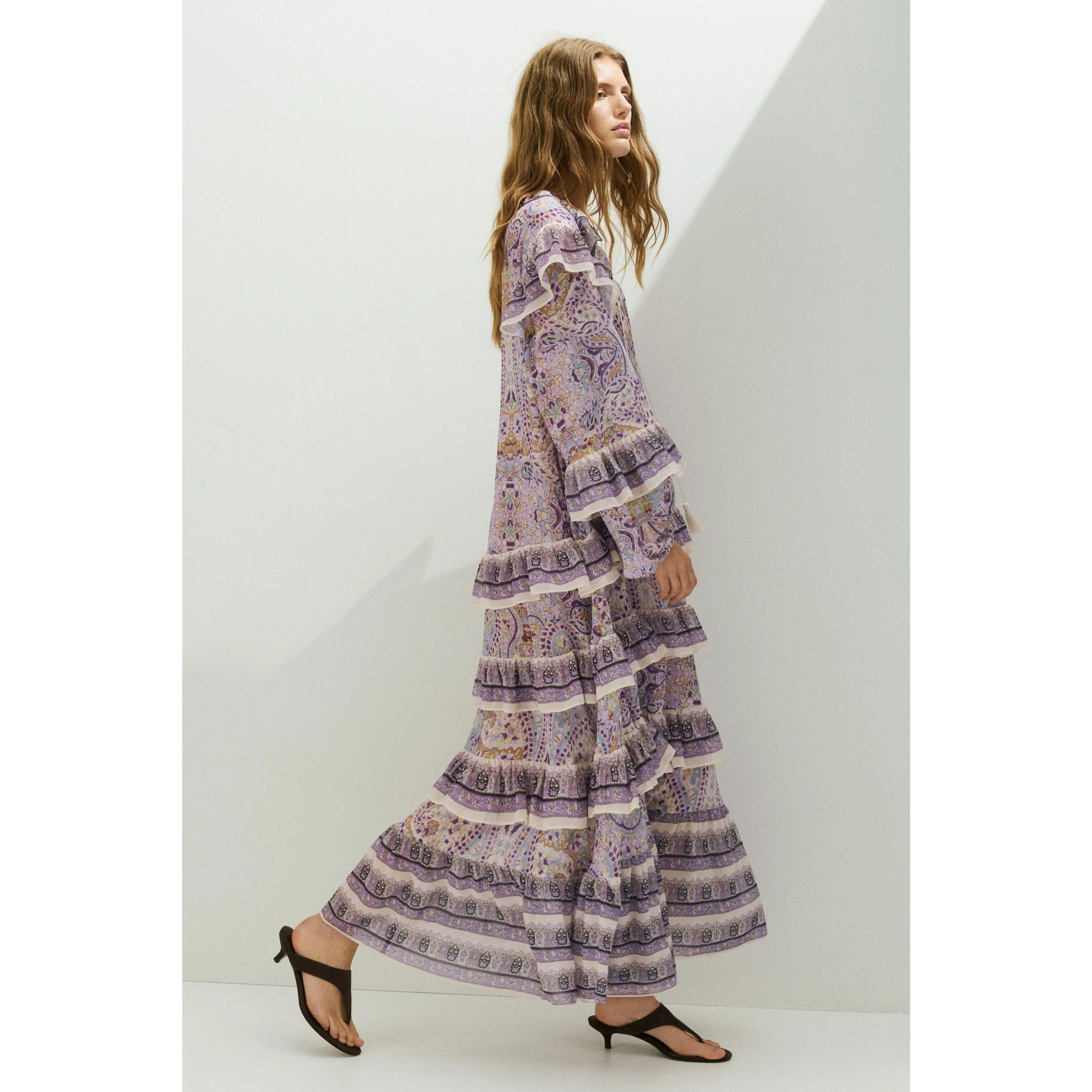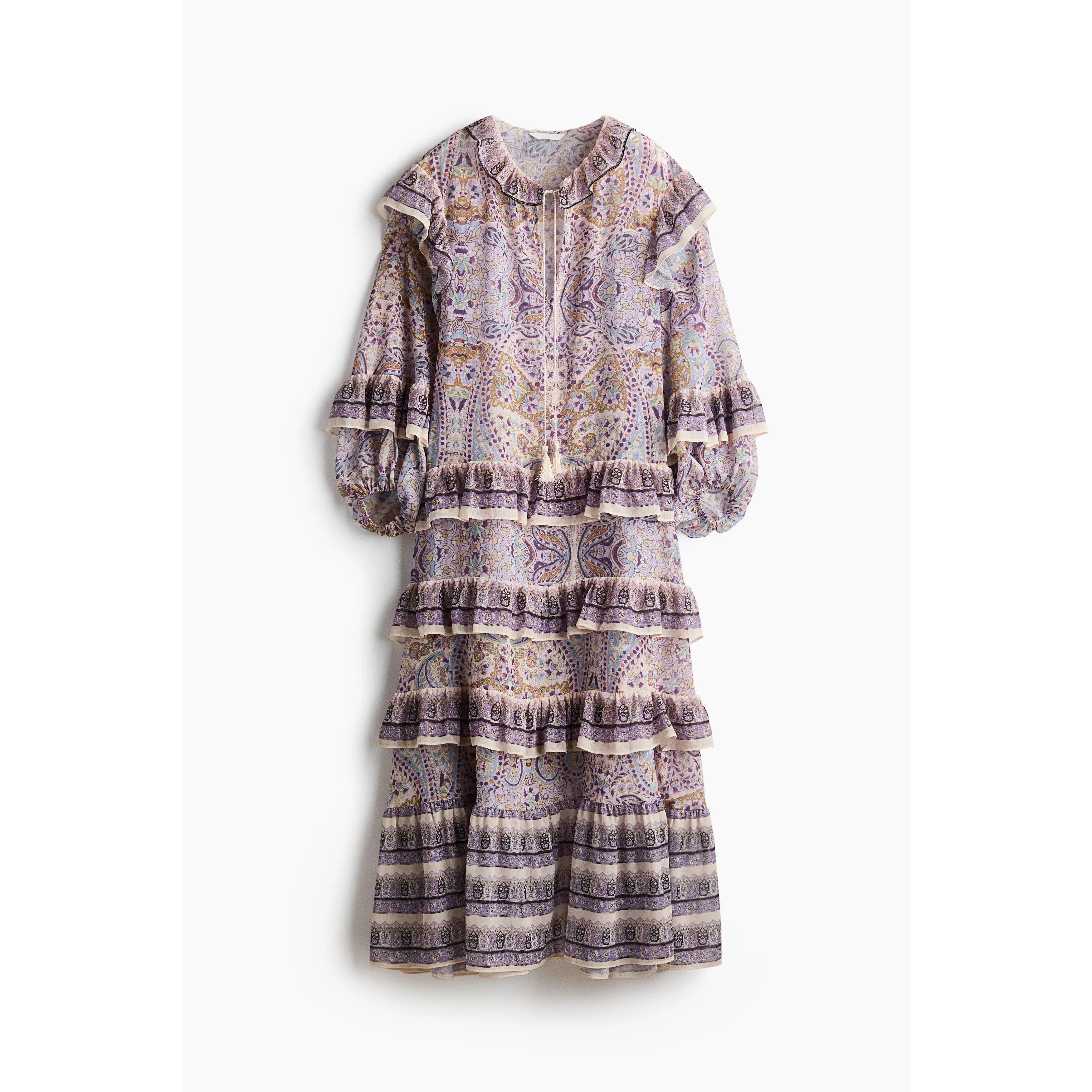 Long, A-line dress in a crinkled weave. Loose fit with a round neckline featuring a V-shaped opening at the front, dropped shoulders and long balloon sleeves with elasticated cuffs. Narrow ties with tasselled ends at the neckline and waist. Wide flounces around the neckline, over the shoulders and on the sleeves and skirt with flounced tiers. Unlined.