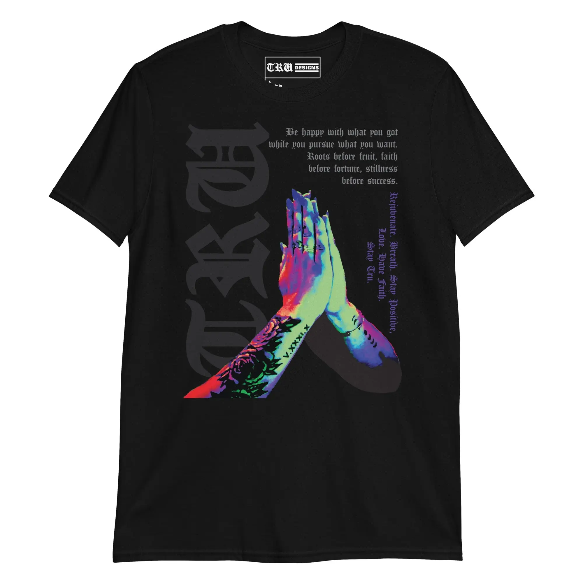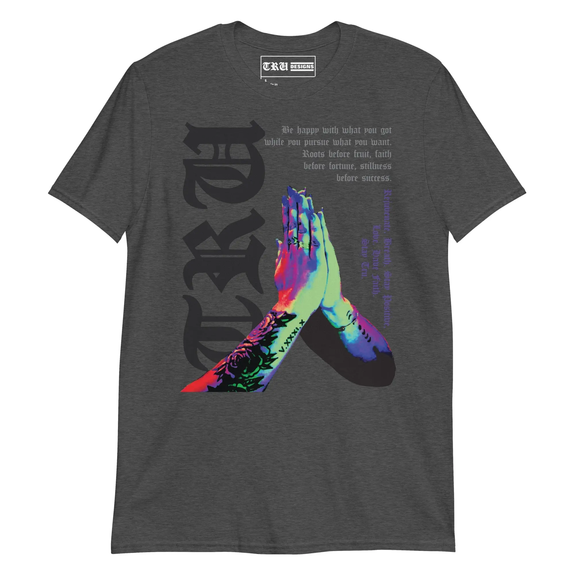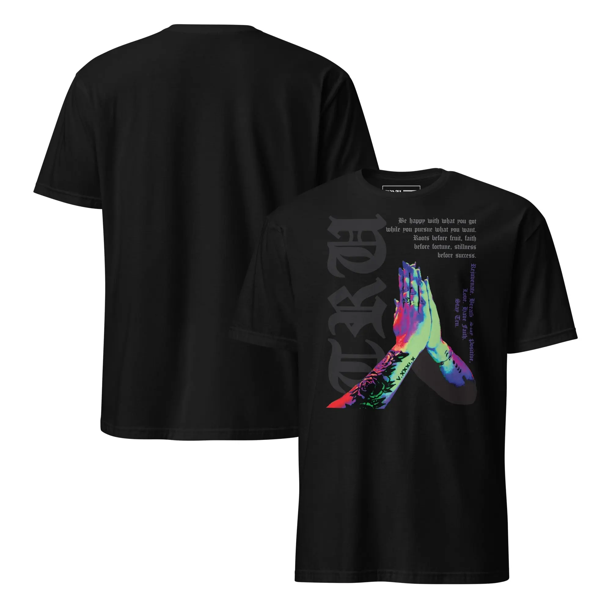 This isn't just a t-shirt—it’s a daily reminder of the mindset required for the creative journey. Featuring a striking, multi-color graphic of tattooed praying hands, this design is overlaid with a powerful message of resilience: "Roots before fruit, faith before fortune, stillness before success."