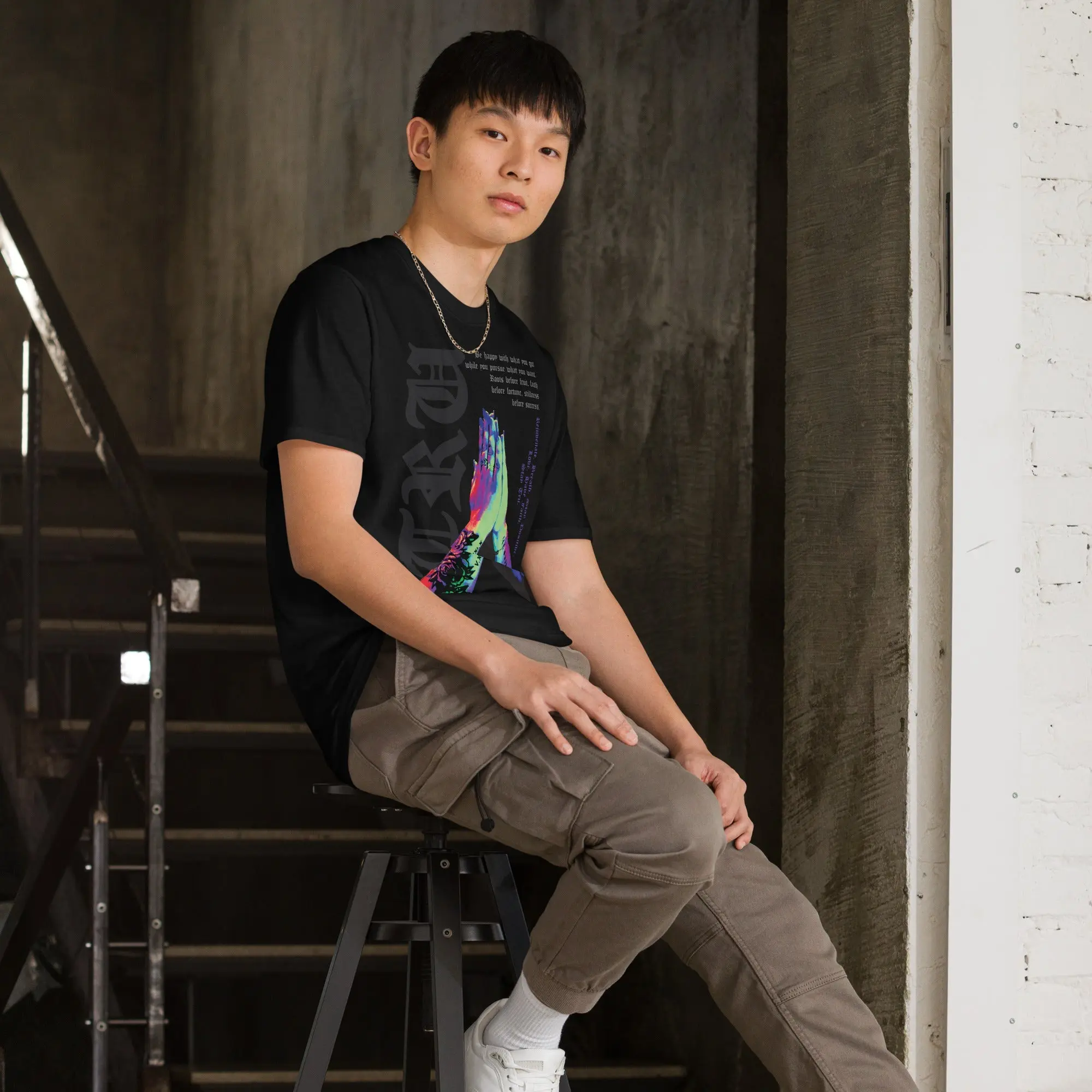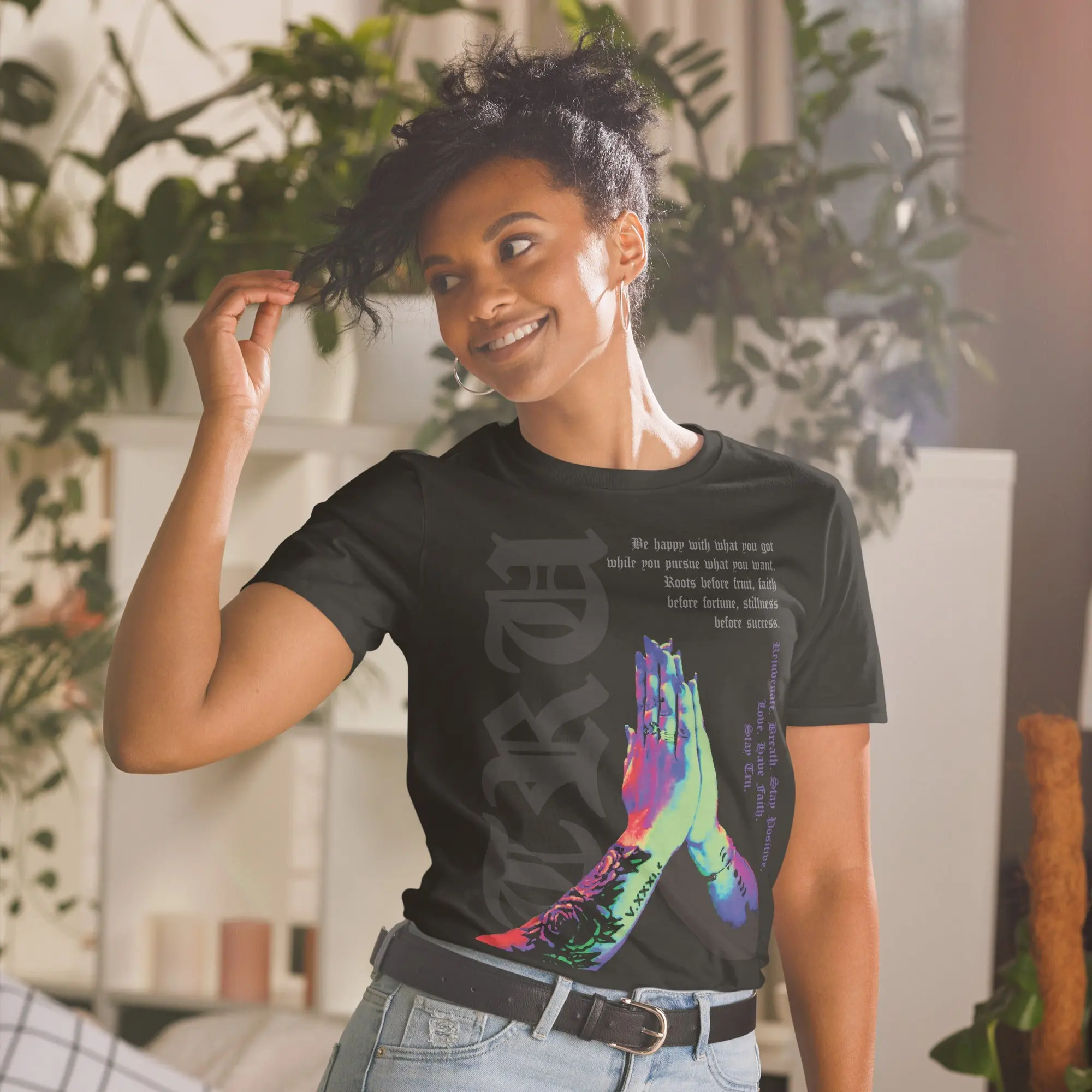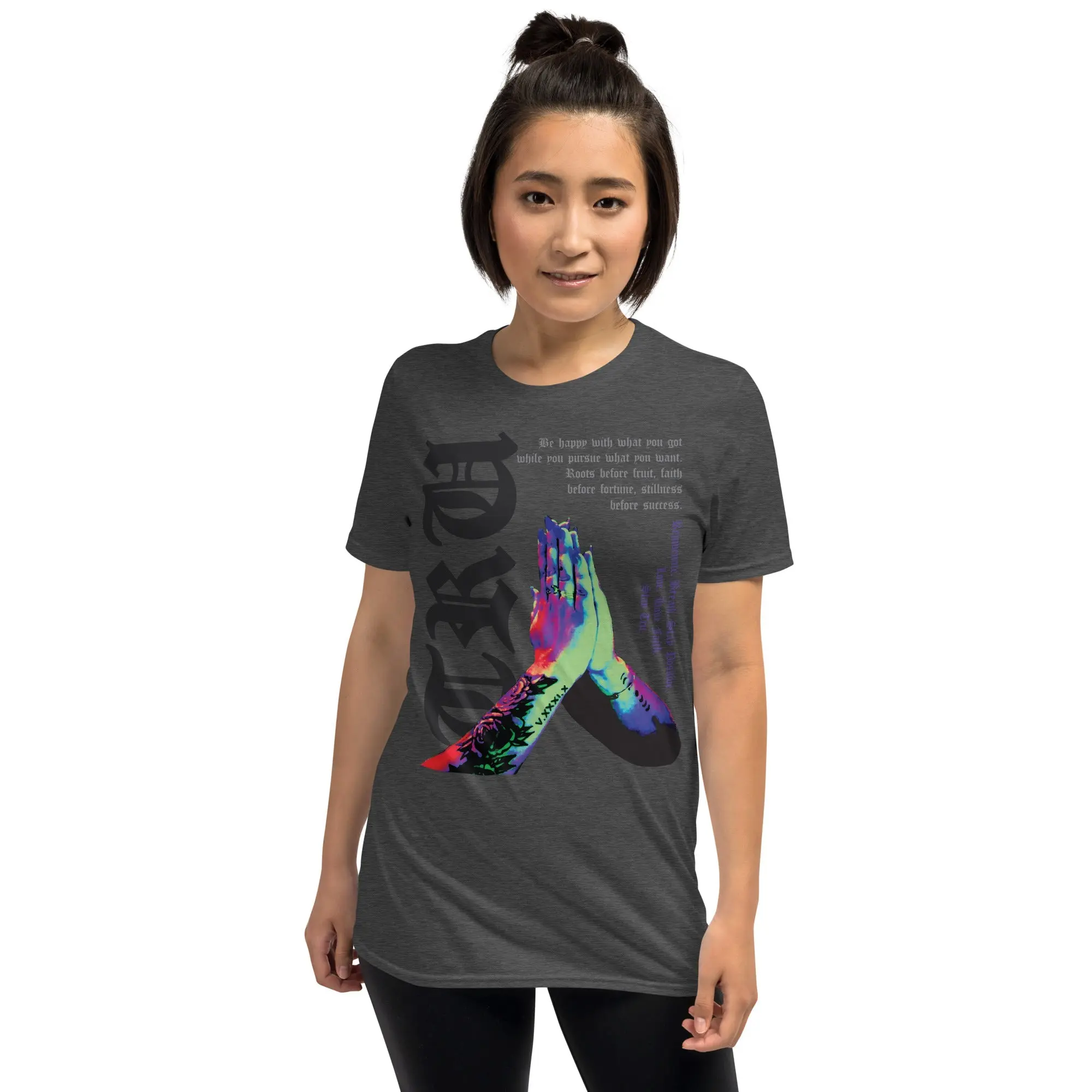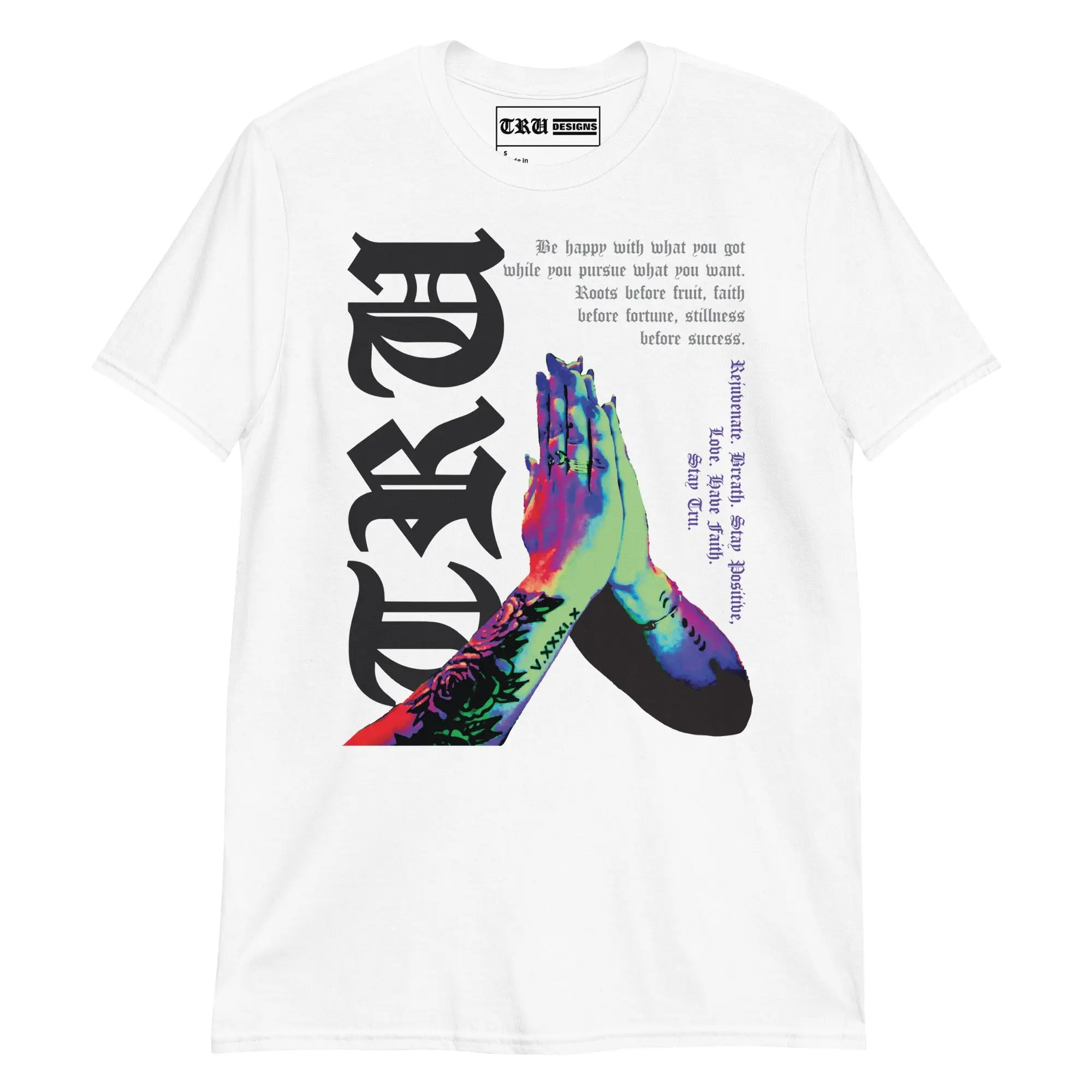 This isn't just a t-shirt—it’s a daily reminder of the mindset required for the creative journey. Featuring a striking, multi-color graphic of tattooed praying hands, this design is overlaid with a powerful message of resilience: "Roots before fruit, faith before fortune, stillness before success."