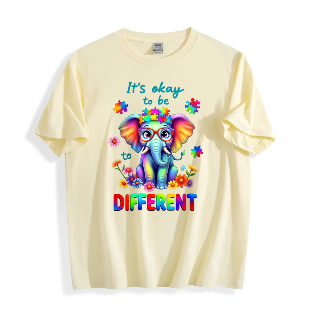 Colorful Elephant Design Unisex T-Shirt It's Okay To Be Different Message With Puzzle Pieces And Flowers For Autism Awareness Spring Summer Wear Perfect Gift For Kids Adults And Loved Ones With Special Needs