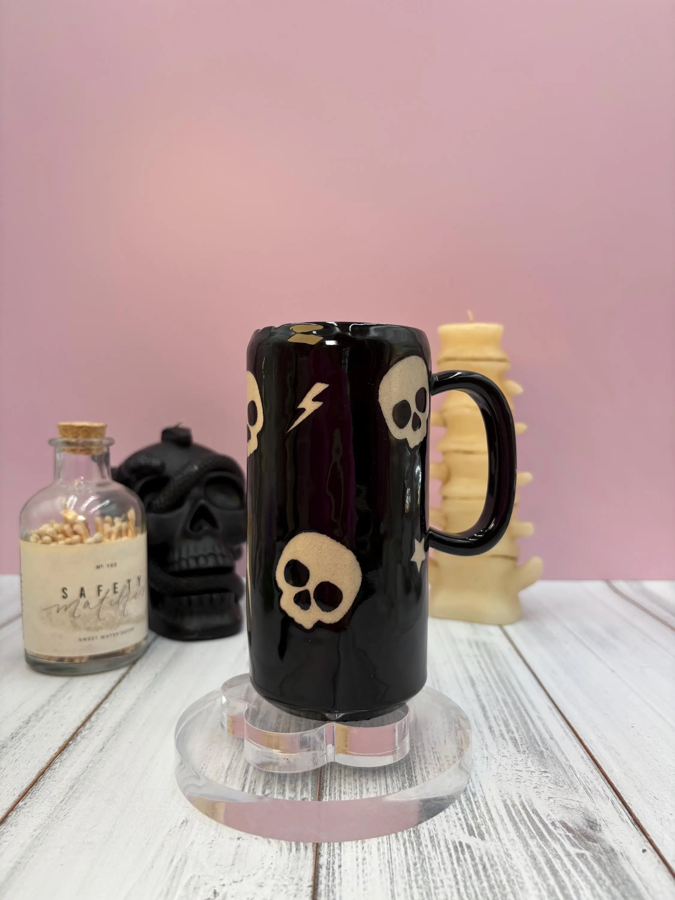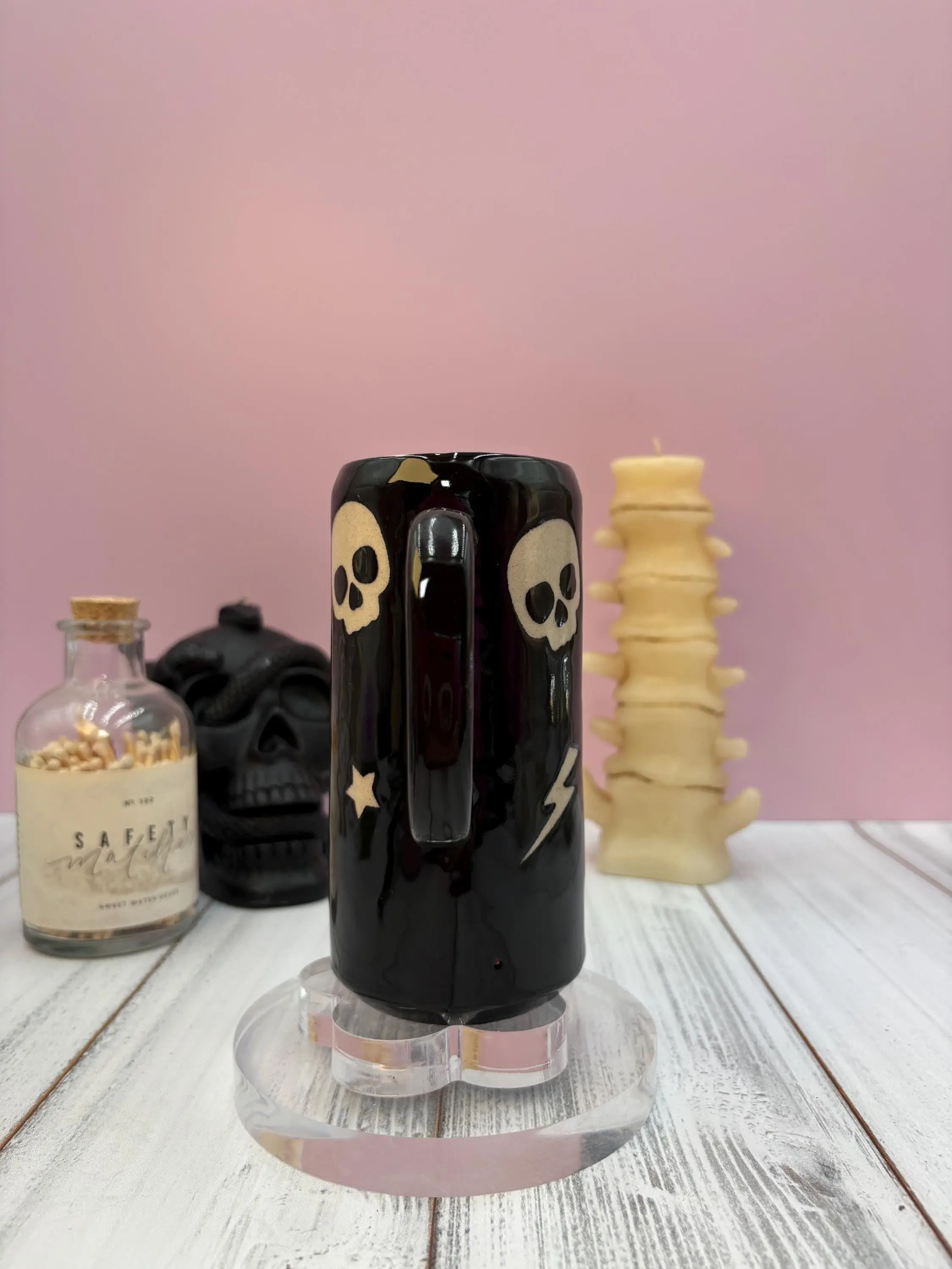 👻The Skulls are a clear cone 6 glaze with a black over glaze on top sealing the cone 6 stoneware underneath making the mug dishwater safe.