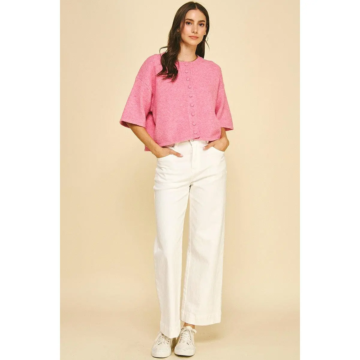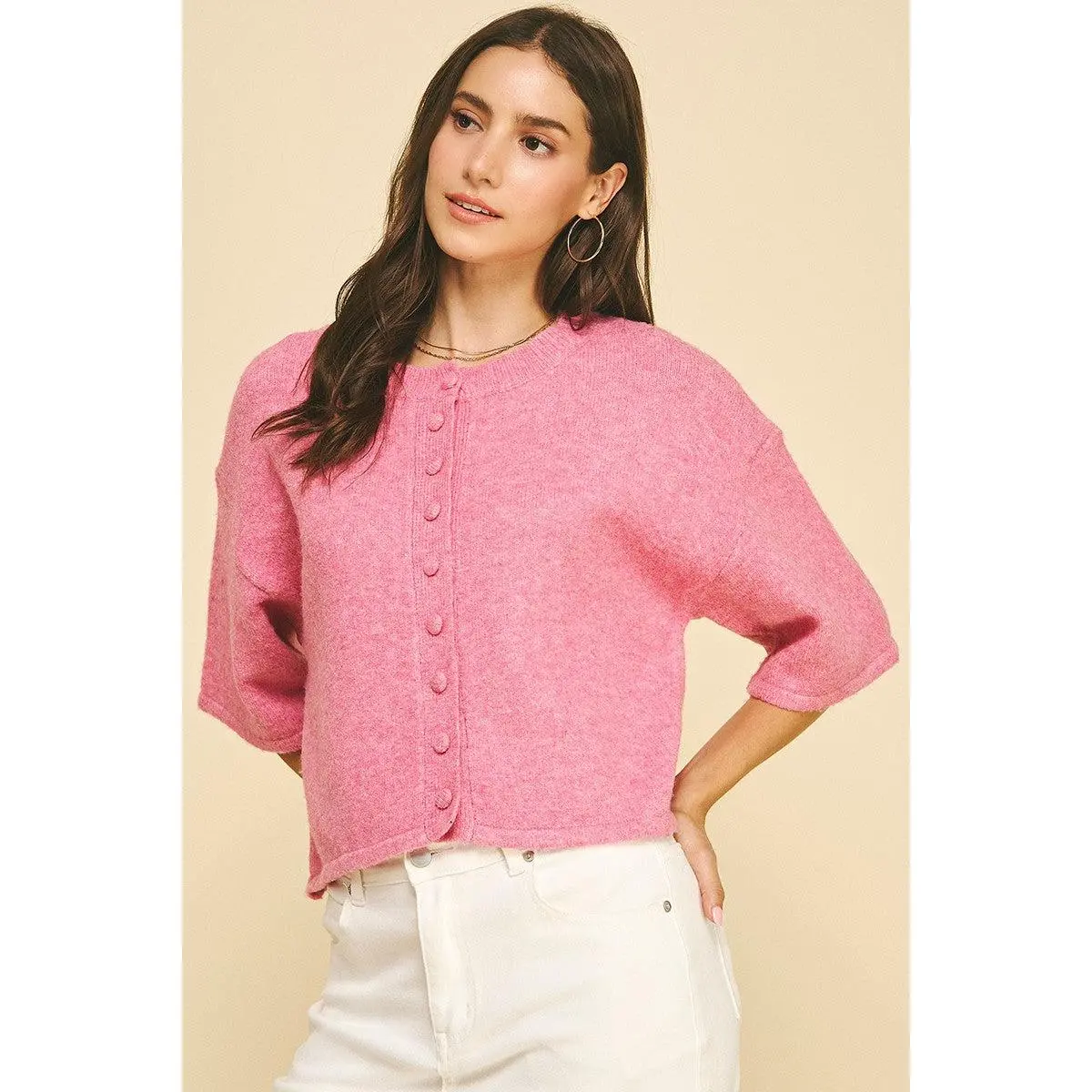 Effortless elegance meets everyday comfort in this classic button-down sweater. Featuring a timeless round neckline and short sleeves, it's designed with a relaxed comfort fit that moves with you throughout your day. The soft construction and versatile silhouette make it perfect for layering or wearing solo. Model pictured wears size small.