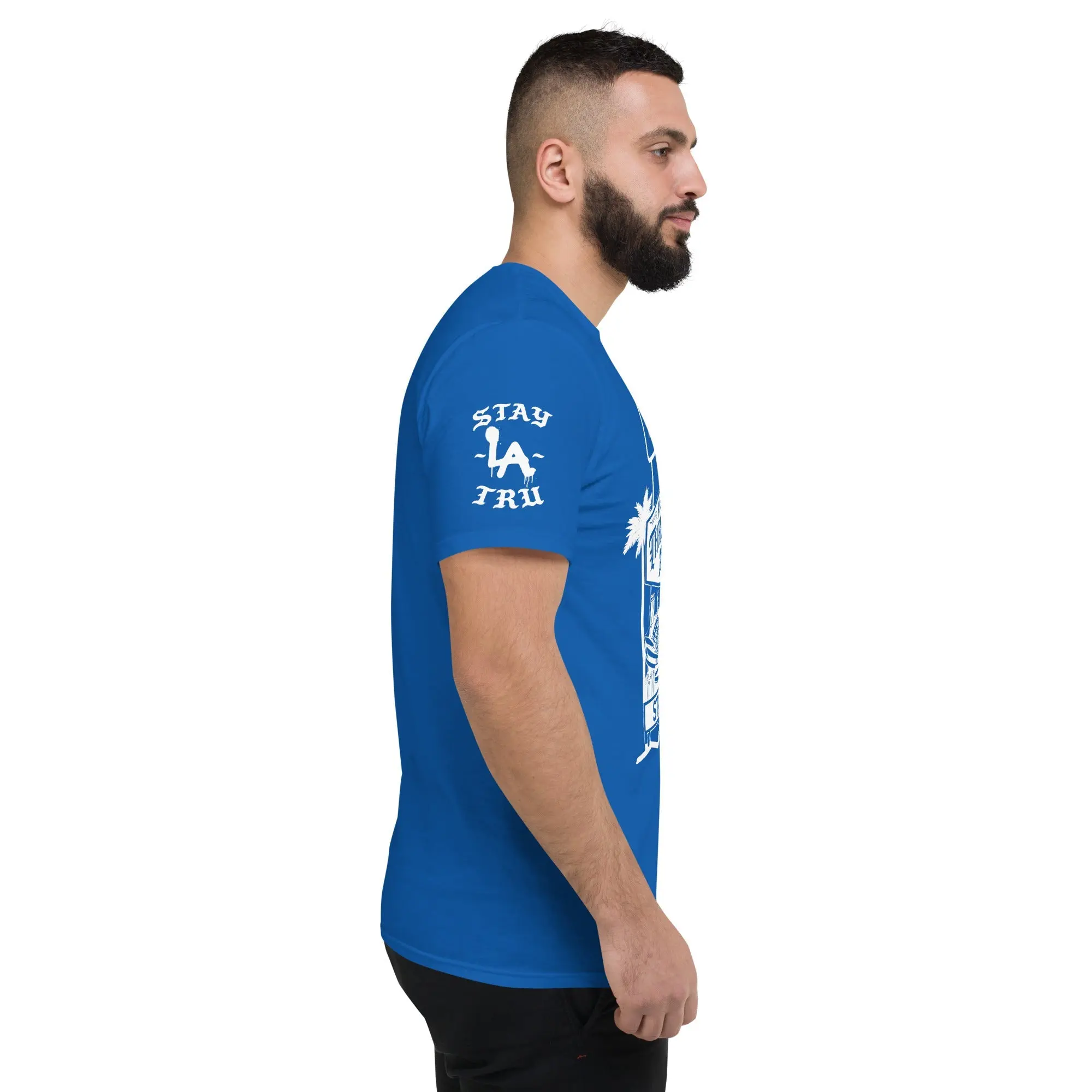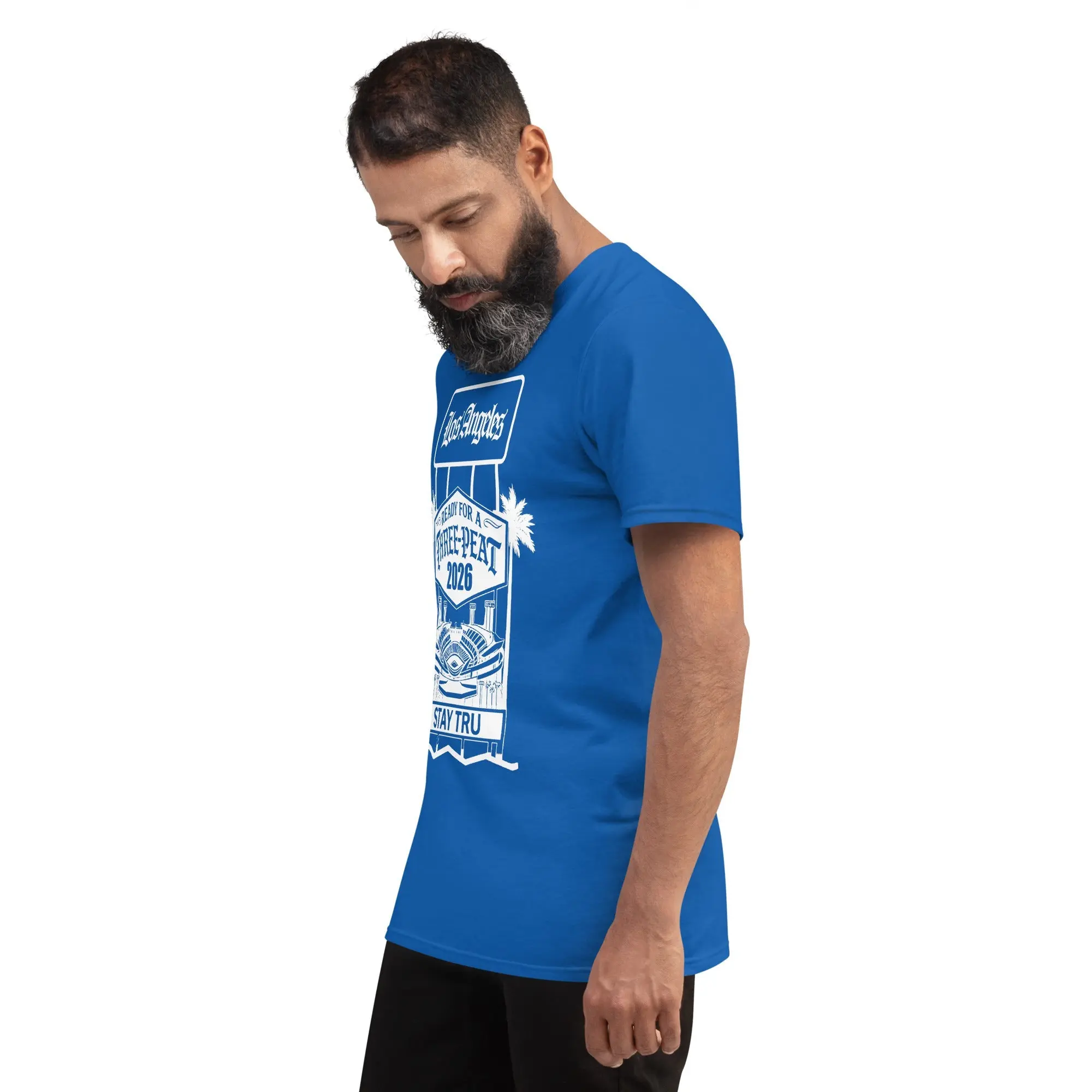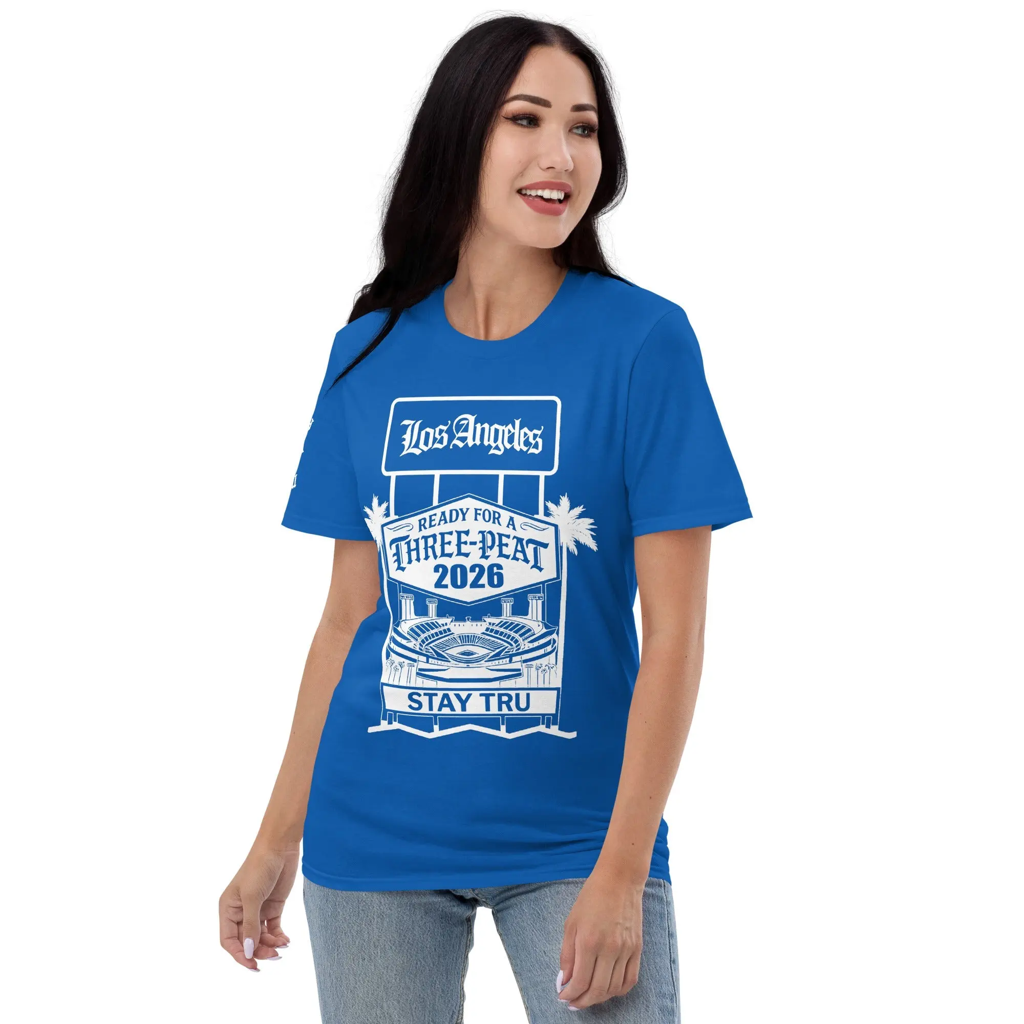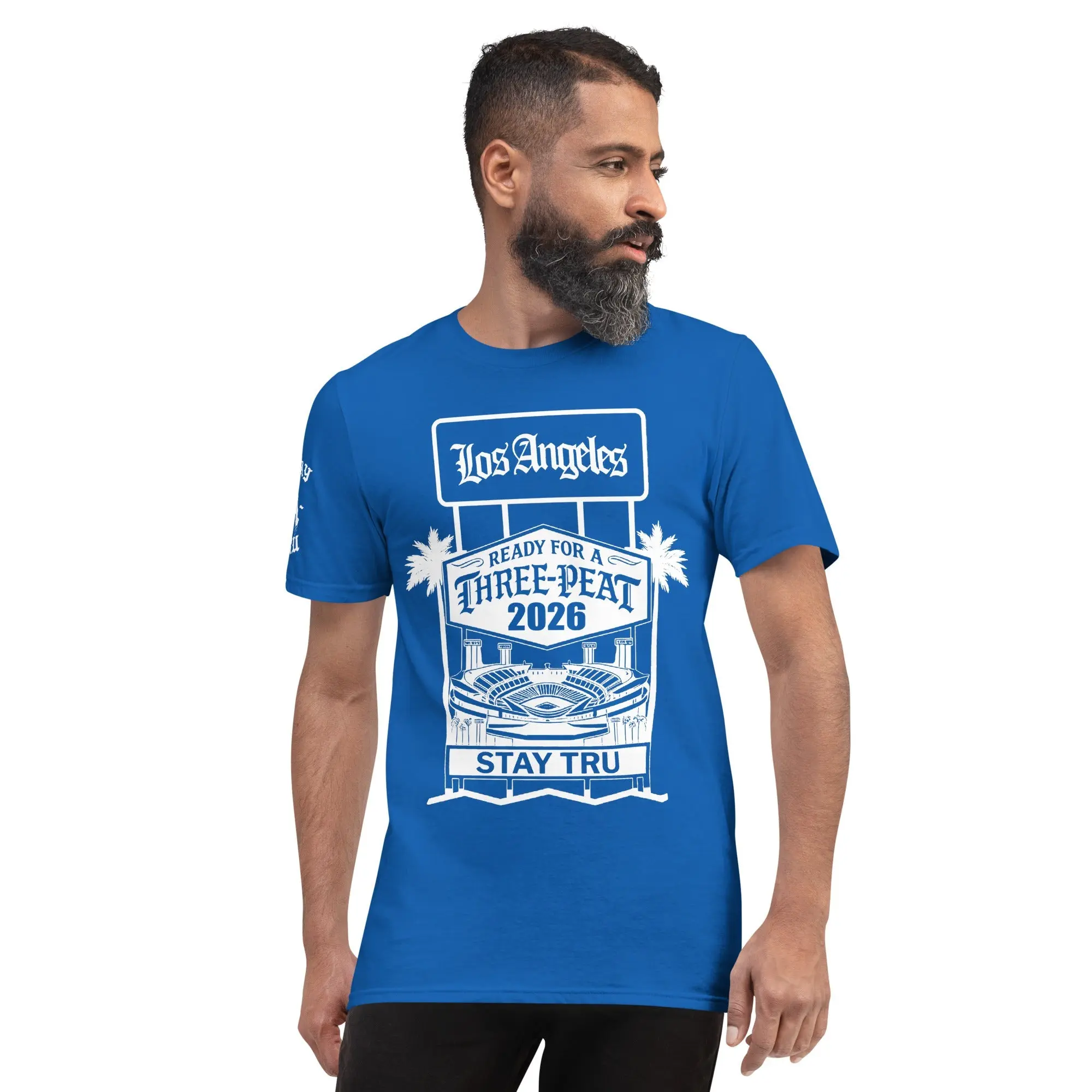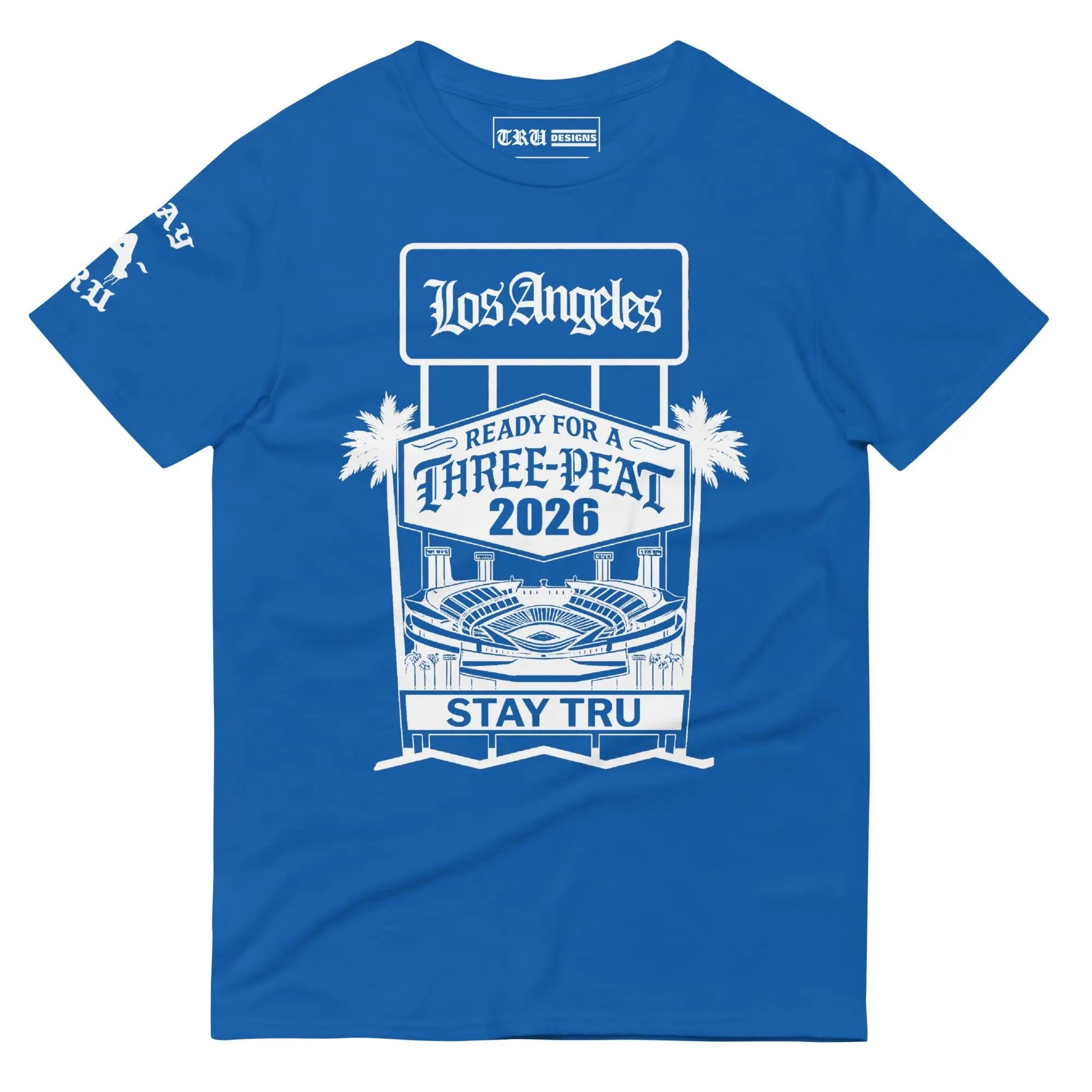 There is no rhythm like the heartbeat of Blue Heaven. Designed for the die-hard fans who bleed blue from the Ravine to the Valley, this royal blue tee celebrates the pursuit of the legendary three-peat. Featuring a custom "Stay Tru" stadium graphic and iconic LA palm trees, this design captures the electric energy of a championship summer in the city.