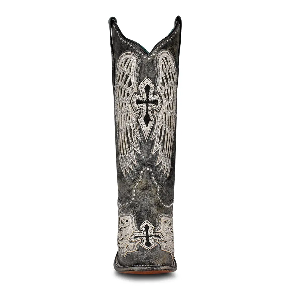 These Corral black cross & wings overlay boots are crafted from genuine premium leather with striking white cross and wing embroidery and stud accents for a bold, standout look. Featuring a classic square toe silhouette and premium handcrafted quality, they deliver versatile Western style and refined character that elevate both casual and dressier outfits.