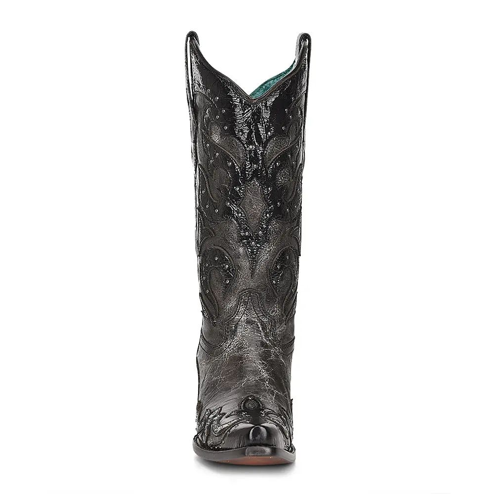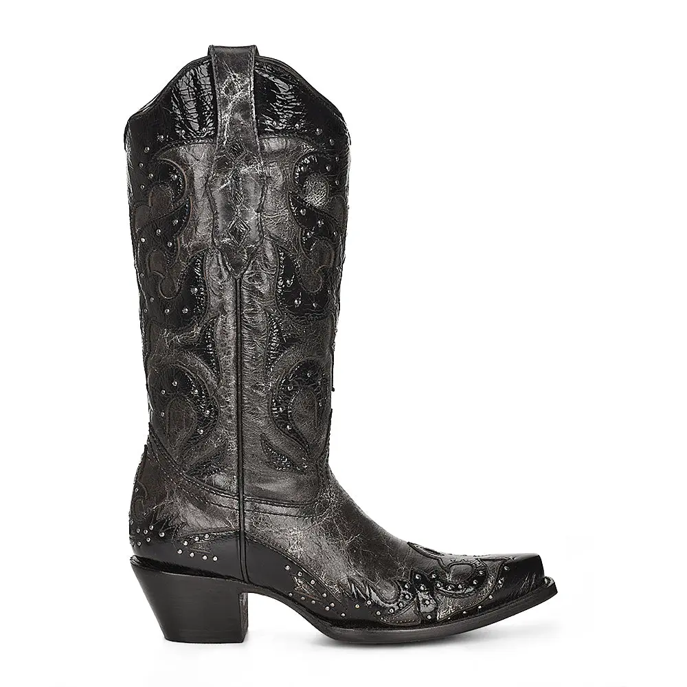 These Corral boots are crafted from genuine premium black leather with distinctive overlay panels, detailed embroidery, and stud accents for a bold, stylish finish. Designed with a classic wing tip silhouette and quality handcrafted construction, they deliver standout character and versatile wearability that elevates both casual and dressier outfits.