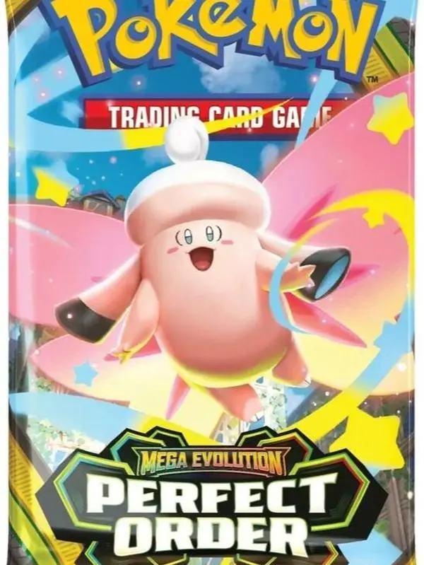The Pokémon TCG: Mega Evolution—Perfect Order expansion (launched March 27, 2026) booster packs contain 10 cards, 1 basic energy, and 1 code card for TCG Live. Centered on Mega Zygarde ex, Mega Clefable ex, and Mega Starmie ex, these packs are available in individual blisters, 6-pack bundles, and 36-pack booster