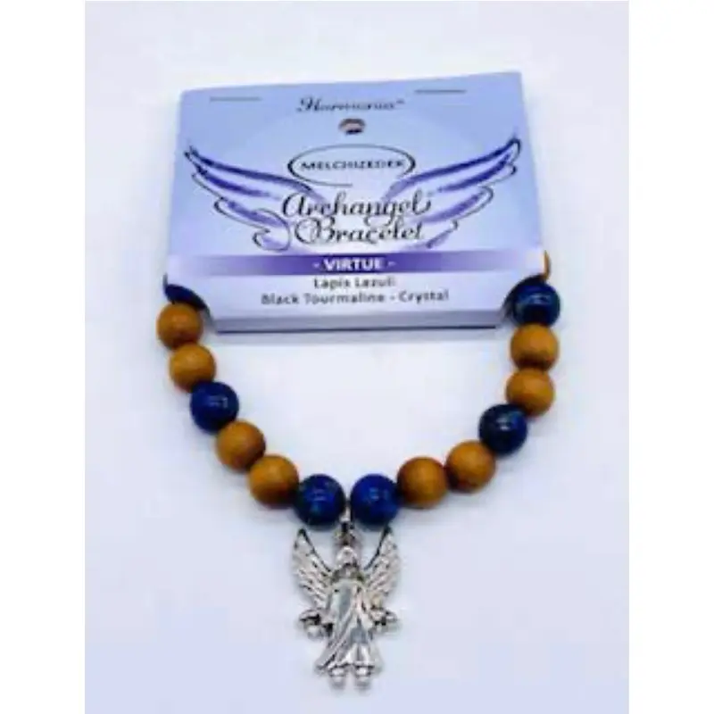 Archangel Melchizedek beaded bracelet for virtue. This bracelet is made with wooden beads, Lapis Lazuli beads, Quartz crystal beads and a single Black Tourmaline bead. Complete with a Melchizedek Archangel hanging charm. 8mm