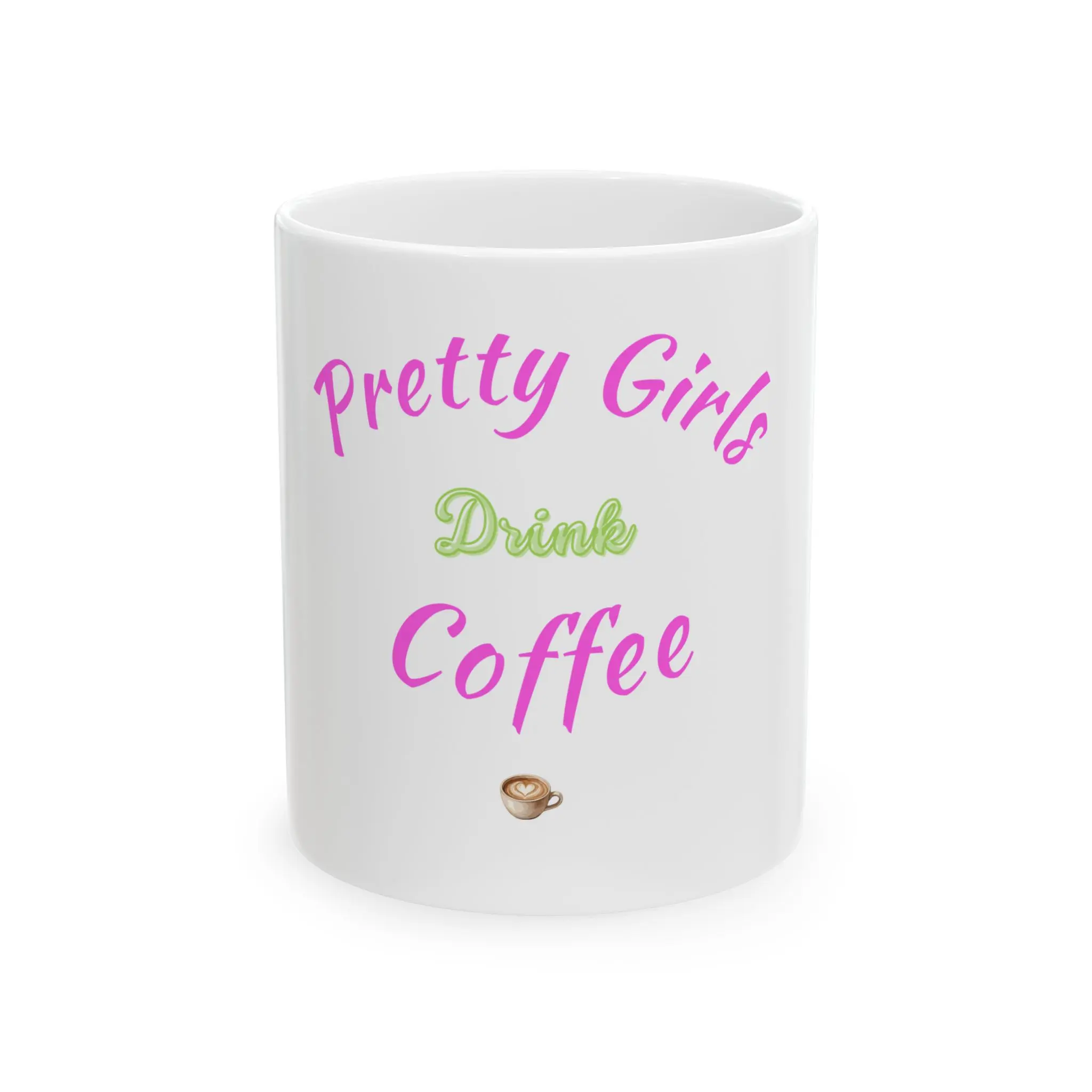 Pretty Girls Drink Coffee Mug White Ceramic 11 oz Glossy Microwave Dishwasher Safe Comfortable C-handle Vibrant Print - Drinkware. Start your morning with a little charm and a lot of caffeine. The Pretty Girls Drink Coffee Mug is a fun, feminine mug designed for coffee lovers who want their daily routine to feel a little more stylish. Featuring a playful pink and green design, this mug adds personality to your coffee bar, desk, kitchen shelf, or gift basket.