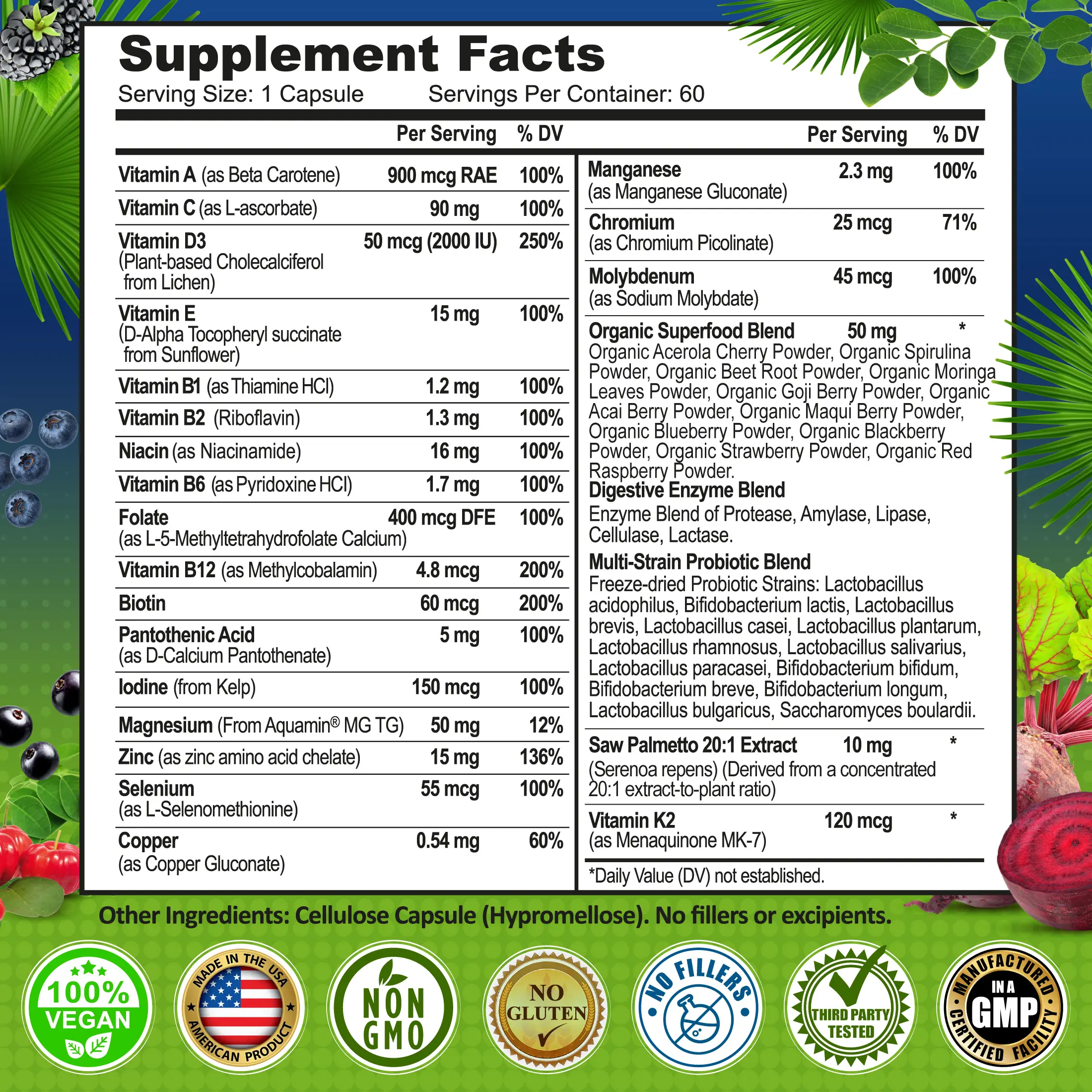 ·Complete Daily Nutrient Support – Includes essential vitamins and minerals like A, B-Complex, C, D3, K2, and E, plus Biotin, Zinc, Magnesium, Selenium, and Folate to support overall health.
